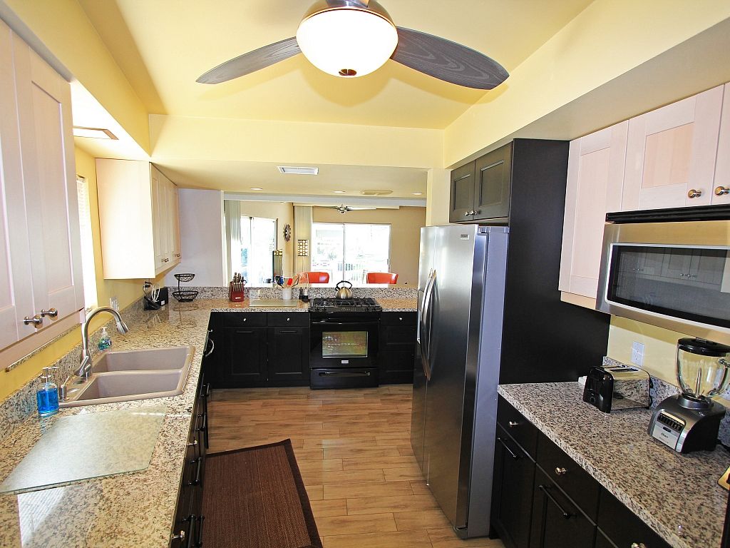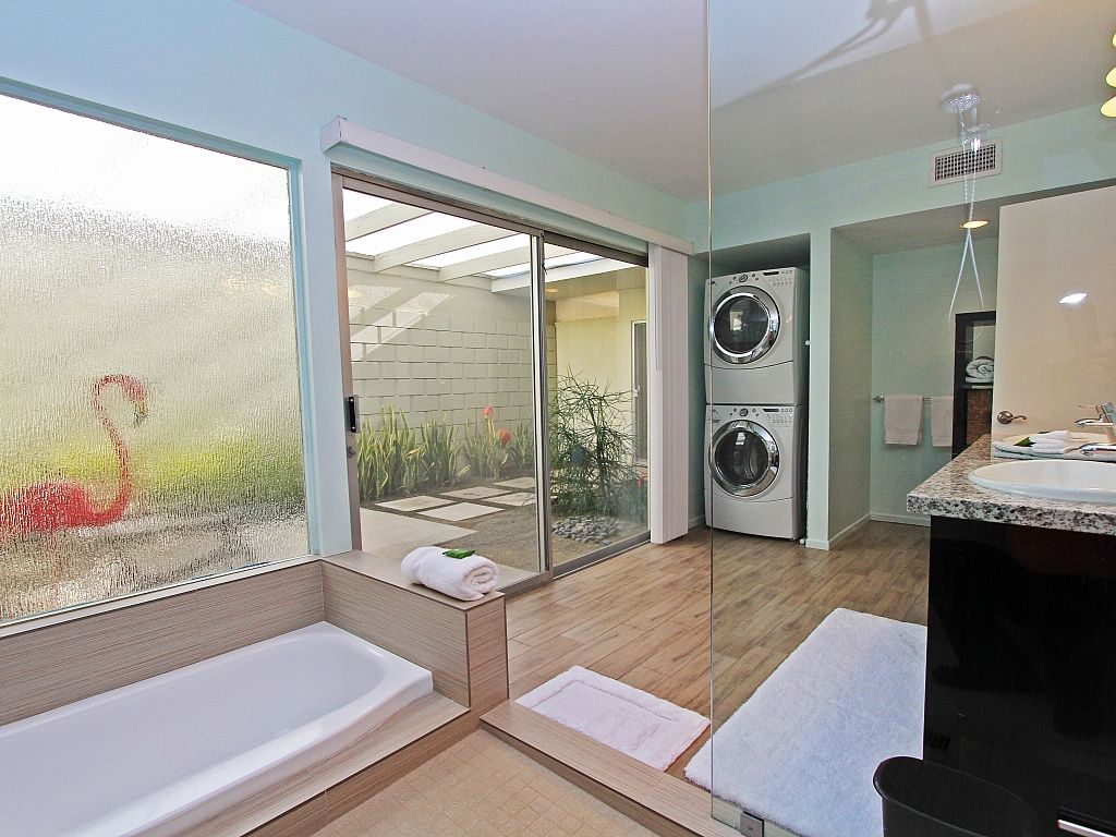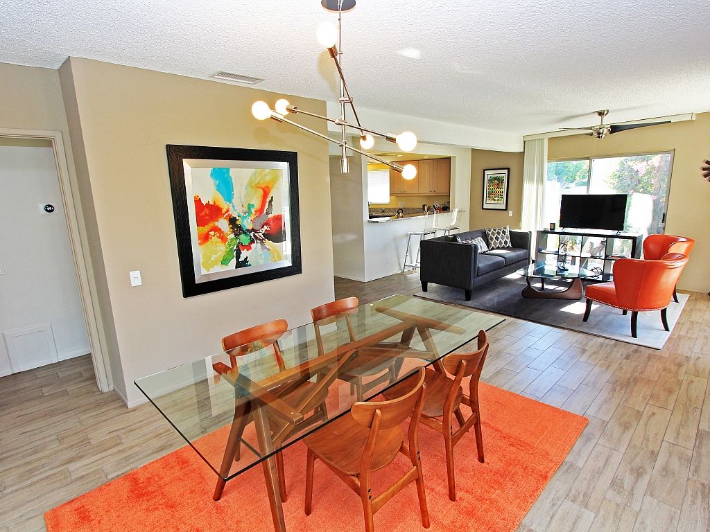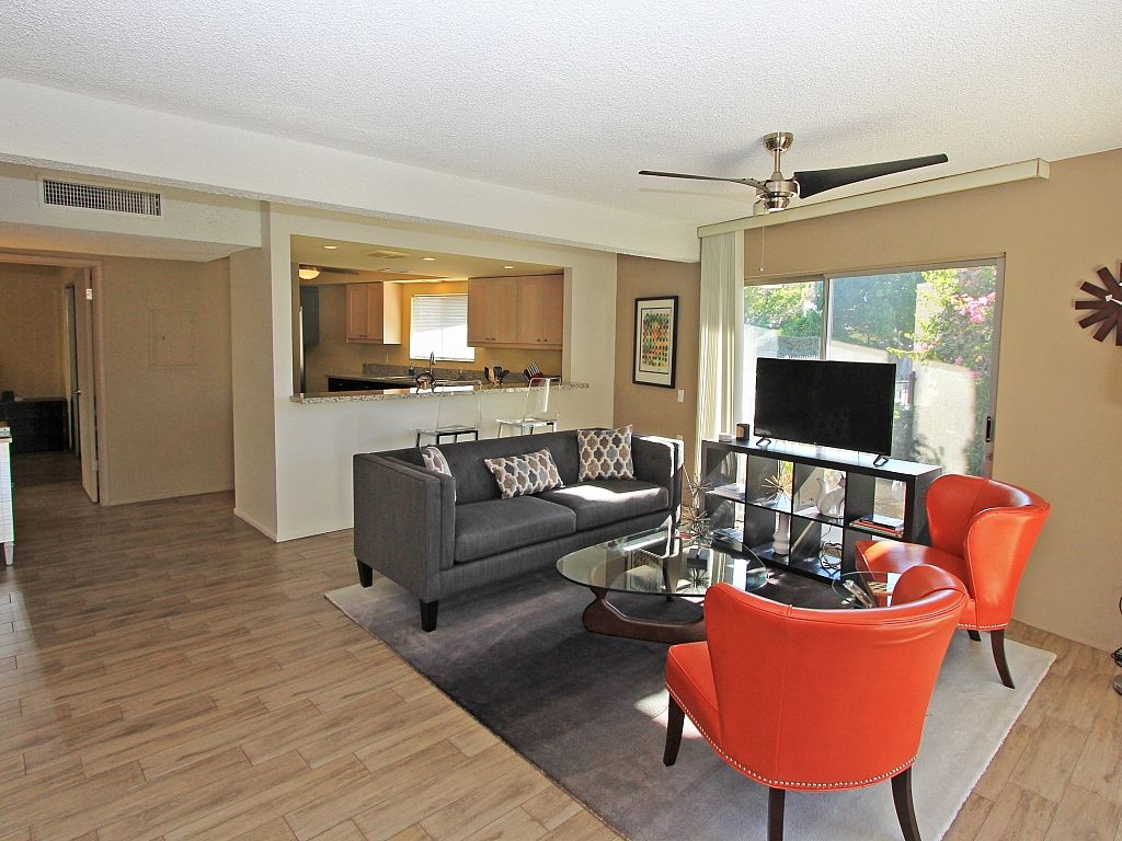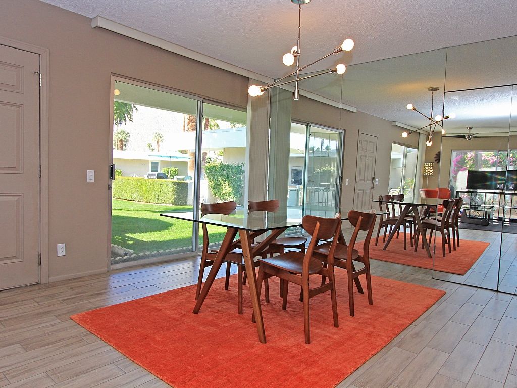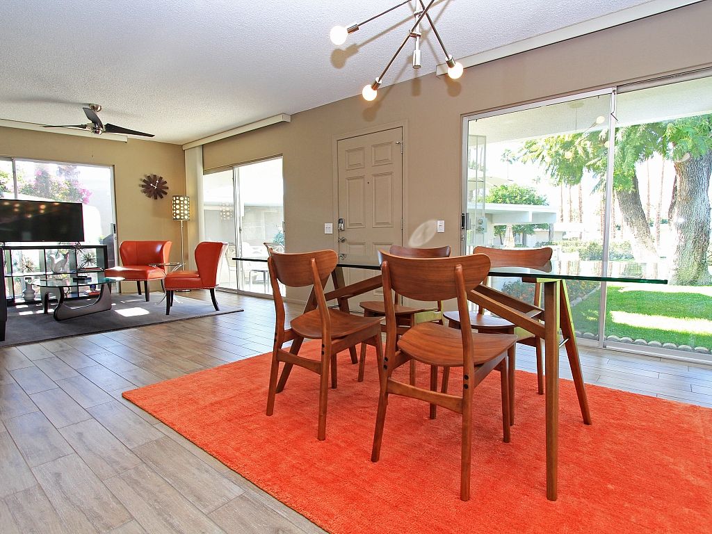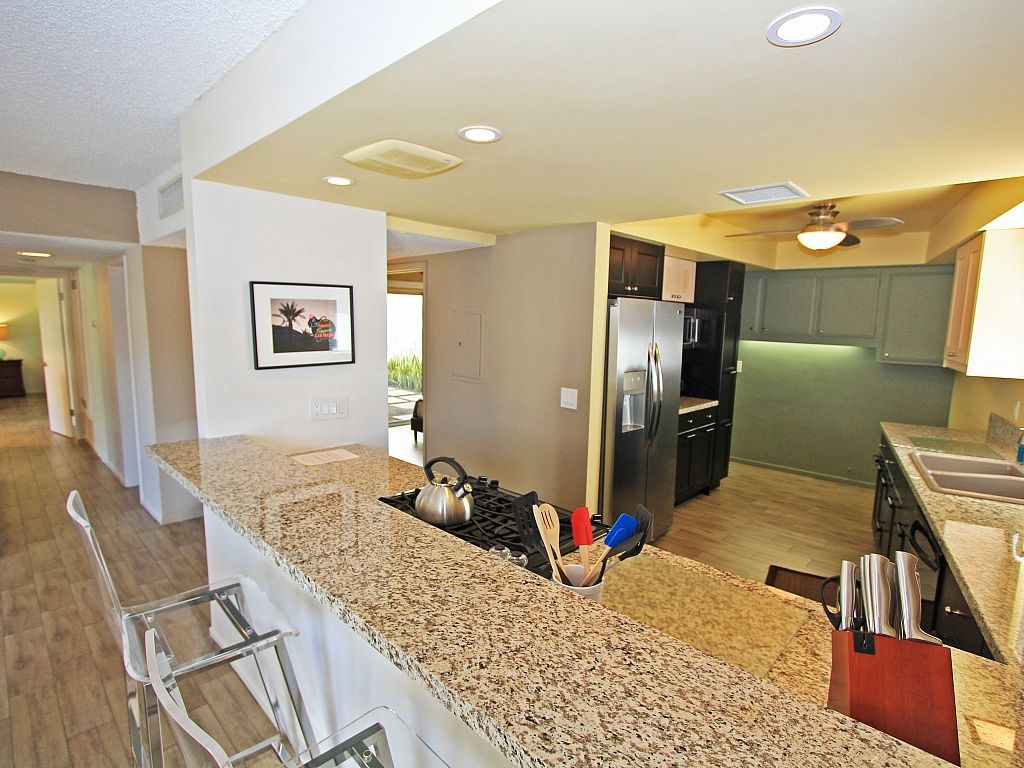 With 1429 square feet of living space, the spacious living room is open to the dining room and offers plenty of space for enjoying time with friends and family. The fully equipped kitchen in this Palm Springs rental has everything you need to cook gourmet meals for you and your guests.