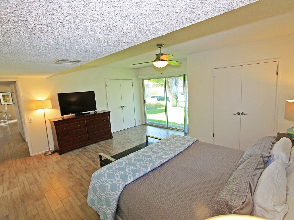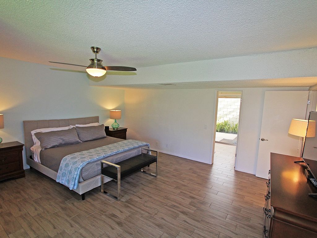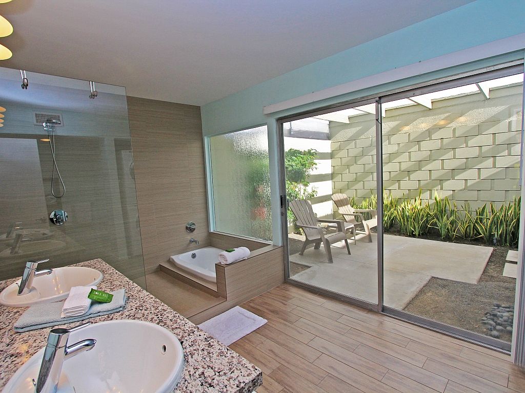 The master suite features a king size bed, a 50"" HDTV and a large en-suite bathroom with shower and tub. You also have direct access to a private atrium off the master bathroom. The guest bedroom features a queen size bed, and also share access to the atrium through glass sliders. Each bed is comfortably decorated with stylish, cozy bedding for a peaceful and relaxing night's sleep.