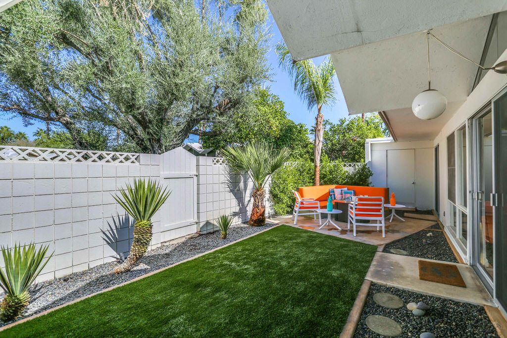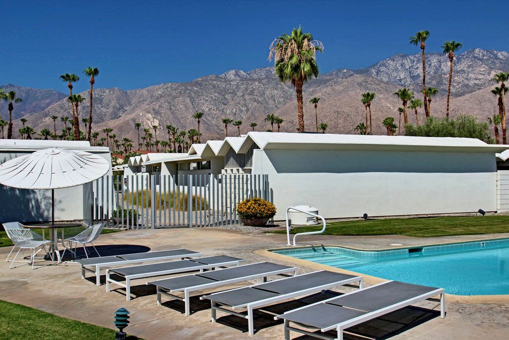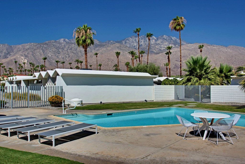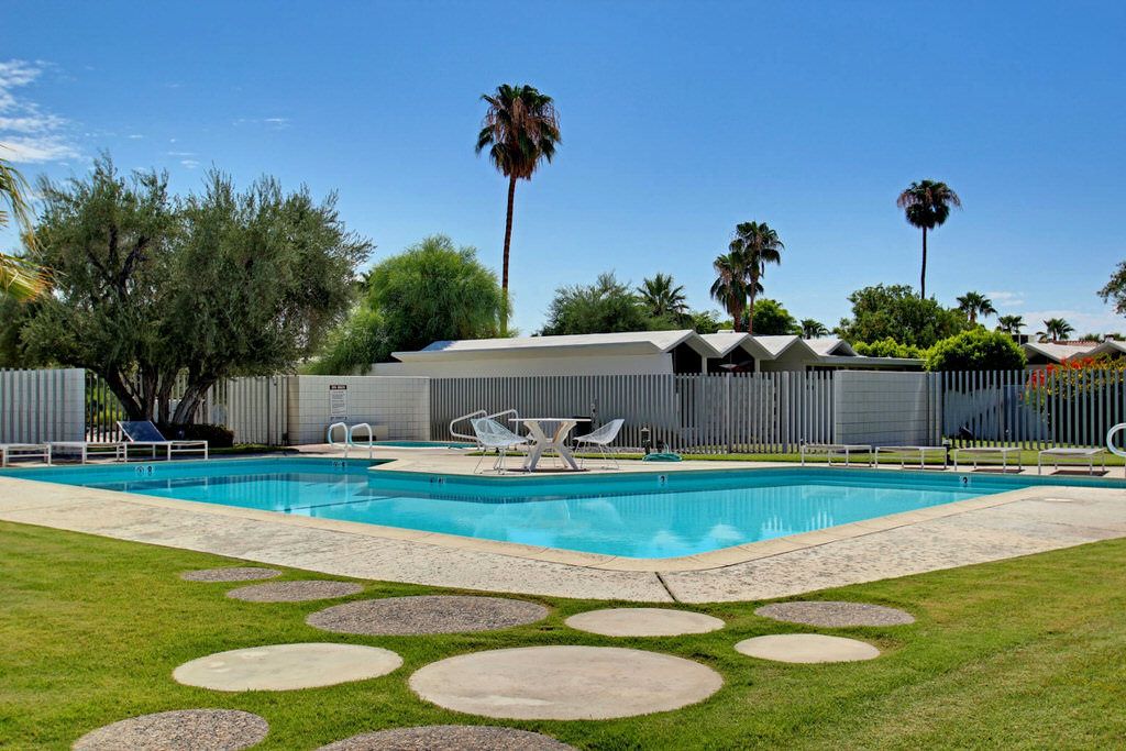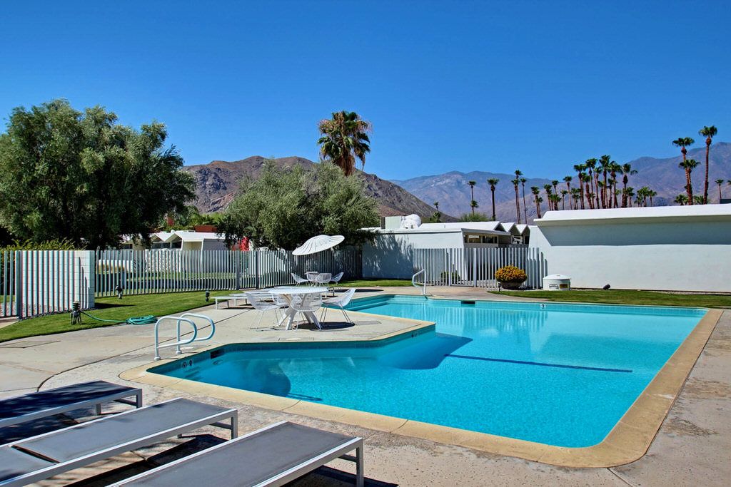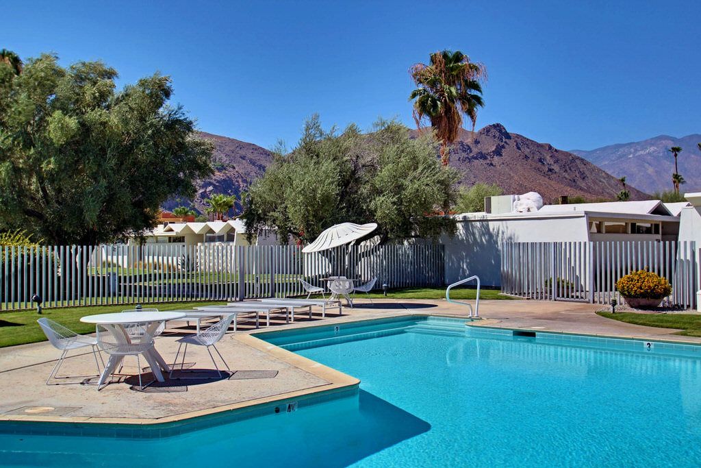 Positioned steps from the pool and spa, this unit truly is an homage to the mid-century esthetic and is not to be missed The grounds are also impeccable; meandering walkways are highlighted by a fusion of cool green grass and desert landscape. A large pool area with stunning mountain views complete this idyllic Palm Springs destination.