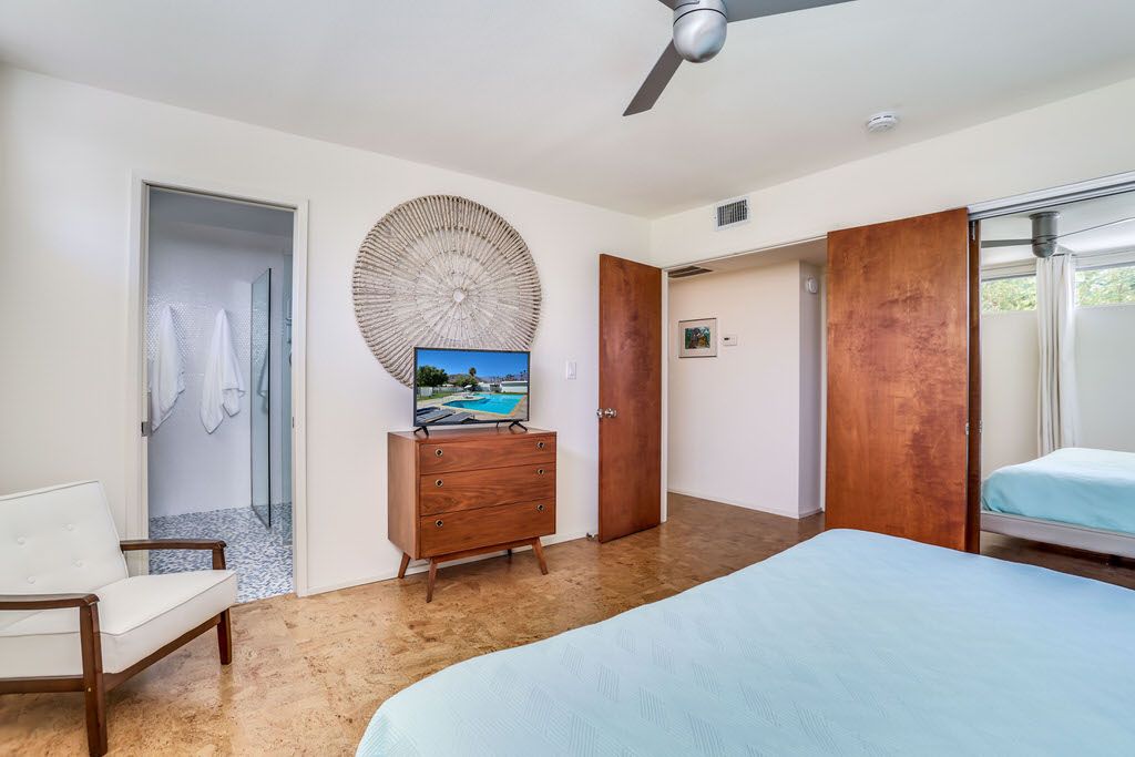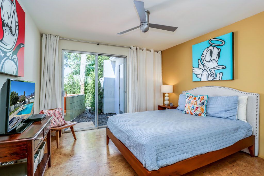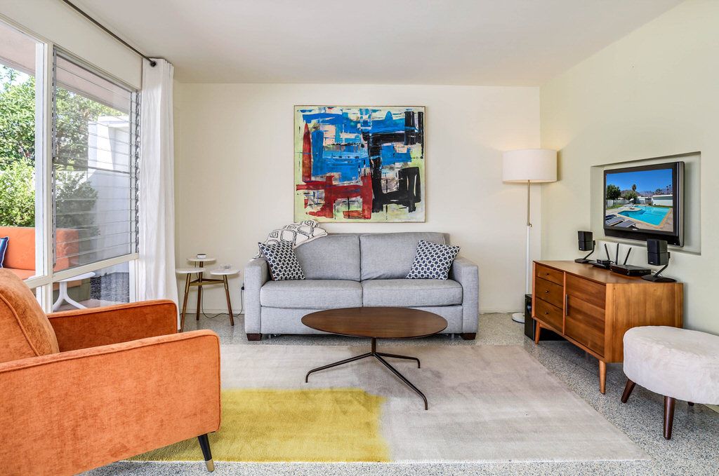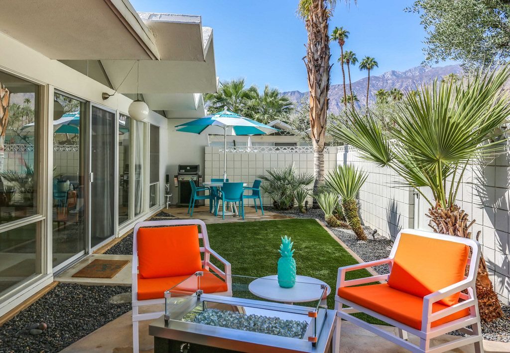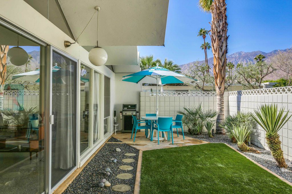 Positioned steps from the pool and spa, this unit truly is an homage to the mid-century esthetic and is not to be missed The grounds are also impeccable; meandering walkways are highlighted by a fusion of cool green grass and desert landscape. A large pool area with stunning mountain views complete this idyllic Palm Springs destination.