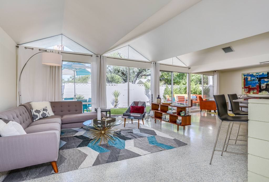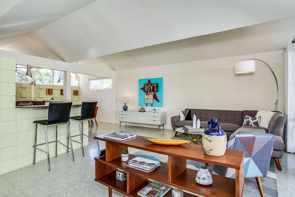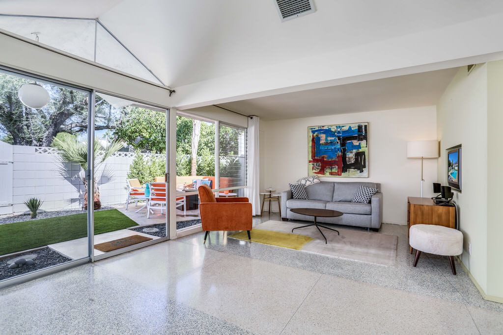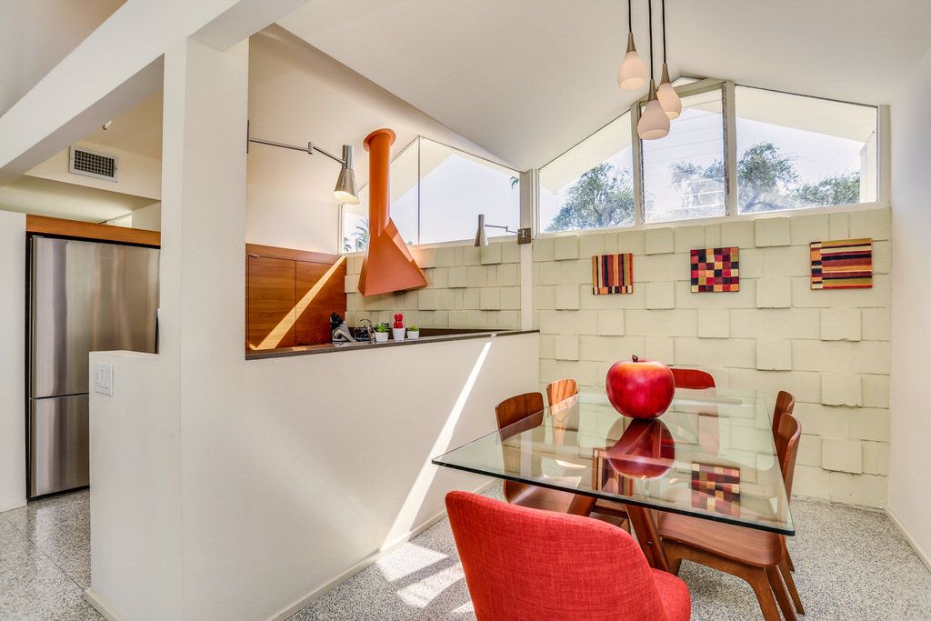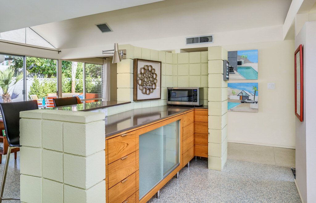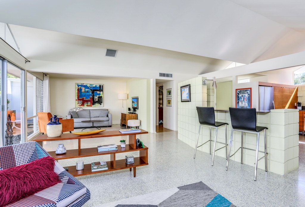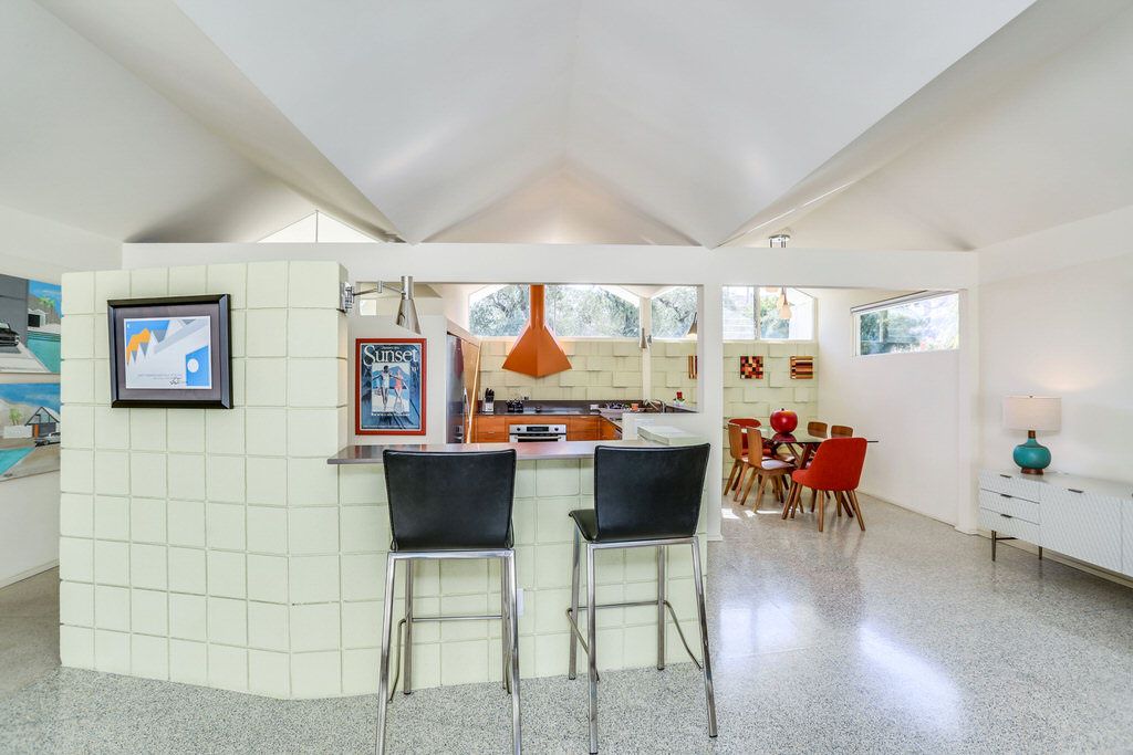 The unit was extensively remodeled in 2007 by current Architect owner with attention to detail and custom finishes. The folded-plate roof with clerestory windows floods the main living space with natural light. The original terrazzo entryway floor blends seamlessly with the newer terrazzo and cork flooring in keeping with that 60's vibe.