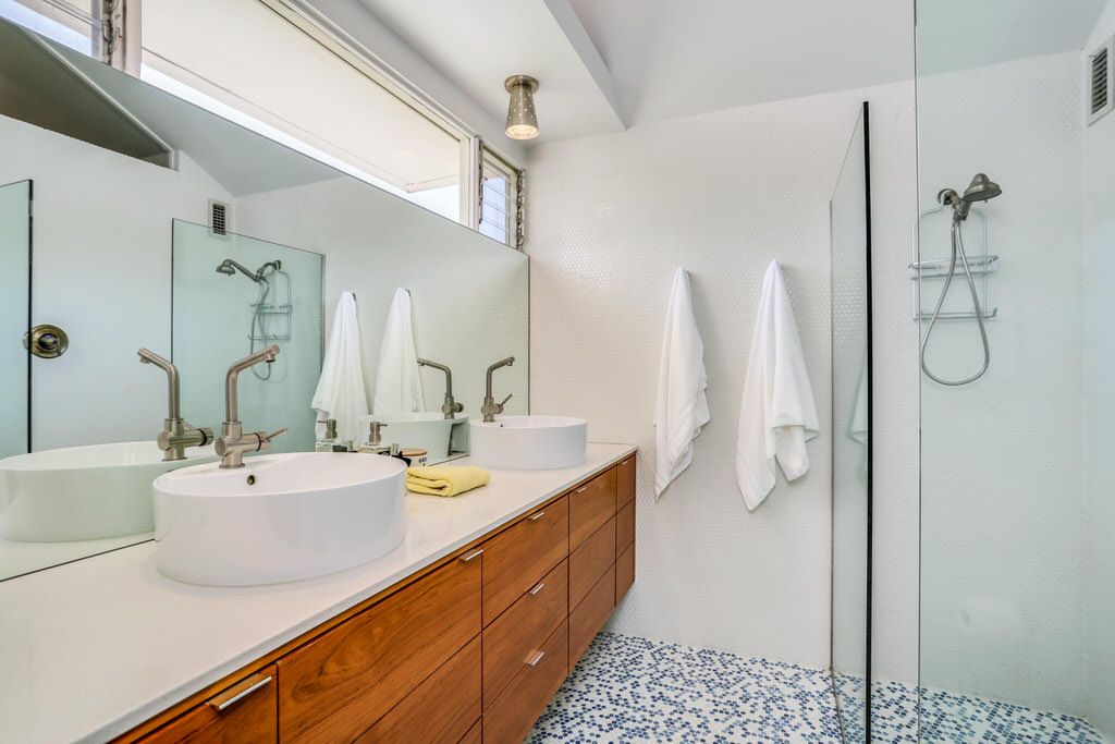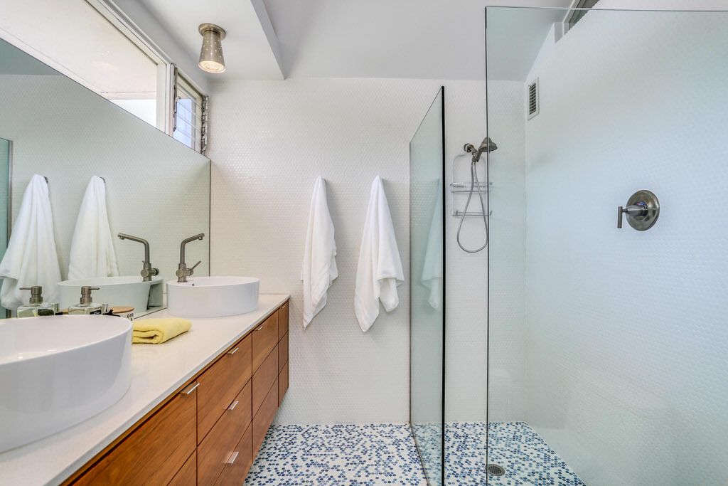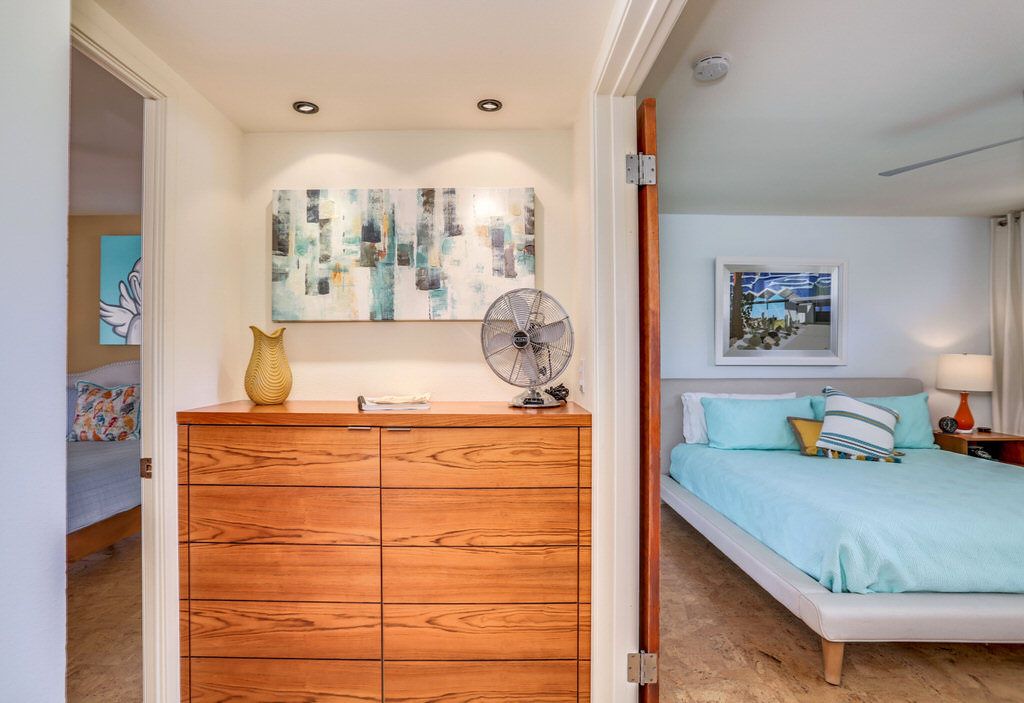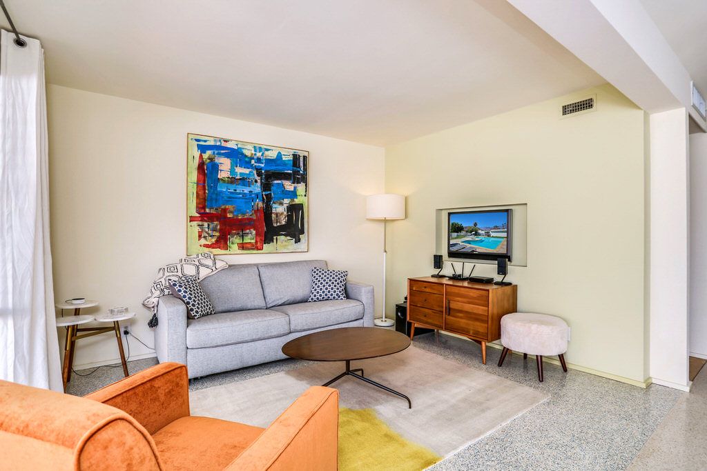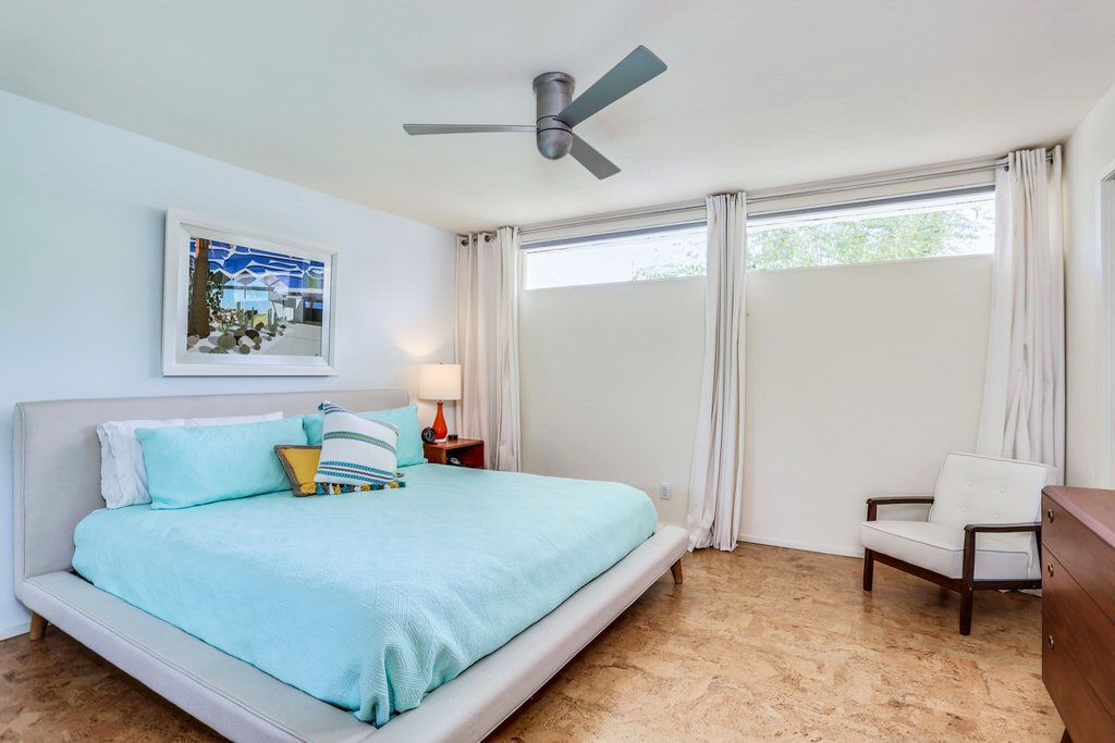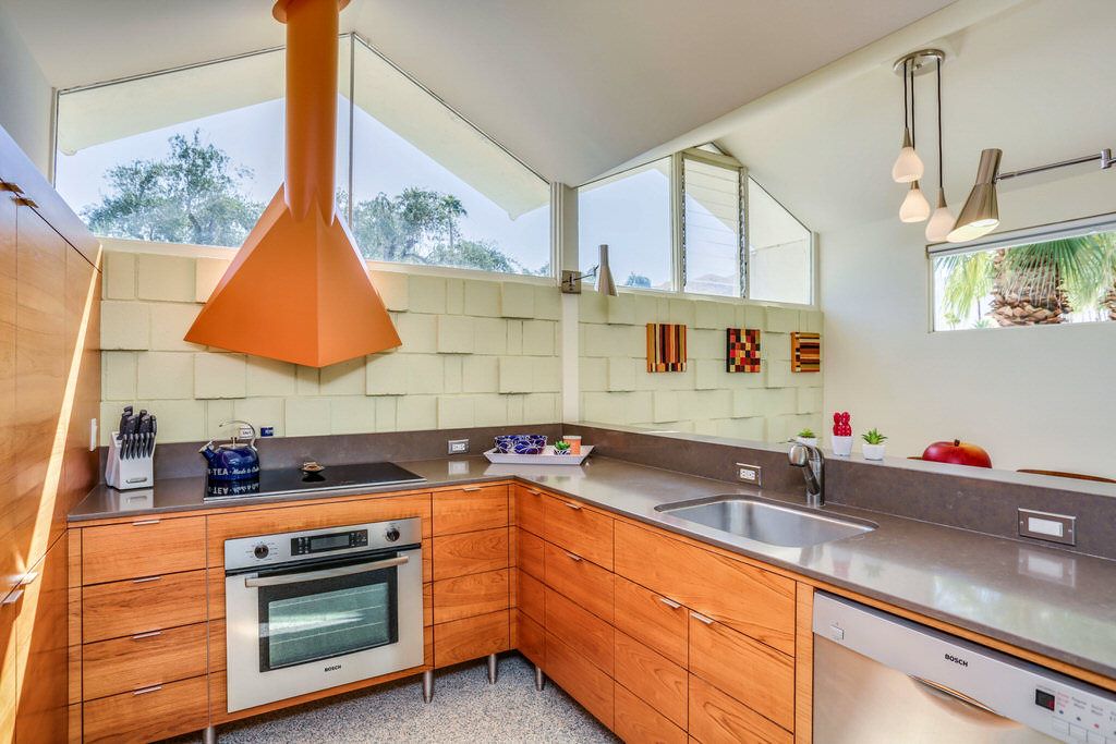 The unit was extensively remodeled in 2007 by current Architect owner with attention to detail and custom finishes. The folded-plate roof with clerestory windows floods the main living space with natural light. The original terrazzo entryway floor blends seamlessly with the newer terrazzo and cork flooring in keeping with that 60's vibe.