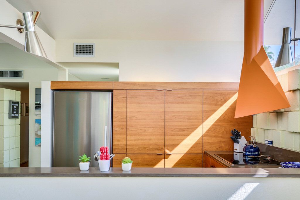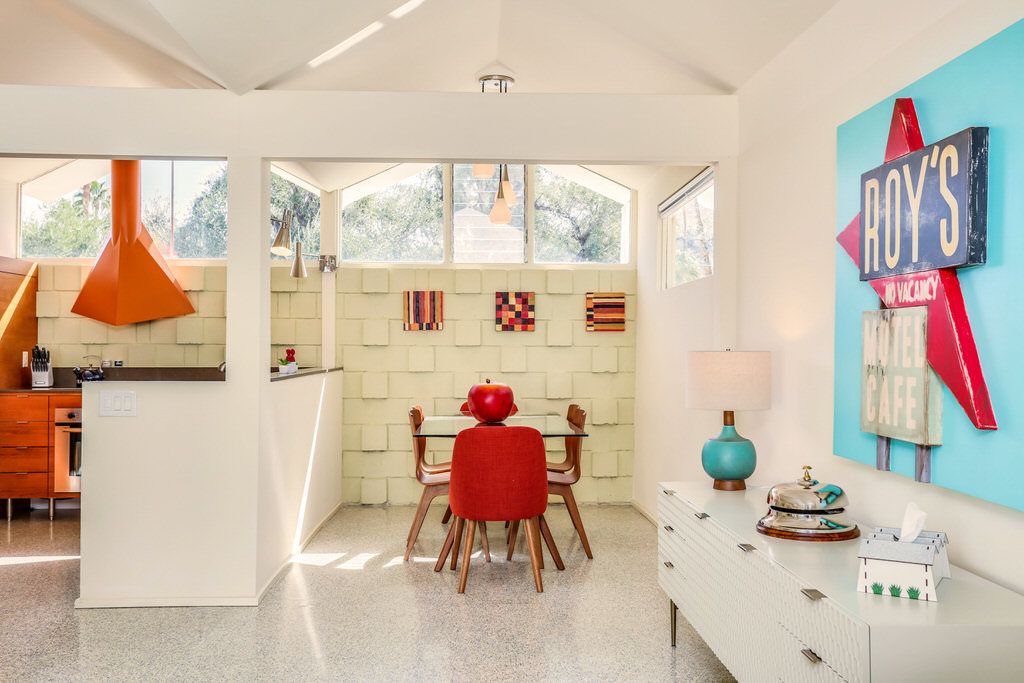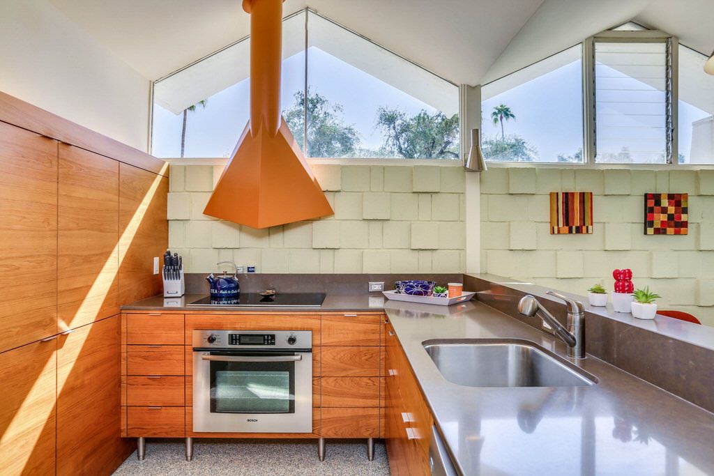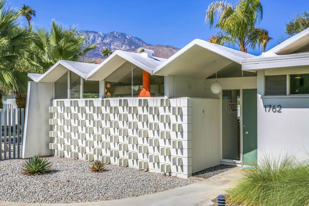 A corner unit location and honored for preservation, it feat. 2 Bd/2 Ba, 1426 SF, showcasing many of the original mid-century designs, including the iconic "folded plate" roof-line, built-in appliances, custom lighting, and interior block accent walls.