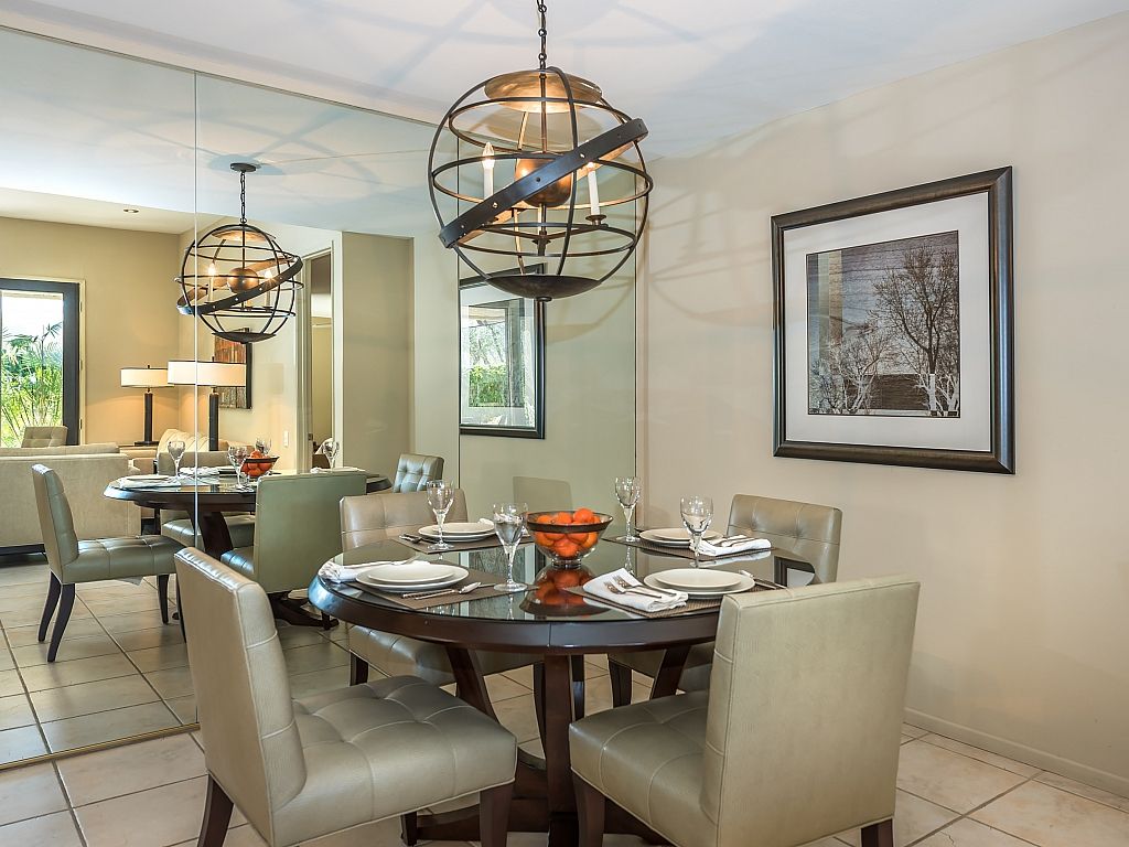 Adjacent to the kitchen is the mirrored dining room with comfortable seating for four. Or perhaps you choose to dine Al-fresco and unwind in your covered Mountain View courtyard while enjoying your meal together.