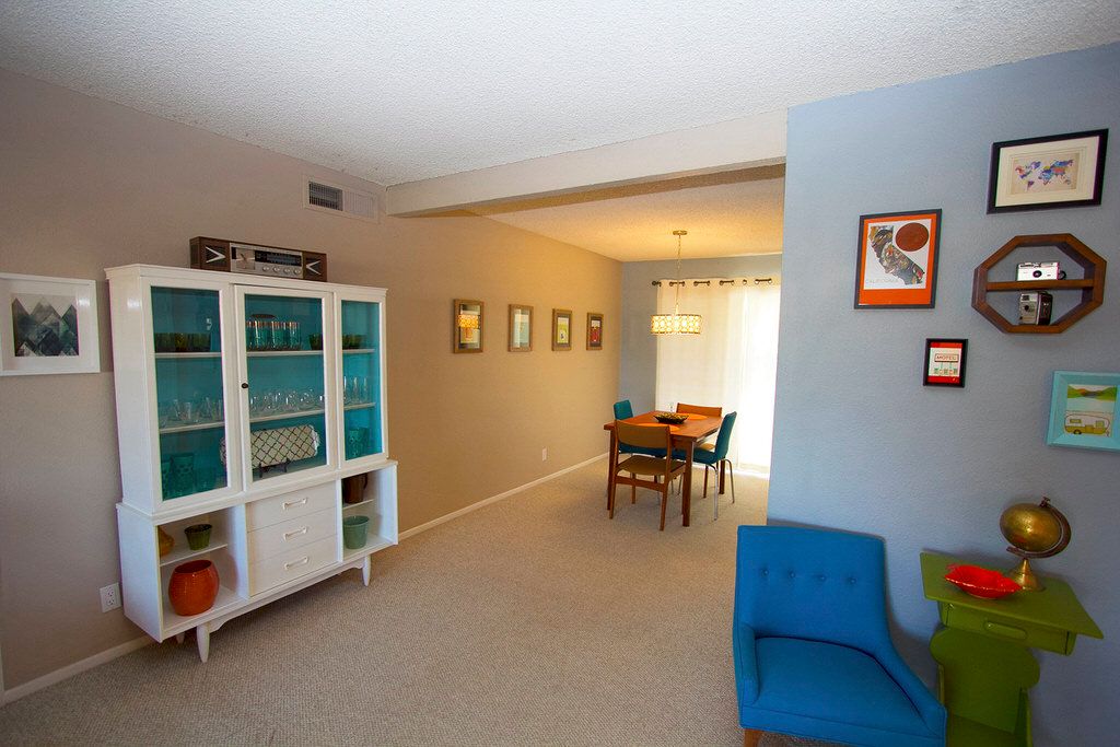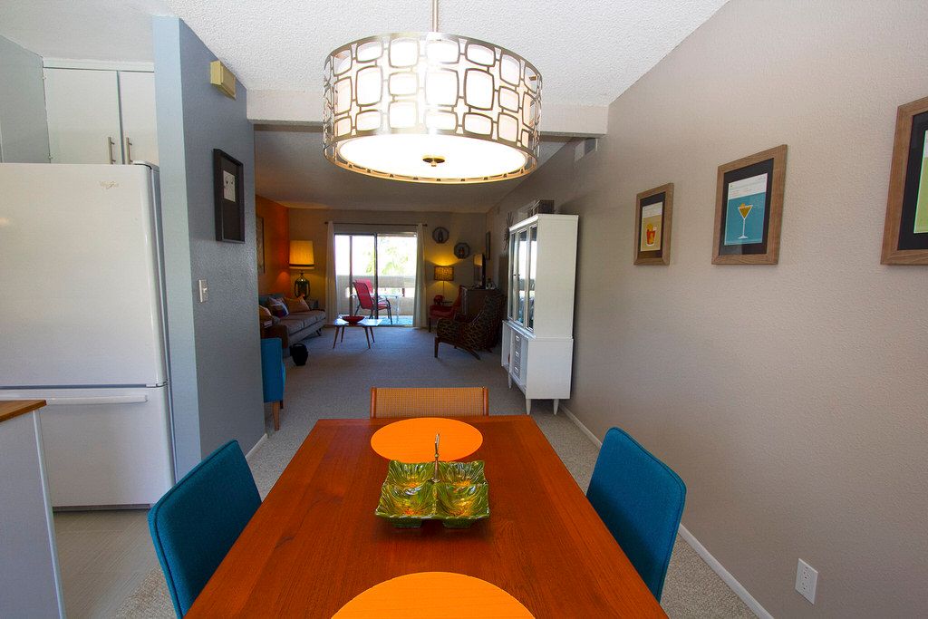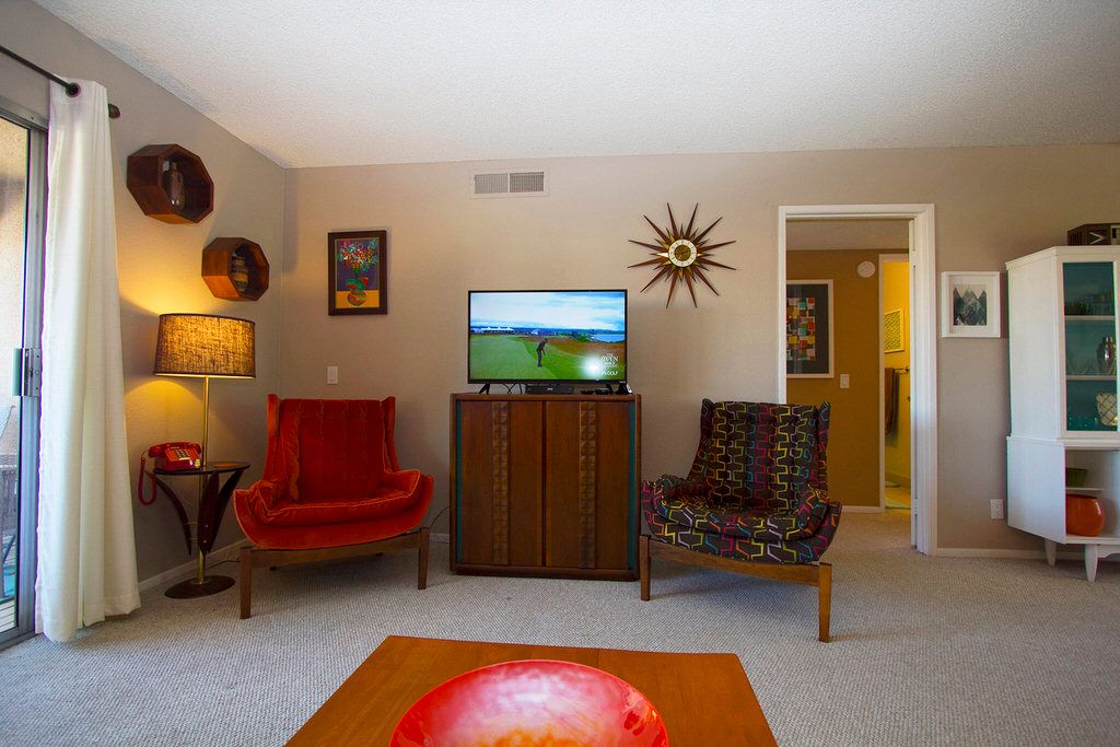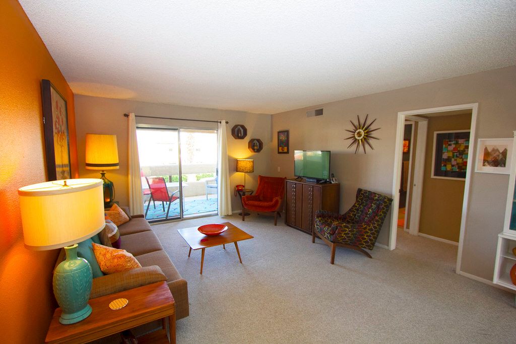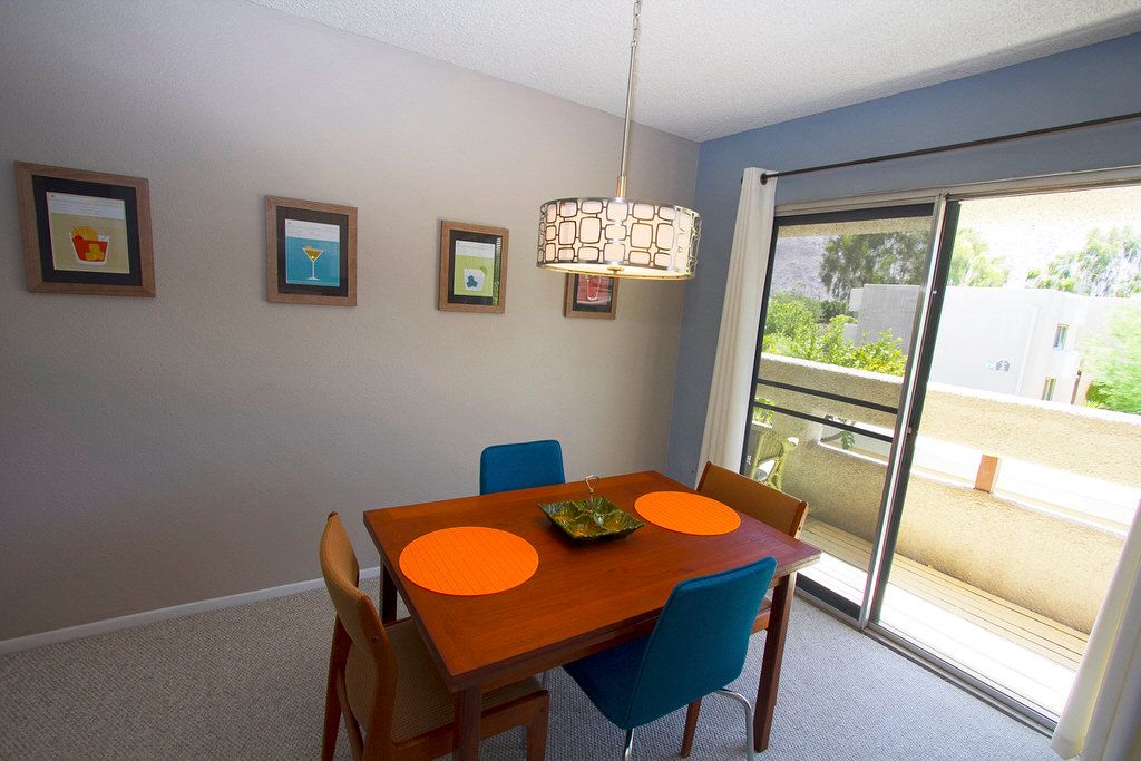This Palm Springs vacation condo for rent is open and bright through-out. It has been nicely furnished with midcentury modern furnishings and decor.