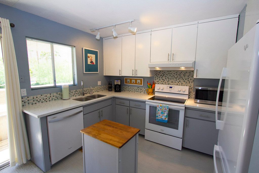 The kitchen in this Palm Springs vacation rental condo has been redesigned and remodeled with stylish cabinets and newer appliances. The kitchen is fully stocked with everything you need to prepare outstanding meals for you and your guests.