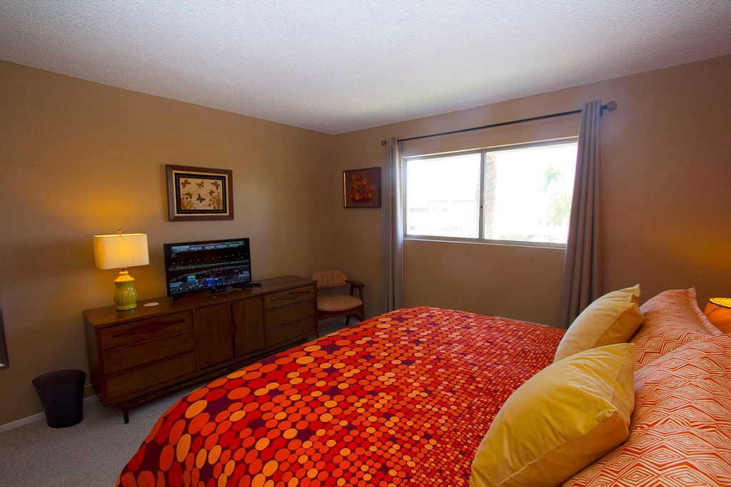 The bedrooms in this Palm Springs vacation rental are located on the same level. The master suite is furnished with a new, comfortable king size bed, quality sheets and a 32 inch TV.