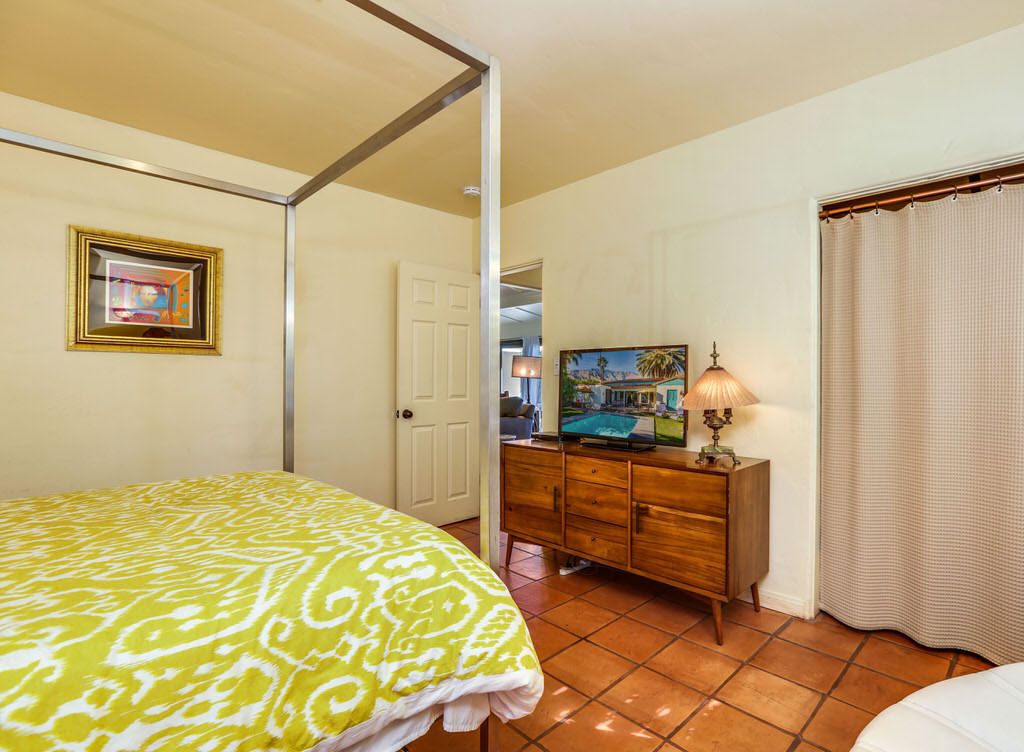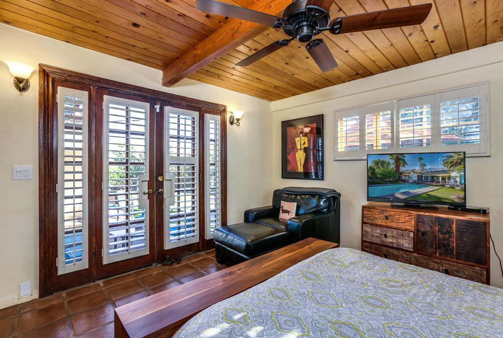 The master bedroom of this Palm Springs vacation home overlooks the pool, spa, and mountain backyard through french doors, and features a comfortable queen bed, 38"" HDTV, and sitting area.