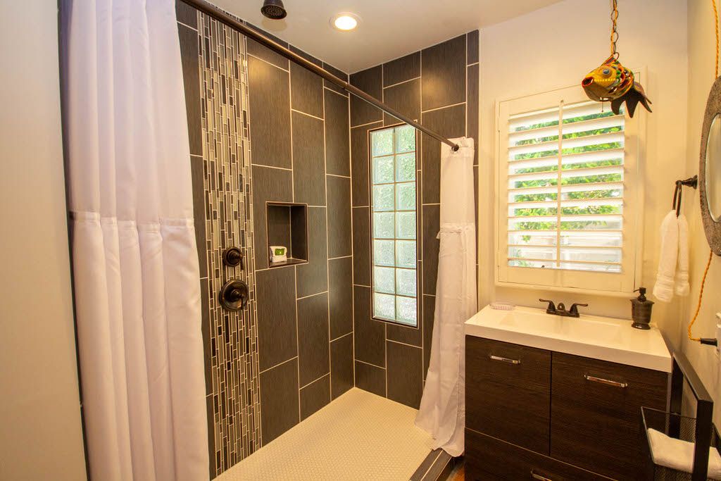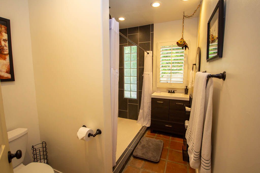 The guest bedroom also features a queen bed, 38"" HDTV, and adjacent sitting area, and it shares the hall bath with the master. The recently updated hall bathroom offers a walk-in shower.