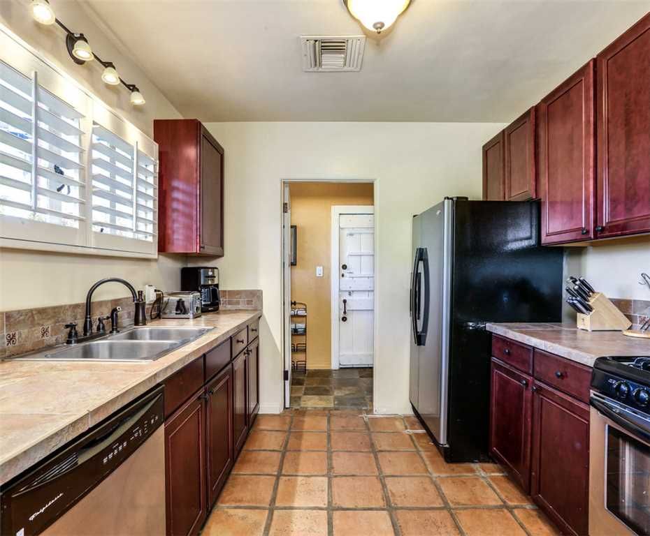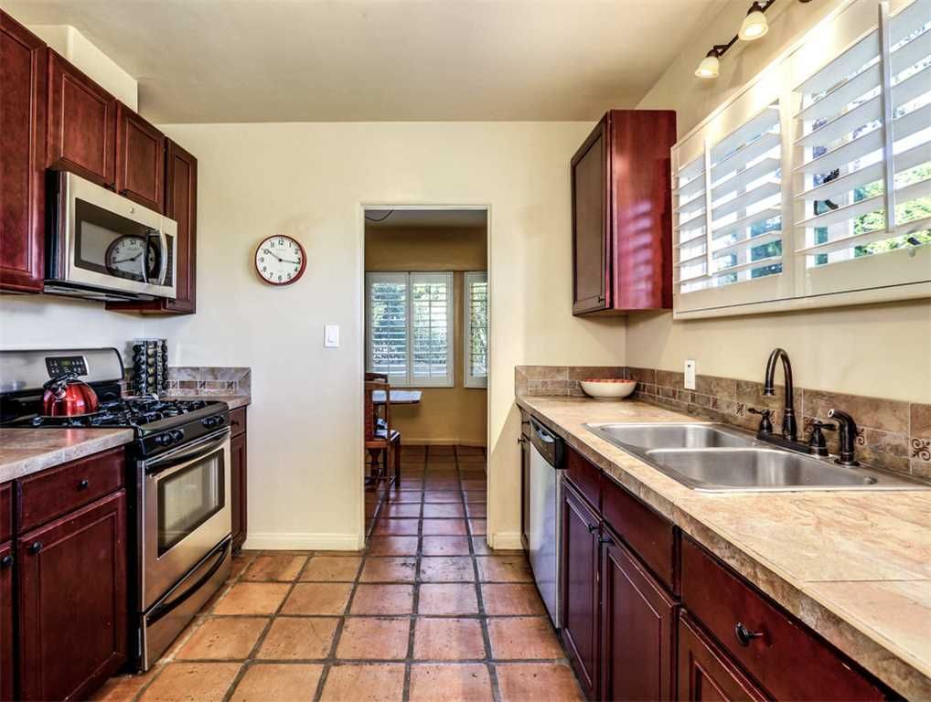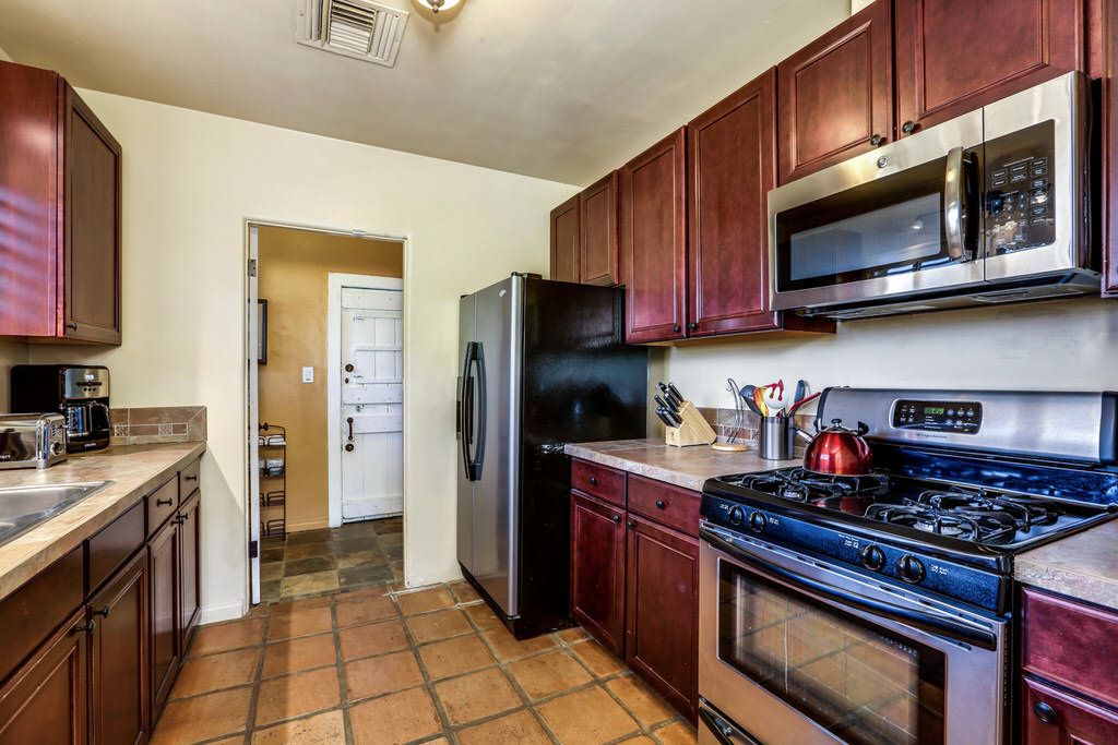 The chef inspired kitchen features tile counters with modern artistic backsplash. In the well stocked kitchen you'll find everything you need to prepare wonderful meals for friends and family.