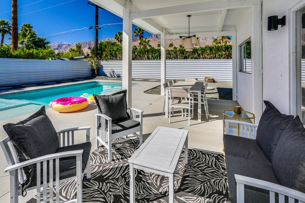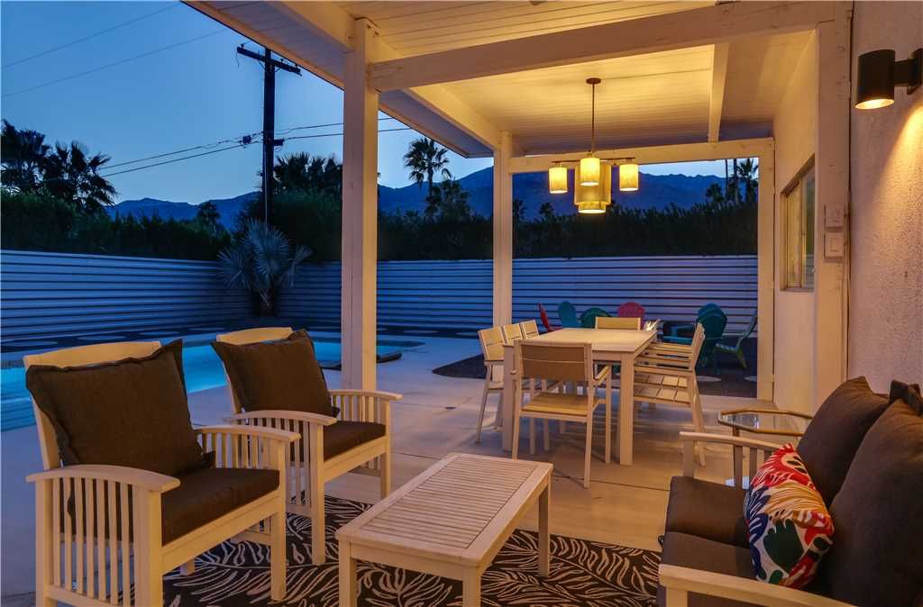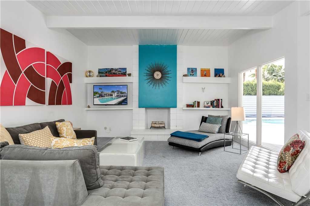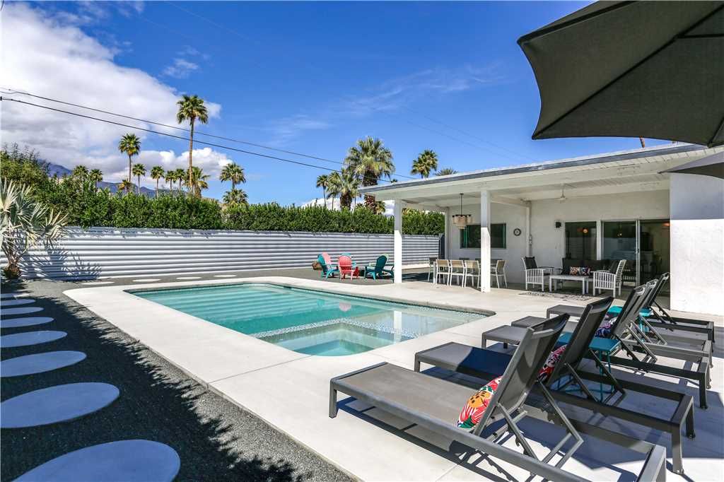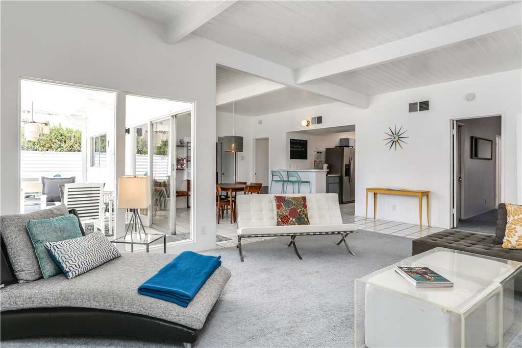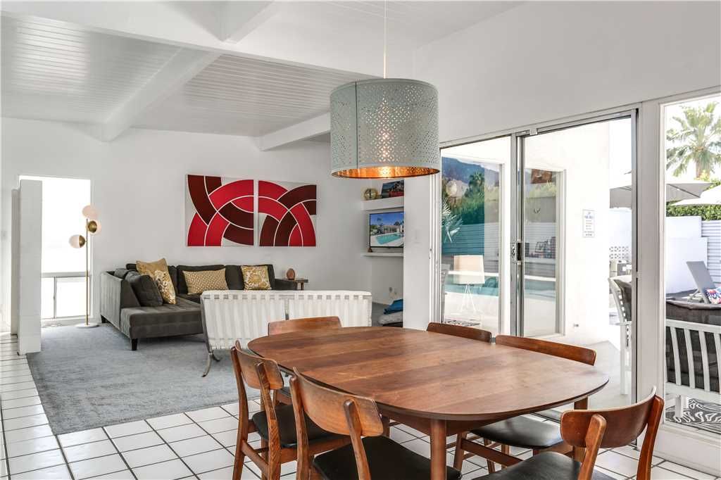 The open and inviting floor plan of this mid-century Palm Springs vacation home gives you plenty of space between the living room, kitchen and dining room and is ideal for entertaining friends and family.