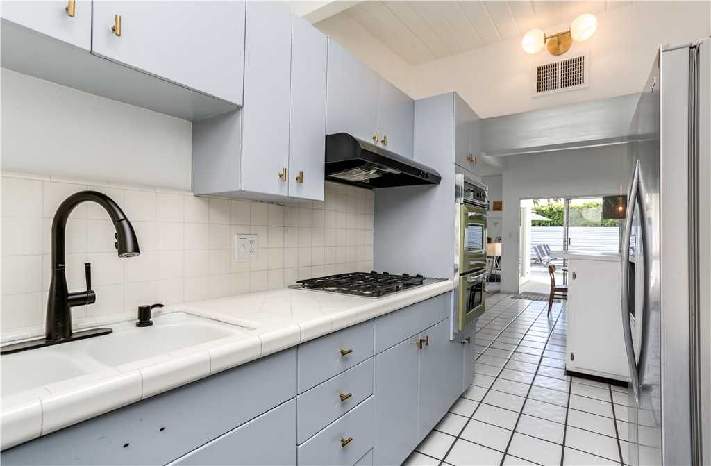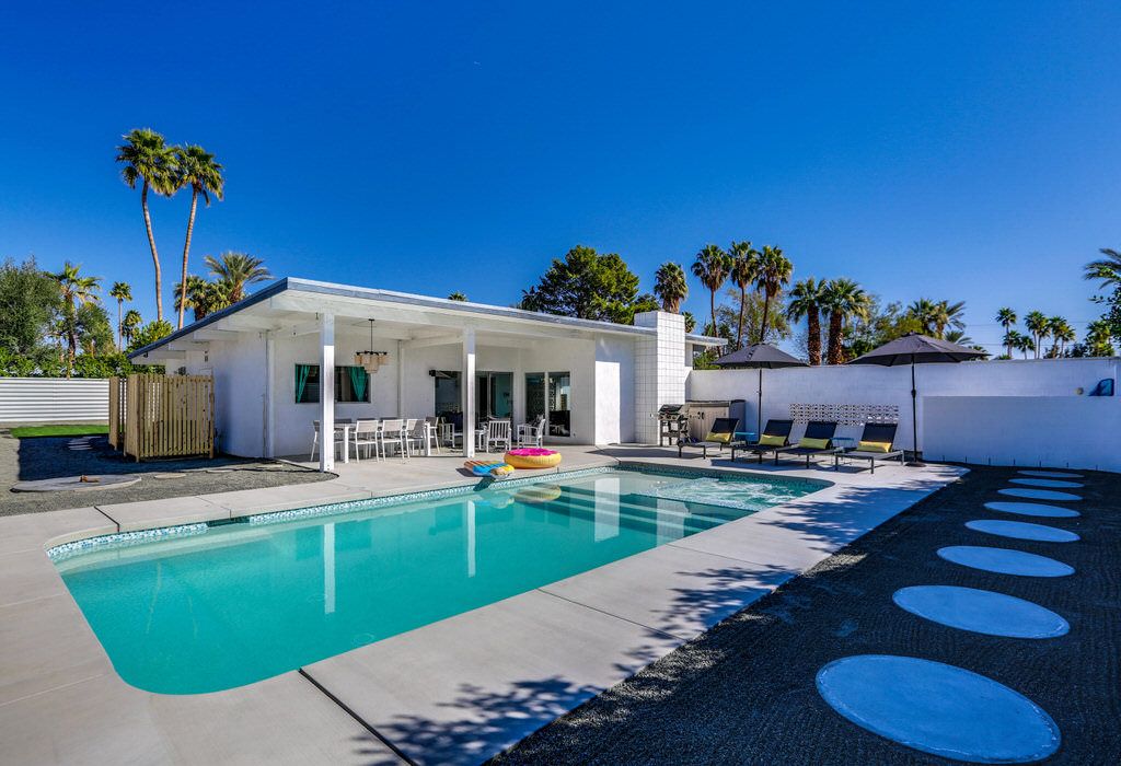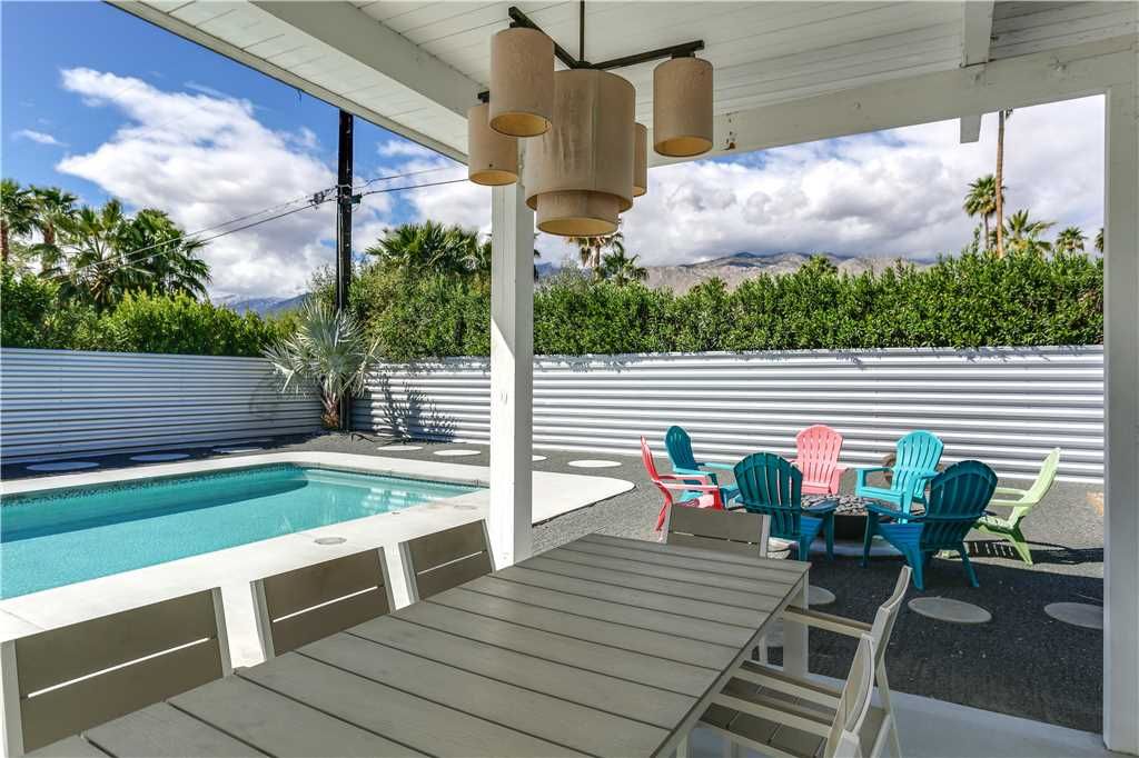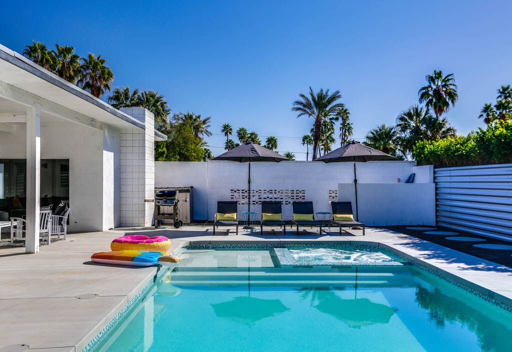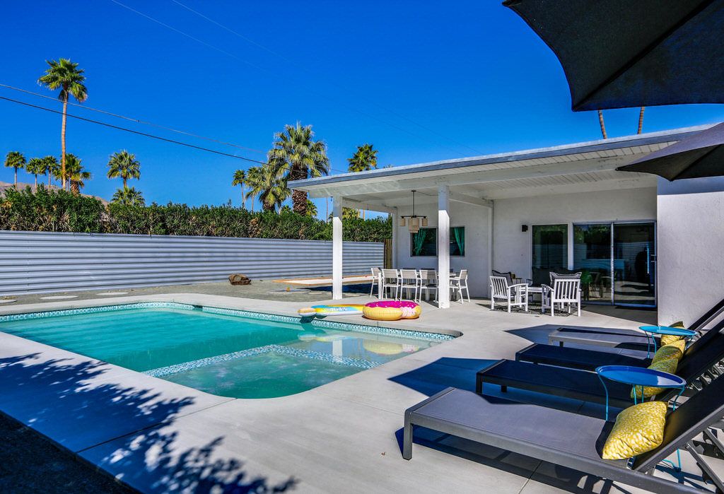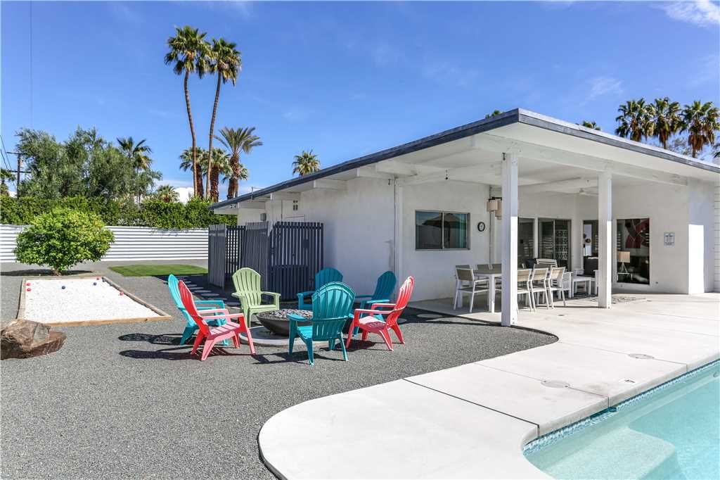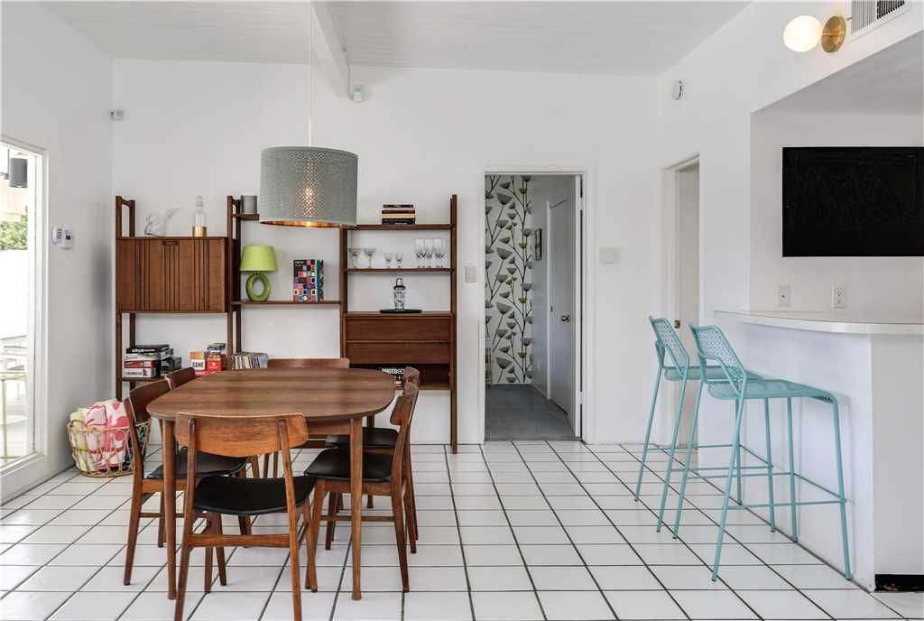 The open and inviting floor plan of this mid-century Palm Springs vacation home gives you plenty of space between the living room, kitchen and dining room and is ideal for entertaining friends and family.