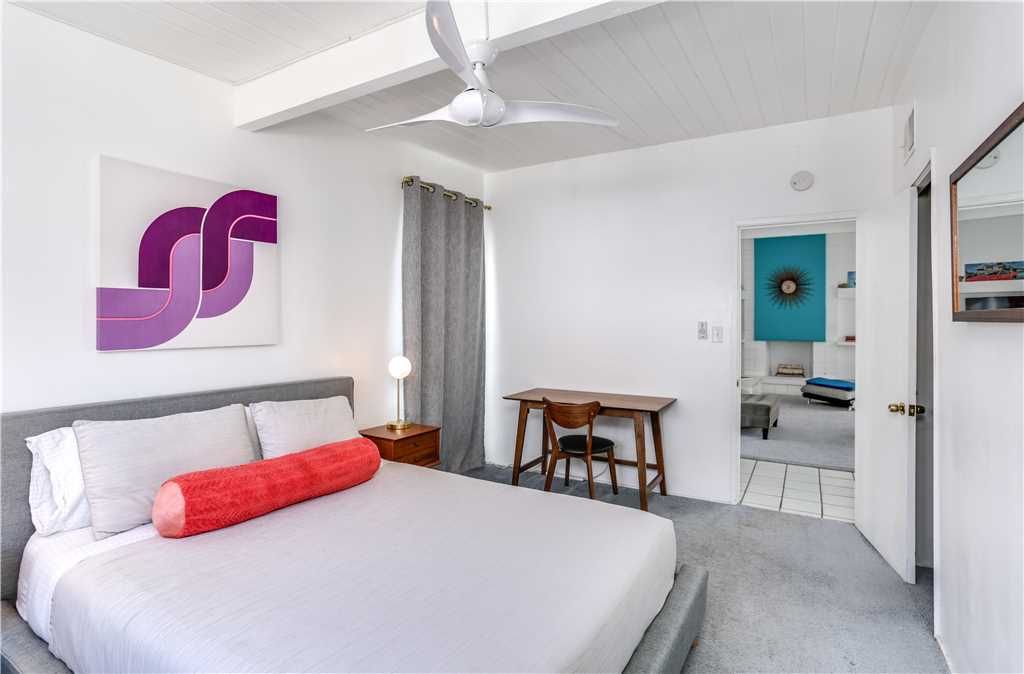 The master bedroom in this Palm Springs home for rent is perfect for contemplation and relaxation. This bedroom is furnished with a Queen size bed, new linens and offers an en-suite bathroom that features a shower/tub combo.