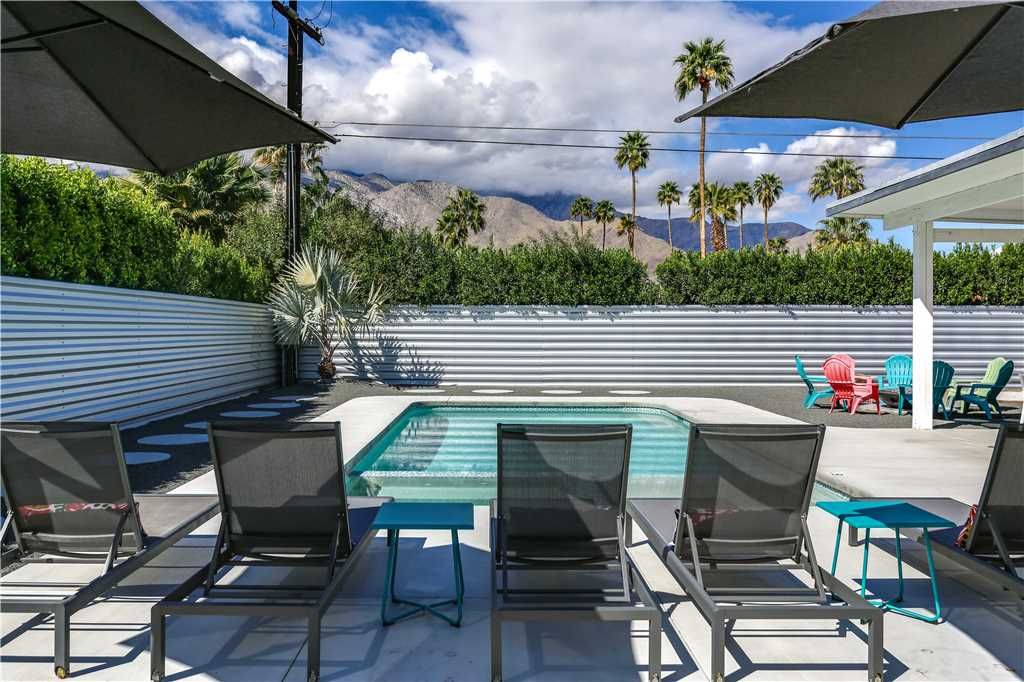This vacation rental in Palm Springs has a relaxed vibe with beamed ceilings in the large airy great room, large windows and skylights that provide plenty of natural light. This home offers a stylish and ultra comfortable getaway for your next excursion to Palm Springs.