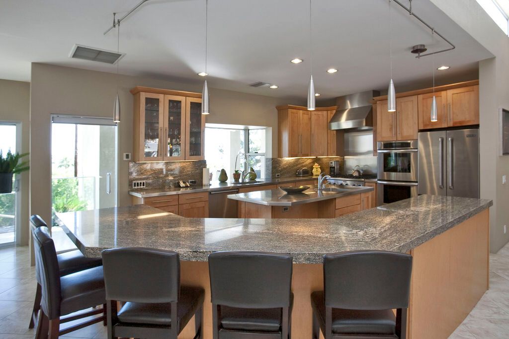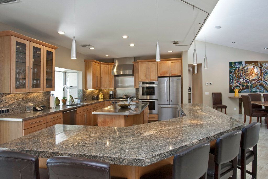 Highlights of the open kitchen floor plan include a large island, granite and stainless steel countertops, a stainless steel backsplash, and beautifully integrated cabinetry. This epicurean kitchen is perfect for meal time gatherings or breakfast bar dining.