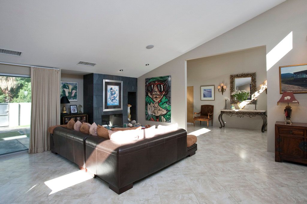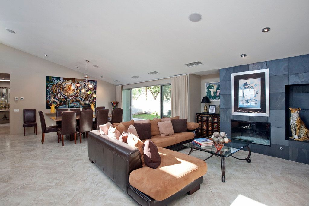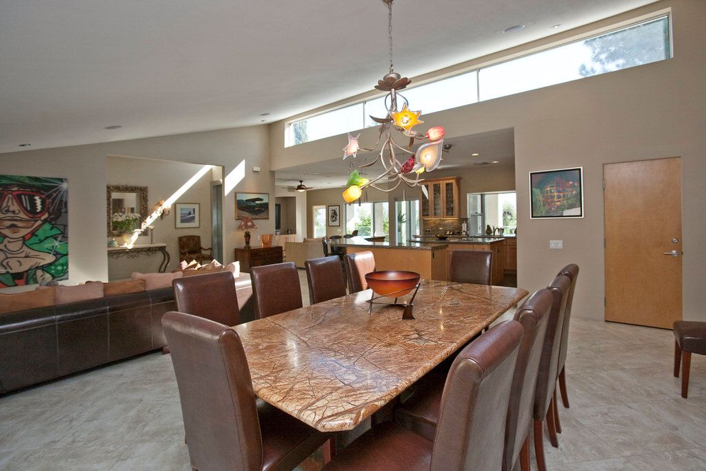Luxurious appointments in the Great Room include a semi-circular sofa facing a cozy fireplace, and a formal marble topped dining table that seats eight. The vast open living space is enhanced by thought-provoking contemporary art.