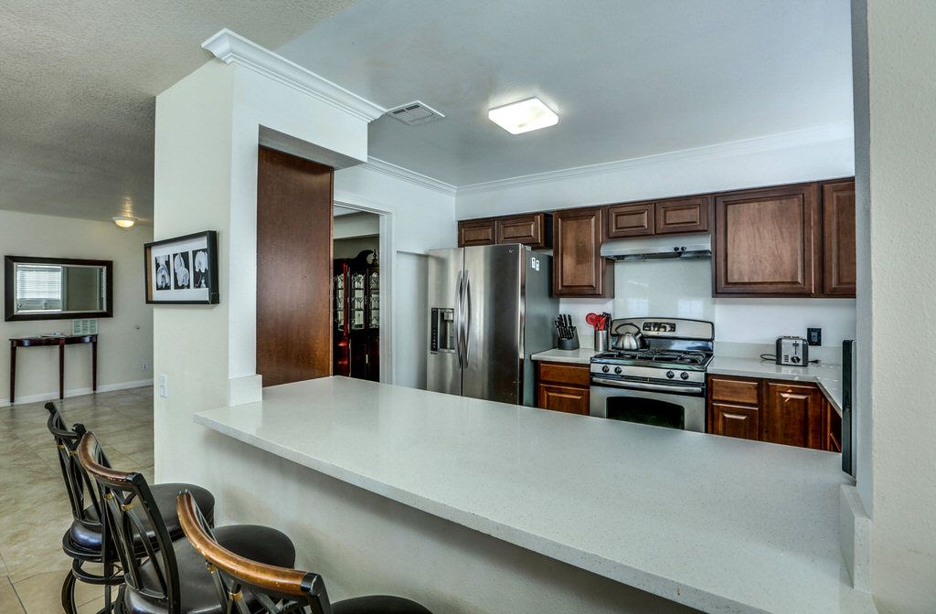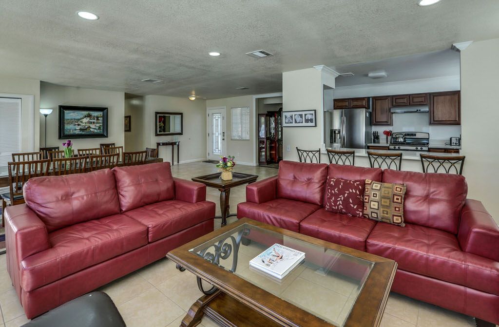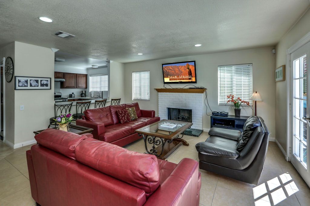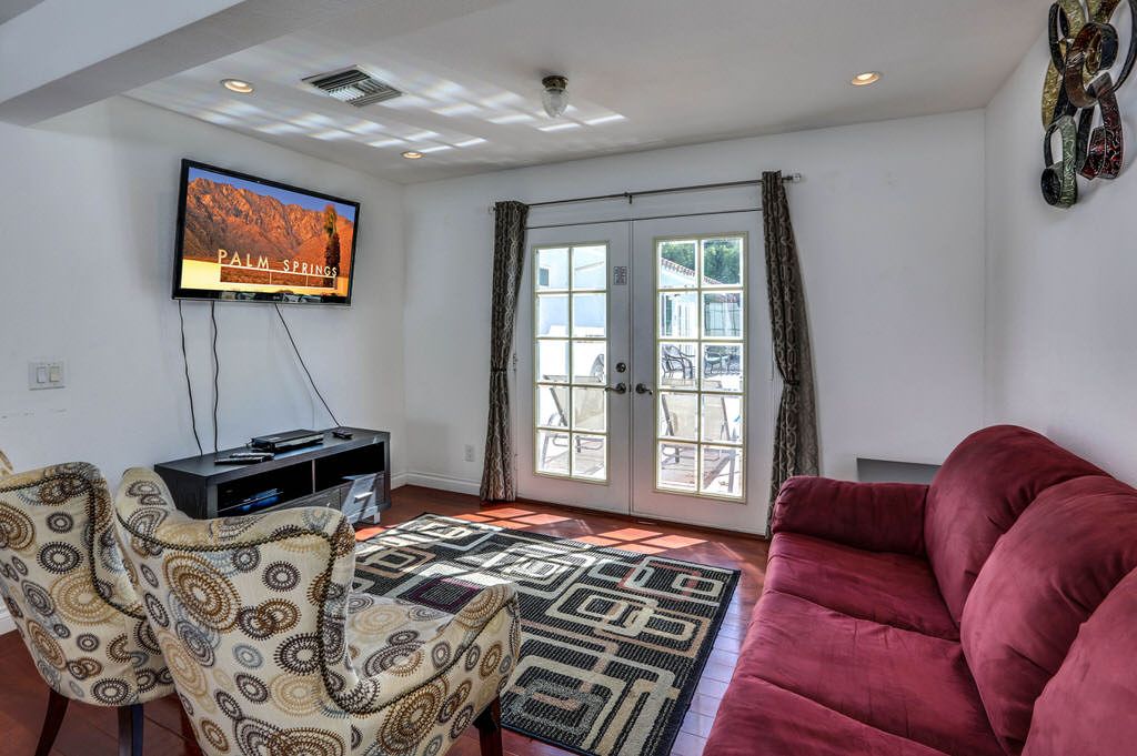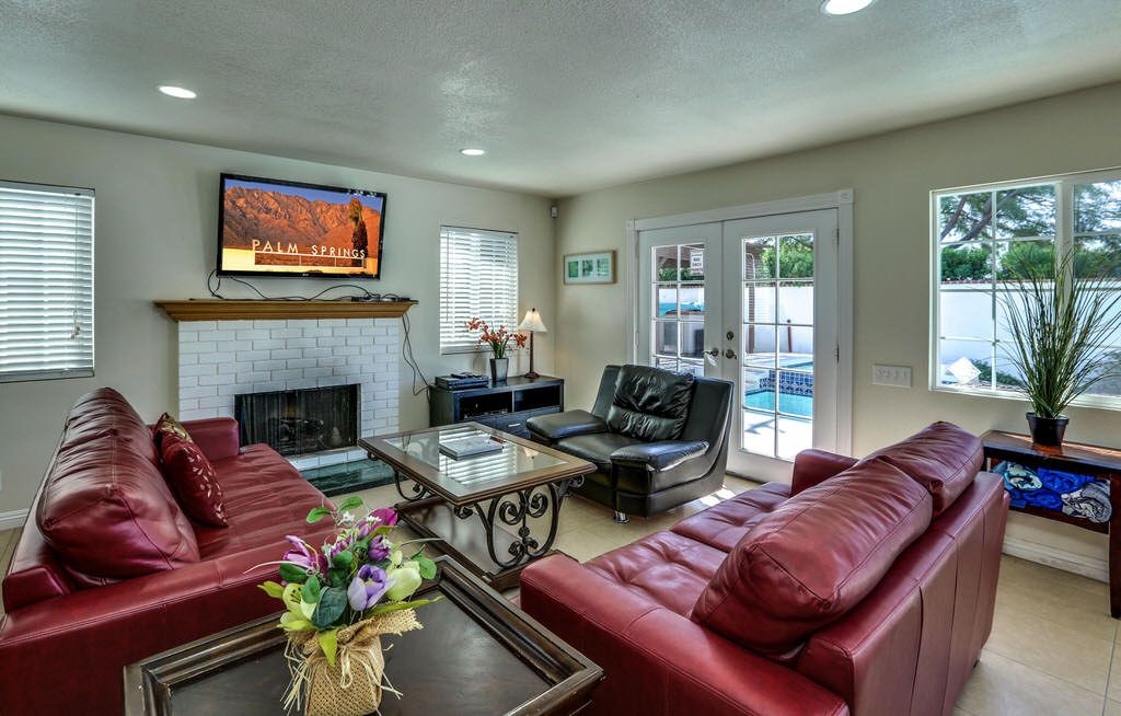 The main living area in this Palm Springs vacation home is bright and sunny with comfortable leather sofas, bar seating for up to 6, a 46"" High Def TV with Blu-tay player, and direct access through lovely french doors to the pool and spa.