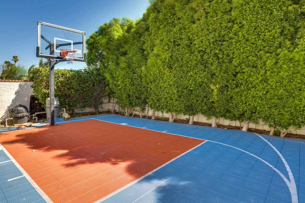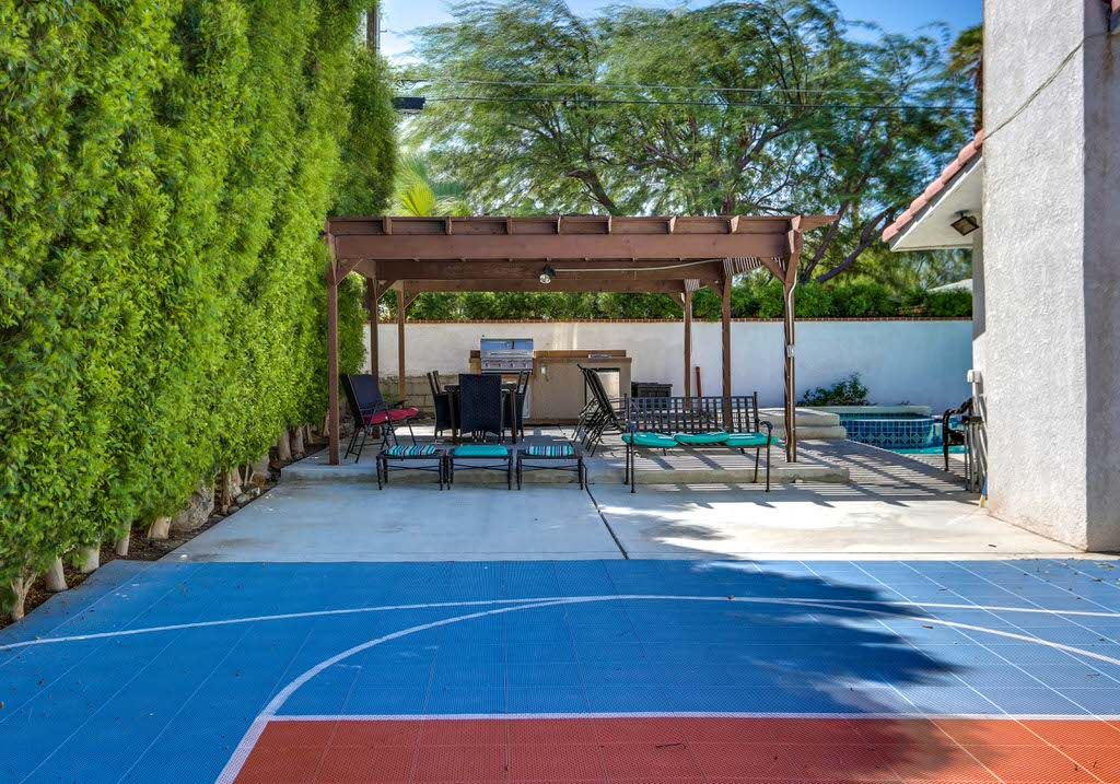The private pool and whirlpool spa are in ground and side by side so you can enjoy the refreshing temperatures of both. You and your guests will enjoy relaxing on a lounge chair or pool float and soaking in the year-round Palm Springs sunshine. A basketball sport court offers activity for kids and kids at heart.