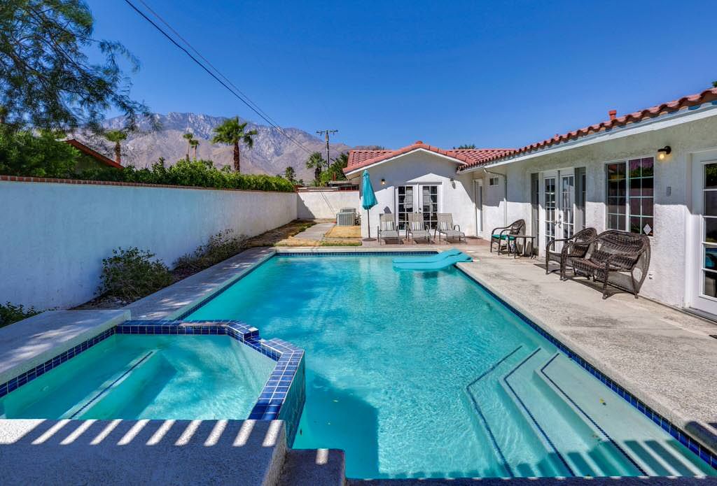 This private palm springs vacation rental is available for rent weekly, weekends or monthly. The sparkling swimming pool is perfect for lounging and soaking up the Palm Springs sunshine.