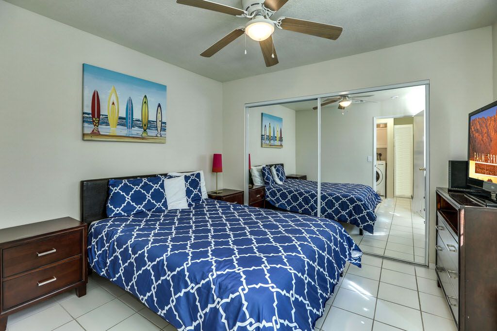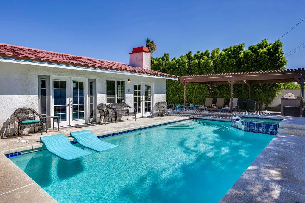 With 7 bedrooms and 5 bathrooms this spacious private pool home in Palm Springs accommodates up to 14 (2 must be children age 12 or under). Great for family vacations, groups, golf trips, family reunions & celebrations, this Palm Springs vacation rental home features a sparkling pool, whirlpool spa, 2 kitchens and 2 living areas.
