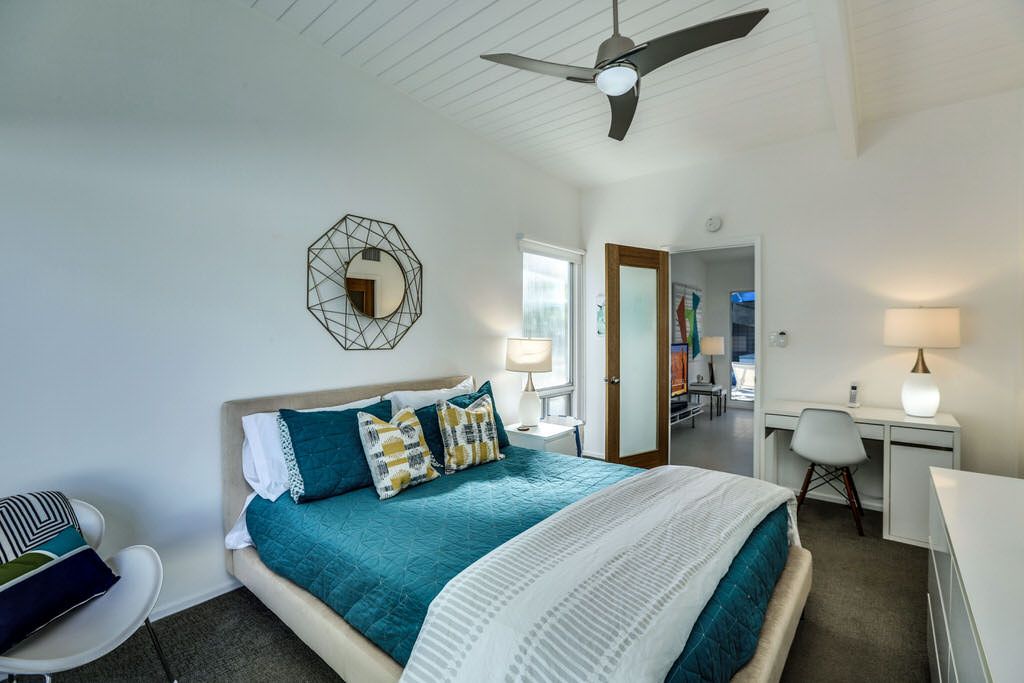 One of the unique design features of a Meiselman floorplan is the separate space configuration of bedrooms, allowing the master bedroom to be at the opposite end of the house from the guest room to maximize privacy. The Master Suite has a queen bed, private en-suite bathroom with double shower heads, walk-in closet, private patio, and a 32"" TV. The additional guest bedroom is furnished with a 32"" TV, offering a queen bed, quality linens, ample closet space, and a wonderful private patio.