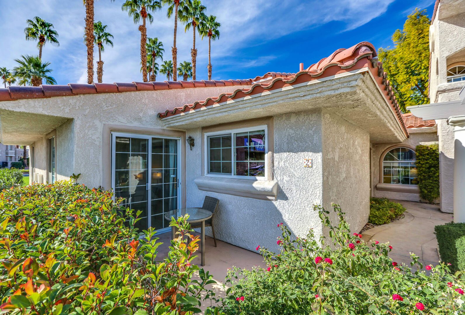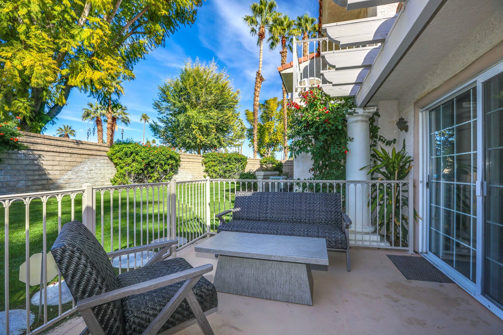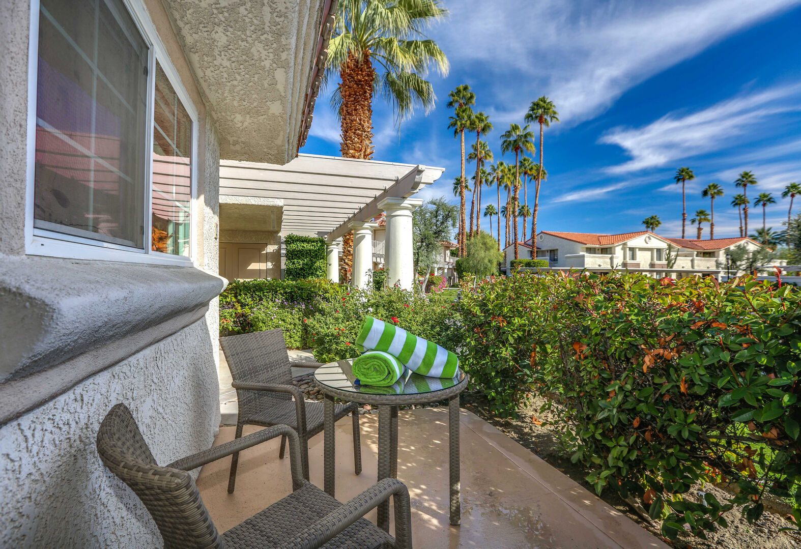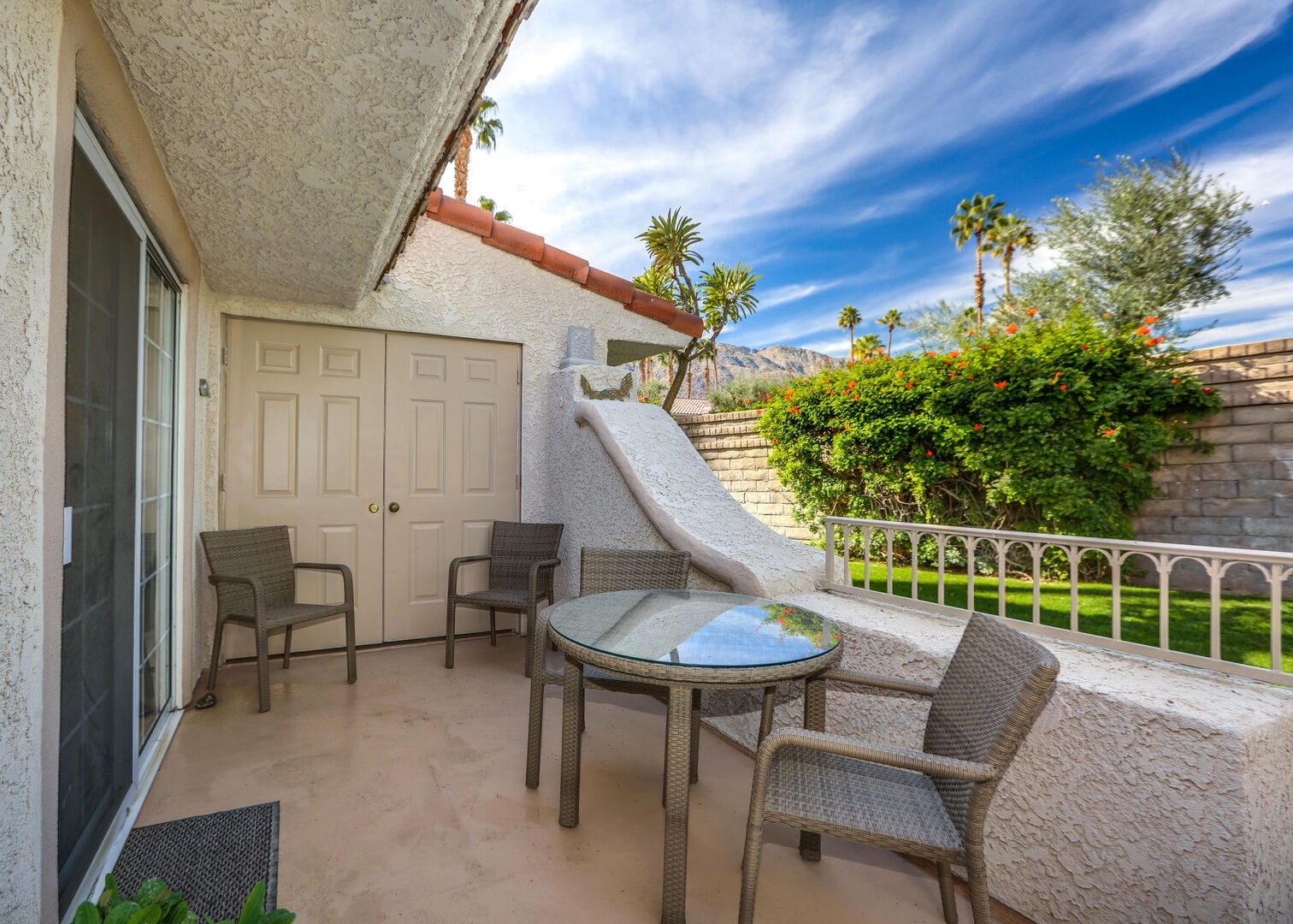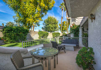This fully renovated, Mesquite Phase III ground floor unit is now available for you to enjoy in central Palm Springs. The entire two bedroom, two bathroom unit is new from the studs out, and you'll appreciate the brand new furnishings and high-end amenities. This Mesquite Country Club condo is an end unit, located on the ground-floor and mere steps from one of the multiple community swimming pools and spas. Covered parking is just a few steps from the front door, yet the rear patio offers secluded serenity with no views of neighbors, or any reason for anyone to intrude on your privacy.The unique location within the community features lush landscaping and a grassy lawn, that feels like your very own. Did we mention the complete renovation of this beautiful retreat? Comfortable and Contemporary styling defines this open-concept floor,plan, and you'll appreciate the wall to wall tile flooring, brand new kitchen and bathroom cabinetry, brand new appliances, and brand new furniture. The U-shaped kitchen is well equipped with everything you'll need to prepare meals and entertain guests. All appliances are stainless steel and top-notch.The two bedrooms of this Palm Springs vacation condo are on separate sides of the home to allow for optimum privacy, and both offer direct access to their own unique patio space. The spacious master suite features a King bed, flat screen TV, dual vanities, walk in shower, and direct rear patio access. The second bedroom is located in the front of the condo and features a Queen bed, flat screen TV, and shared hallway bathroom, with walk in shower. There is no bathtub in this condo.Take advantage of Palm Springs Mesquite Country Club amenities, which include: 18 hole Championship golf course, 16 pools, 18 jacuzzis, pro shop, restaurant, cocktail lounge and club house. When you rent this Palm Springs condo, you'll have access to playing golf (reasonable greens fees apply) at Mesquite Country Club. This 2 bedroom vacation condo is just minutes from downtown Palm Springs, with wonderful restaurants, shops, and art galleries. Enjoy fantastic Palm Springs attractions nearby, like the Palm Springs Aerial Tram, Wet n Wild Water Park, Indian Canyons Preserve, golf and outlet mall shopping. Property DescriptionApproximately 1175 sq ftLocated in Palm Springs2 TVsPropane BBQCommunity Pool & JacuzziWasher and DryerWiFiLocal/Long Distant Phone Calls Children AllowedSmall Dog Allowed30 Night MinimumCity ID #4319TOT #4004Room ConfigurationMaster: King, Flat Screen TVGuest: Queen, Flat Screen TVBathroom ConfigurationMaster: En Suite ShowerGuest: ShowerAmenities