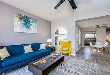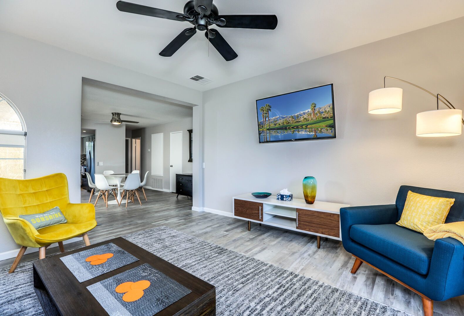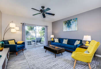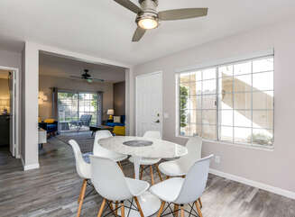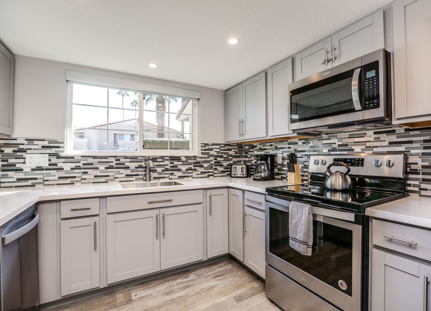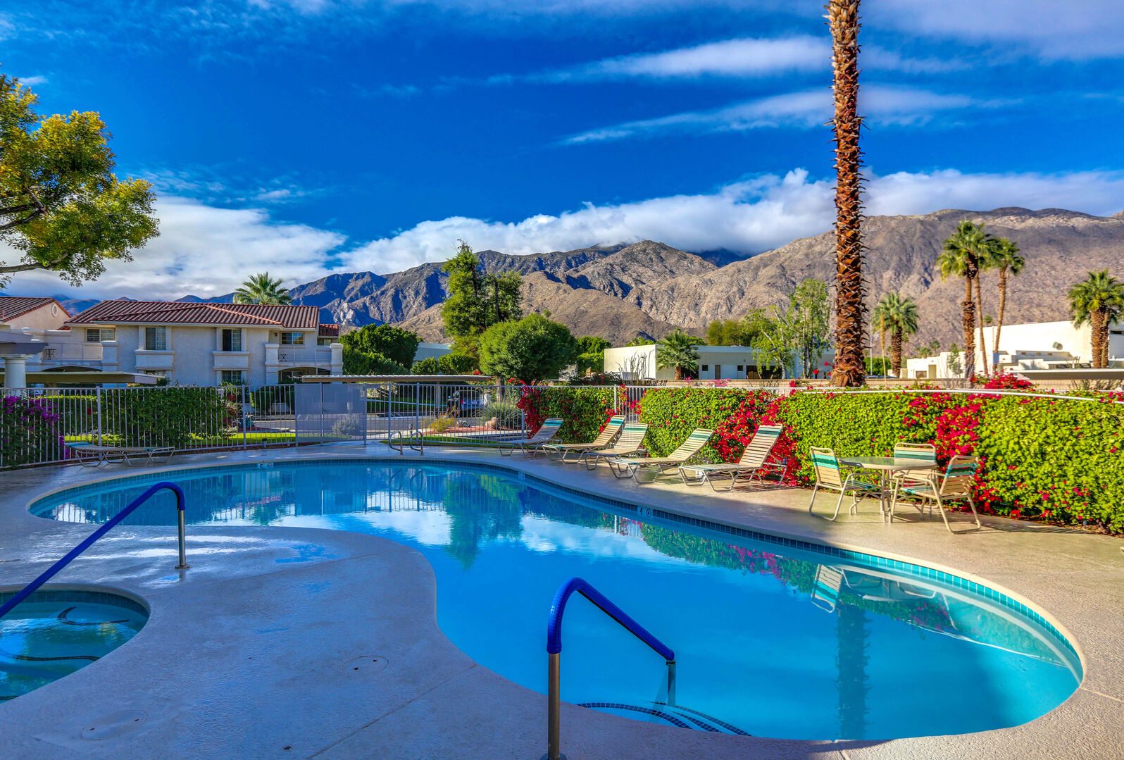 This fully renovated, Mesquite Phase III ground floor unit is now available for you to enjoy in central Palm Springs. The entire two bedroom, two bathroom unit is new from the studs out, and you'll appreciate the brand new furnishings and high-end amenities. This Mesquite Country Club condo is an end unit, located on the ground-floor and mere steps from one of the multiple community swimming pools and spas. Covered parking is just a few steps from the front door, yet the rear patio offers secluded serenity with no views of neighbors, or any reason for anyone to intrude on your privacy.The unique location within the community features lush landscaping and a grassy lawn, that feels like your very own. Did we mention the complete renovation of this beautiful retreat? Comfortable and Contemporary styling defines this open-concept floor,plan, and you'll appreciate the wall to wall tile flooring, brand new kitchen and bathroom cabinetry, brand new appliances, and brand new furniture. The U-shaped kitchen is well equipped with everything you'll need to prepare meals and entertain guests. All appliances are stainless steel and top-notch.The two bedrooms of this Palm Springs vacation condo are on separate sides of the home to allow for optimum privacy, and both offer direct access to their own unique patio space. The spacious master suite features a King bed, flat screen TV, dual vanities, walk in shower, and direct rear patio access. The second bedroom is located in the front of the condo and features a Queen bed, flat screen TV, and shared hallway bathroom, with walk in shower. There is no bathtub in this condo.Take advantage of Palm Springs Mesquite Country Club amenities, which include: 18 hole Championship golf course, 16 pools, 18 jacuzzis, pro shop, restaurant, cocktail lounge and club house. When you rent this Palm Springs condo, you'll have access to playing golf (reasonable greens fees apply) at Mesquite Country Club. This 2 bedroom vacation condo is just minutes from downtown Palm Springs, with wonderful restaurants, shops, and art galleries. Enjoy fantastic Palm Springs attractions nearby, like the Palm Springs Aerial Tram, Wet n Wild Water Park, Indian Canyons Preserve, golf and outlet mall shopping. Property DescriptionApproximately 1175 sq ftLocated in Palm Springs2 TVsPropane BBQCommunity Pool & JacuzziWasher and DryerWiFiLocal/Long Distant Phone Calls Children AllowedSmall Dog Allowed30 Night MinimumCity ID #4319TOT #4004Room ConfigurationMaster: King, Flat Screen TVGuest: Queen, Flat Screen TVBathroom ConfigurationMaster: En Suite ShowerGuest: ShowerAmenities
