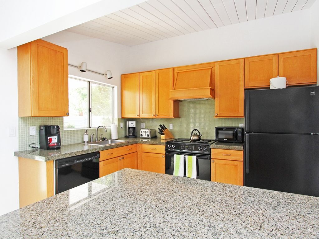 The kitchen of this Palm Springs mid-century modern vacation rental has been recently updated and is well equipped to prepare delicious meals and enjoy family and friends.