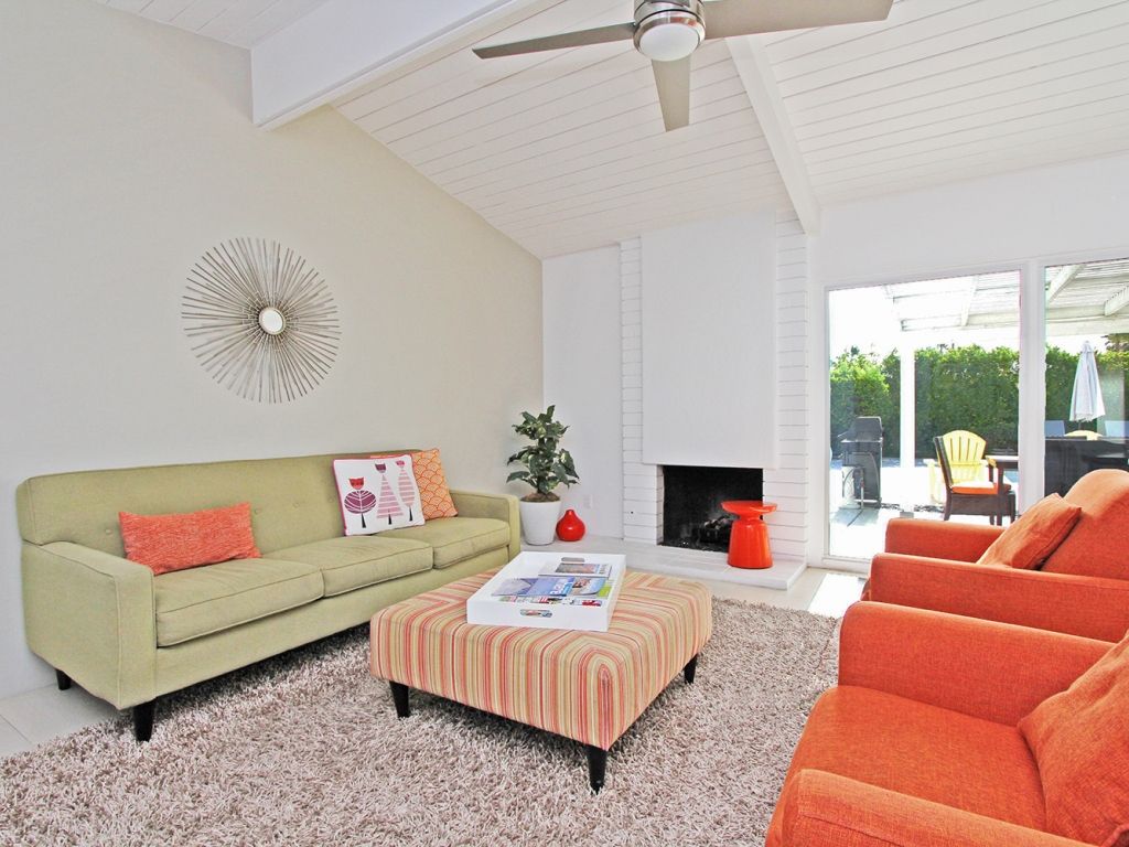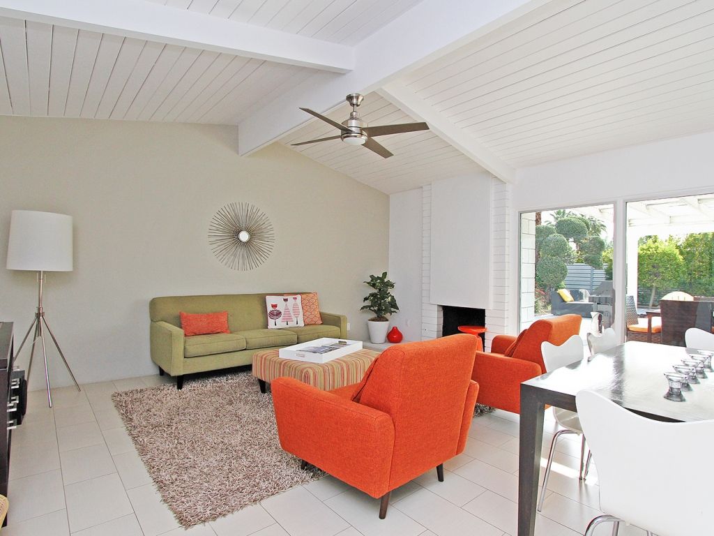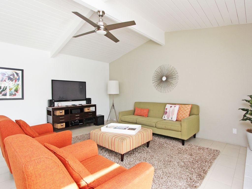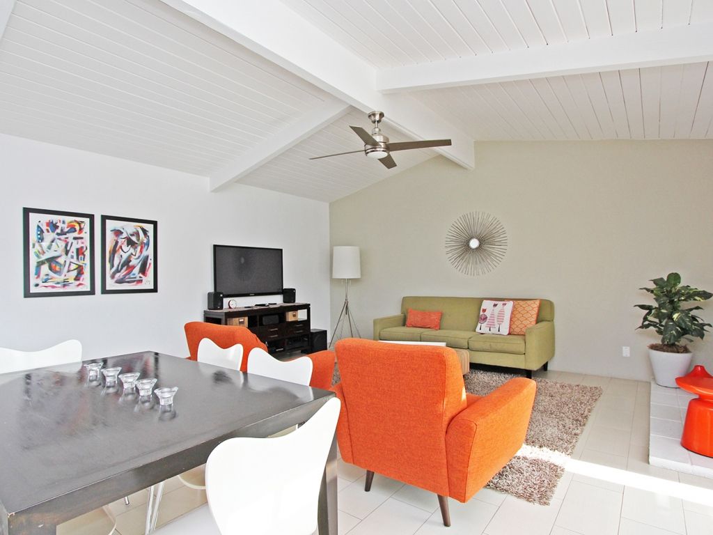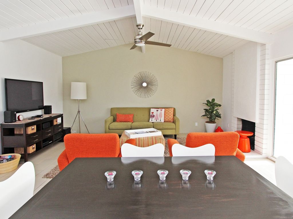 Inside, the living room opens up to the backyard through a large sliding glass door allowing you and your guests to fully enjoy the indoor/outdoor Palm Springs lifestyle. You'll find midcentury inspired modern finishes, a 50"" Plasma TV, with Apple TV, and stereo. The living room and kitchen is open to the dining room, with seating for 6.