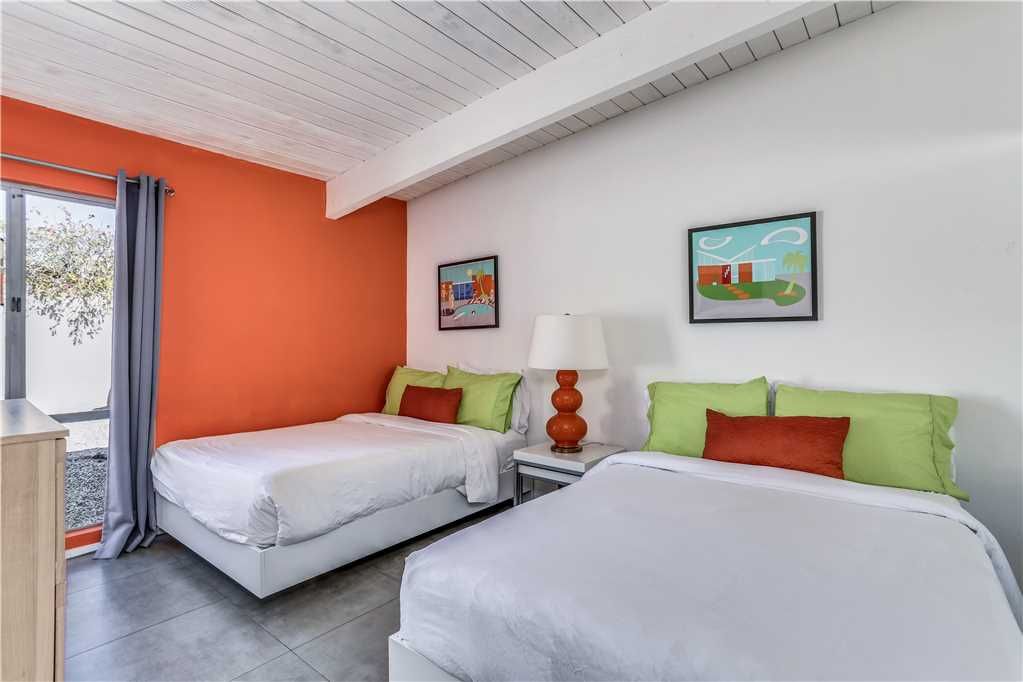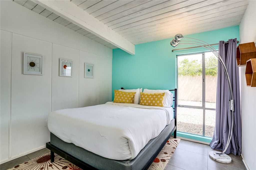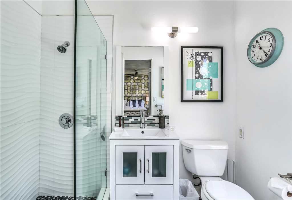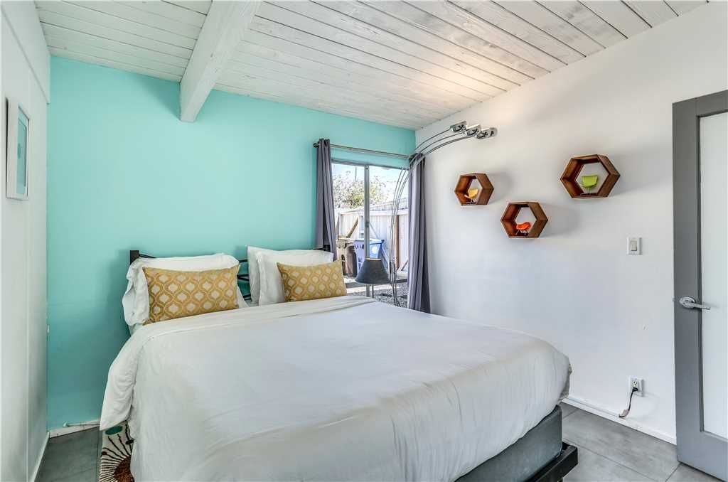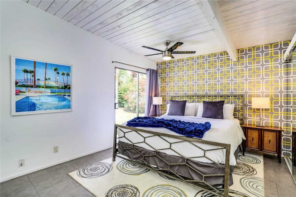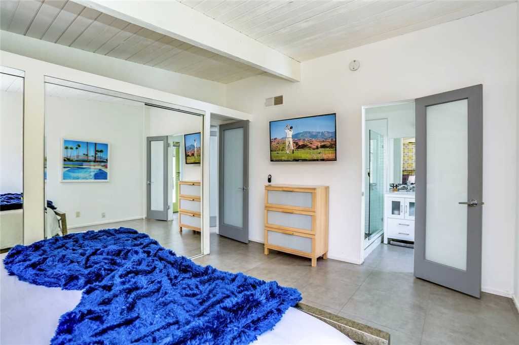 The home’s retro vibe continues in the stylish master bedroom, complete with a California king bed, double-door closet, and 46” wall-mounted TV. The en-suite master bathroom has a glass door walk-in shower.