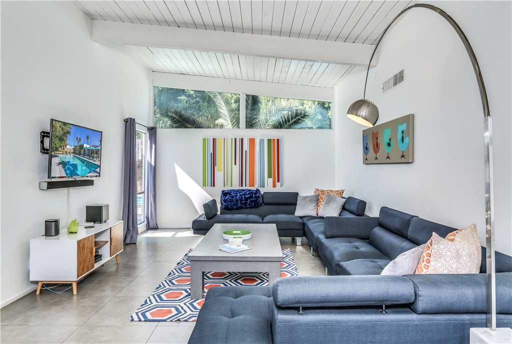 Mid-century modern design is showcased in the light-filled living space, featuring fun artwork and a breezy whitewashed wood ceiling. Settle in on the comfy sectional, set before a 40” wall-mounted TV with a soundbar.
