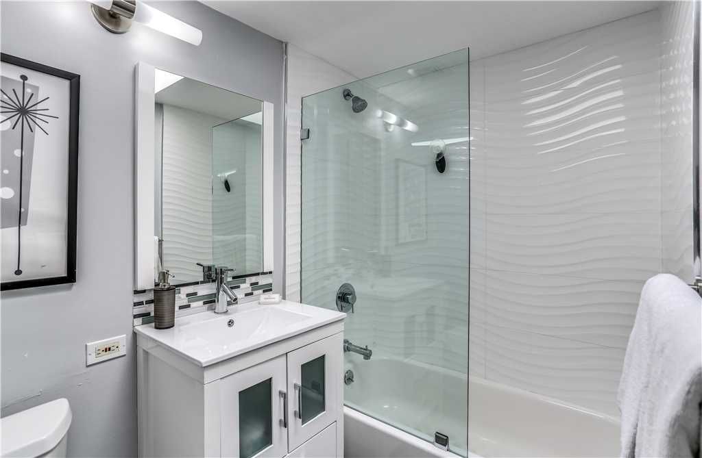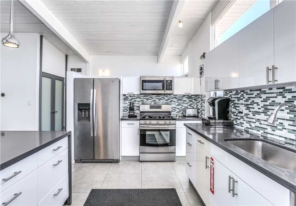 Natural light pours into the contemporary living space, while the updated kitchen and bathrooms gleam with Caesarstone countertops and stainless steel appliances.