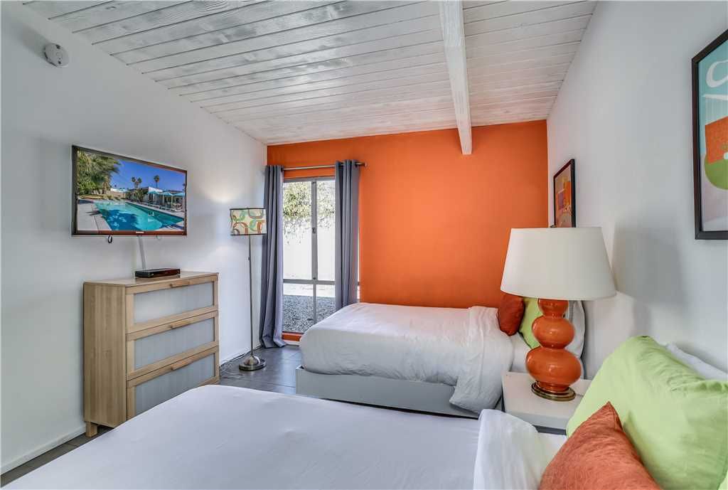 A second bedroom has vibrant orange décor, two full-size beds, a 40" wall-mounted TV, and a double-door closet.
