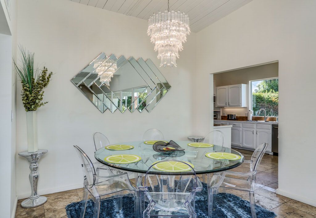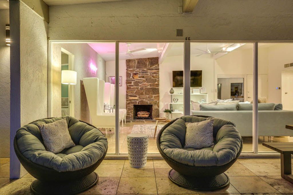 The living room features a wall of glass with plenty of seating with a 75 inch Smart HDTV with surround sound, comfortable modern sofas and modern glass fireplace. The dining room can seat eight comfortably and outside patio dining can accommodate eight as well for el fresco dining outdoors in the warm desert evenings.