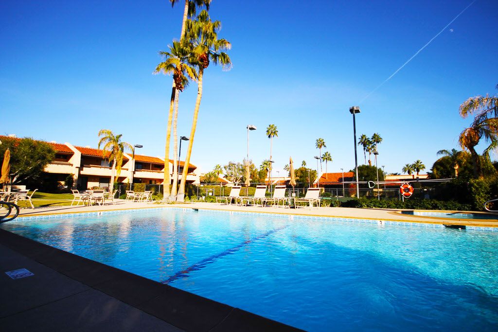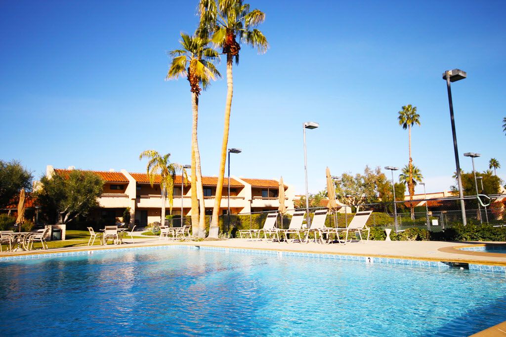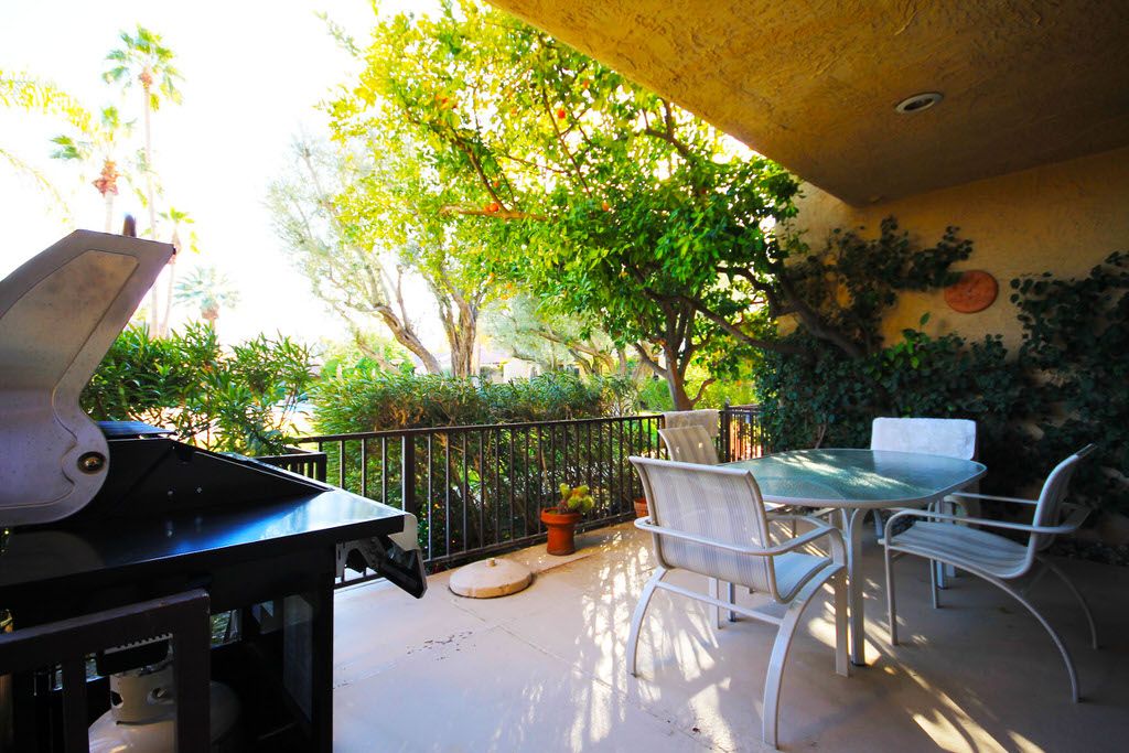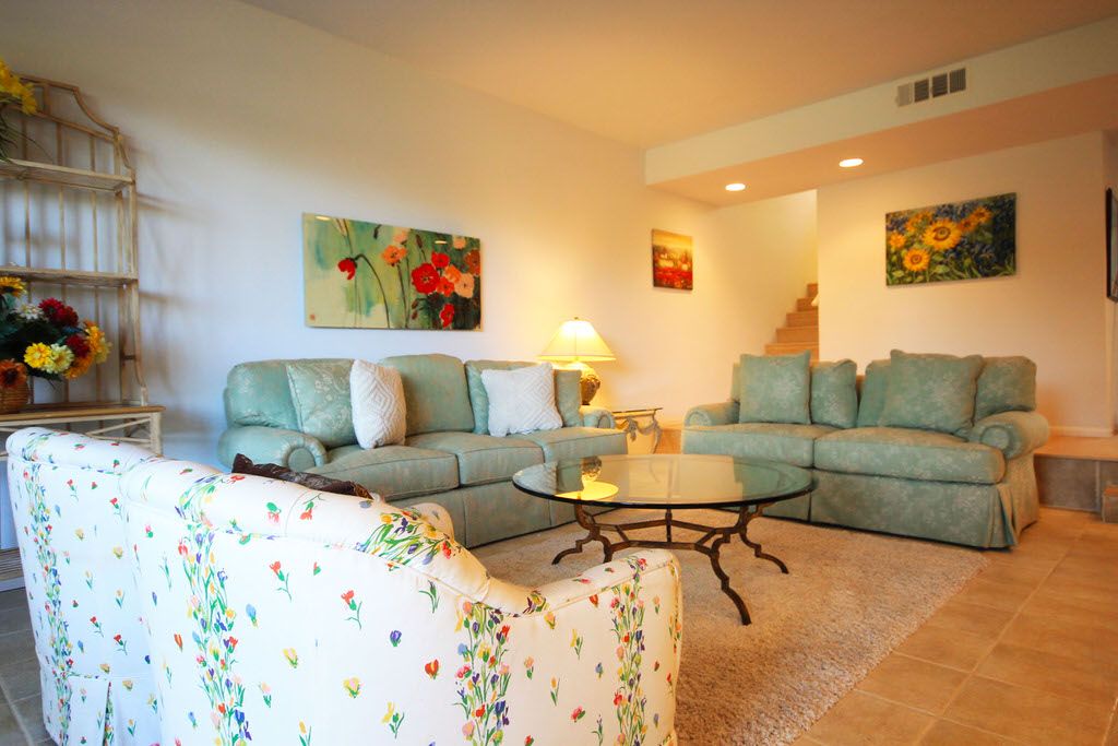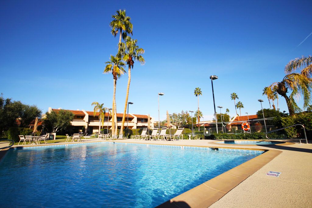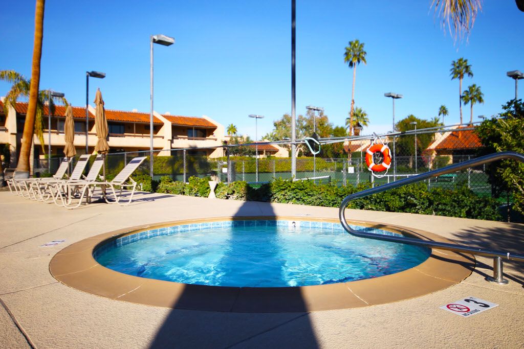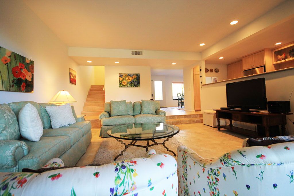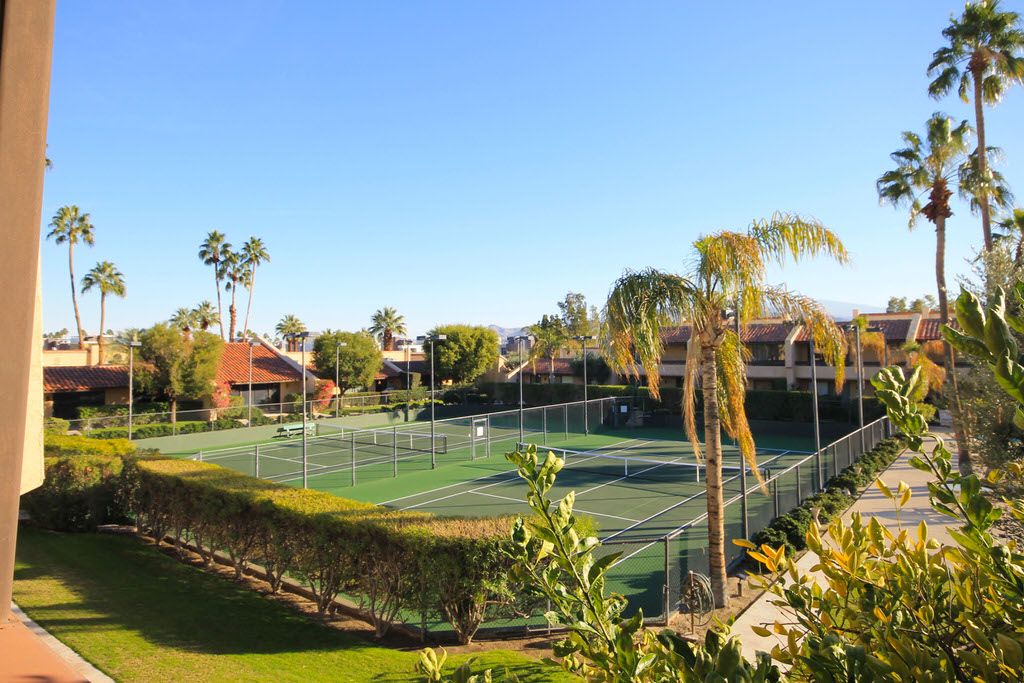 This Two bedroom townhouse style Vacation Villa features two tennis courts and a resort style swimming pool and spa inside a Low density and beautifully landscaped private community. This unique villa also features THREE patios. One on the lower level where you can just walk toward the swimming pool and the tennis courts, and both suites upstairs have its own private patio as well. All of these patios have the view of the beautiful San Jacinto Mountains.