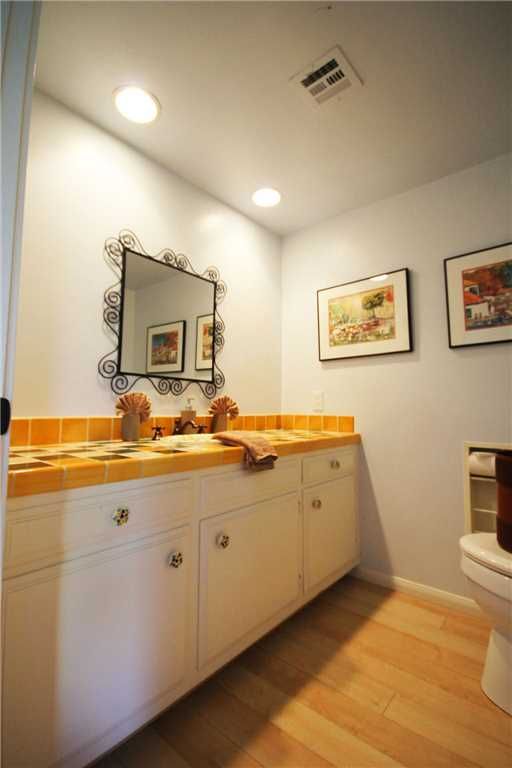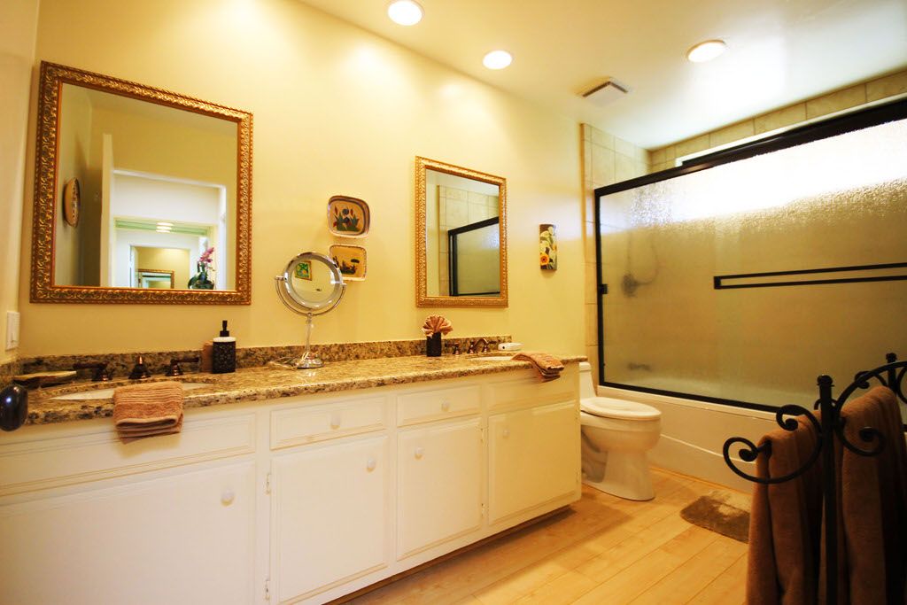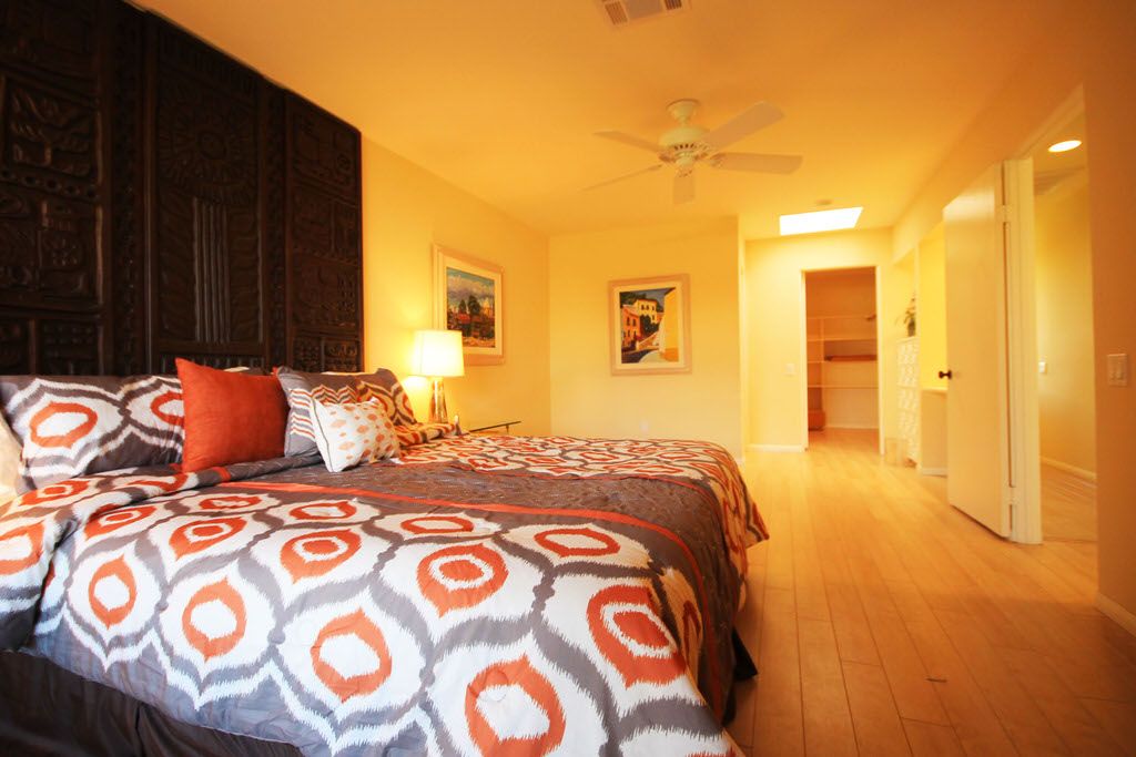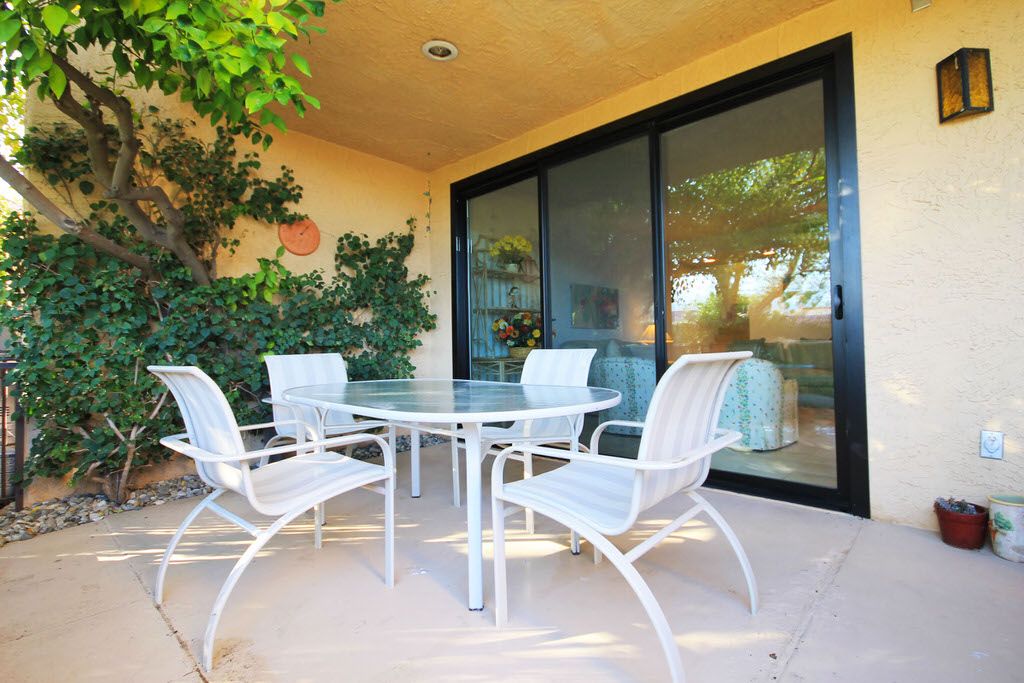 The upper floor consists of 2 suites. The master suite has plenty of room to spread out with a King size bed, super large walk-in closet, and comfortable bedding for a great night sleep after a day of play in the desert. Or perhaps just lie down and enjoy watching a little television before you doze off, as there's a flat screen TV inside the bedroom. The master suite also offers an attached bathroom with a shower/tub combo, and all the linens and towels for your use while on vacation. You might want to step outside from your bedroom and just walk out to the private patio in the evening. Have a seat; enjoy the beautiful stars sparkler in the desert sky.