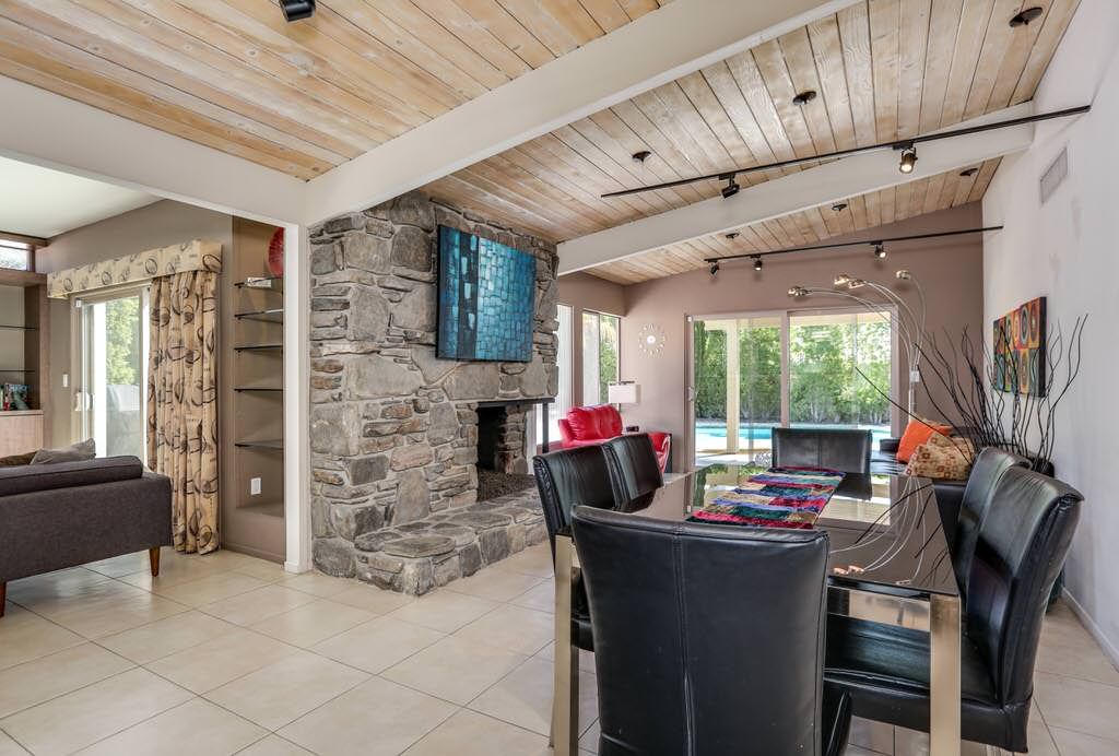 The living room and dining room share an open layout and a striking floor-to-ceiling natural stone fireplace complete with a furry rug, great for romantic evenings. The living room offers comfortable sofa seating and direct access to the pool through sliding glass doors.