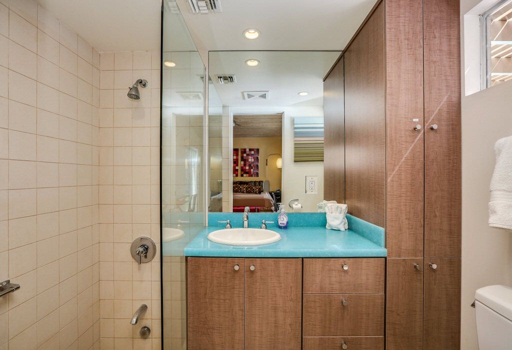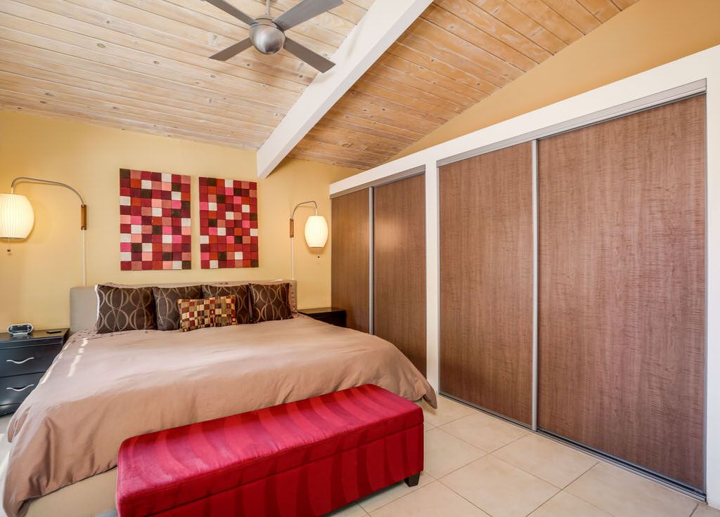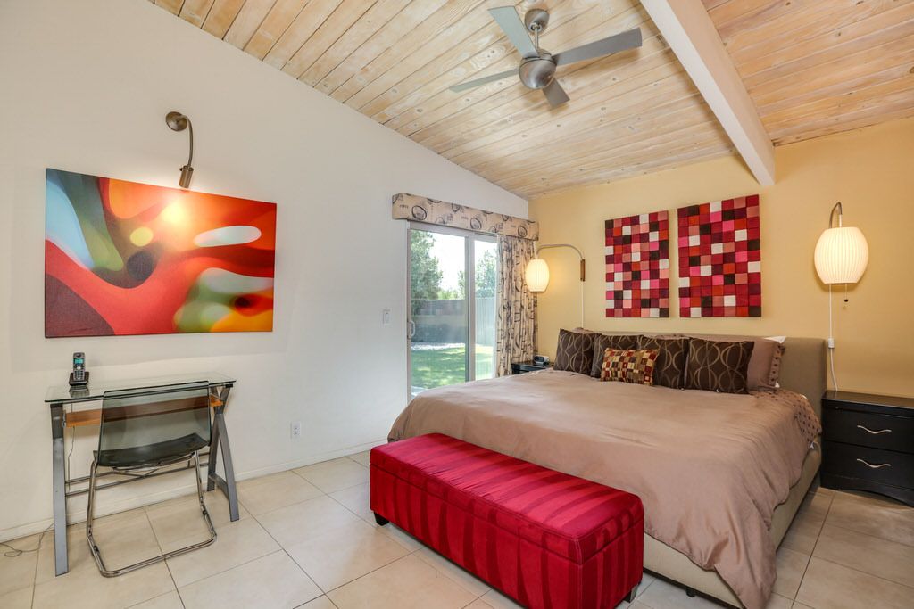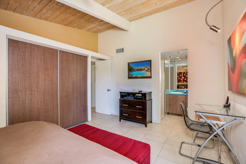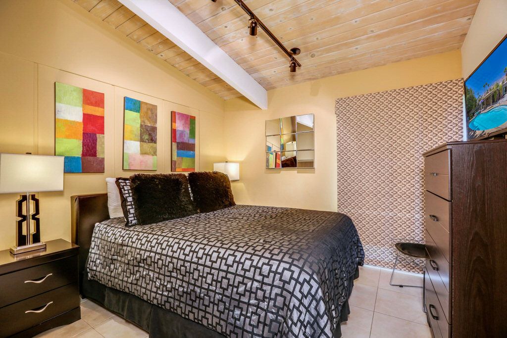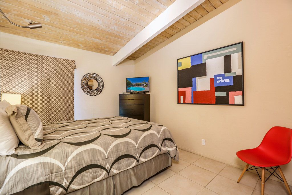 The master bedroom in this midcentury modern vacation rental is spacious and offers direct access to the backyard, abundant closet space, a king size bed, 32"" TV with blu-Ray player, and an en-suite bathroom with step-down shower.