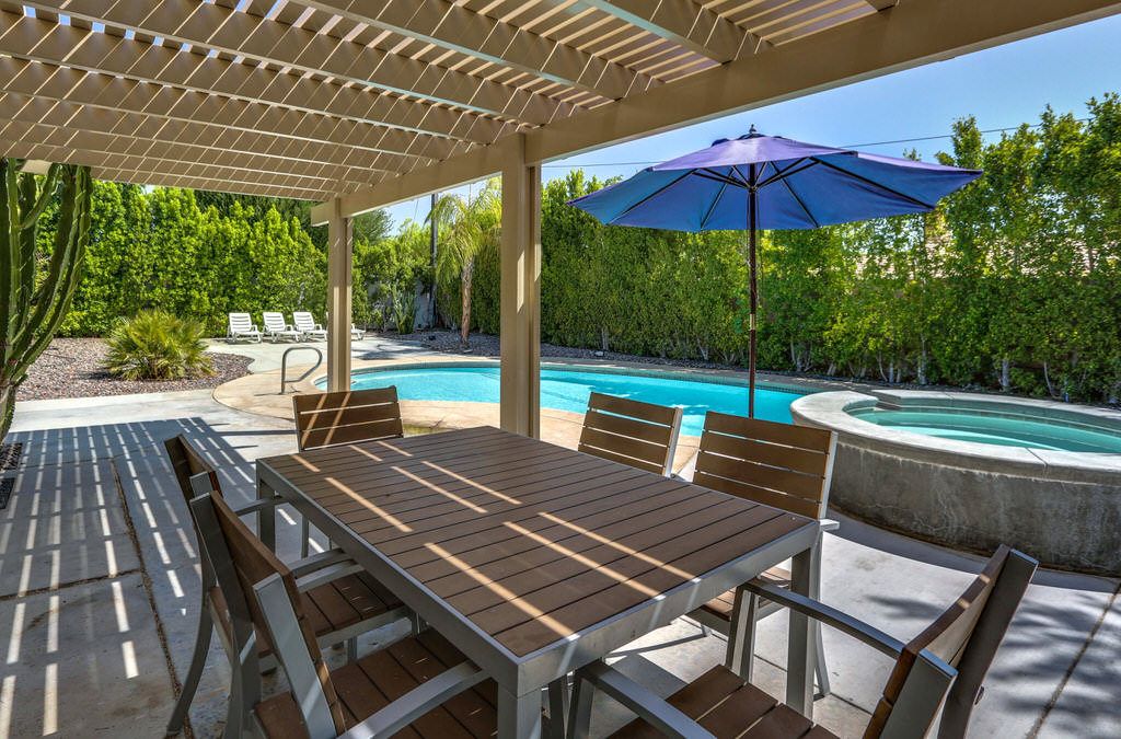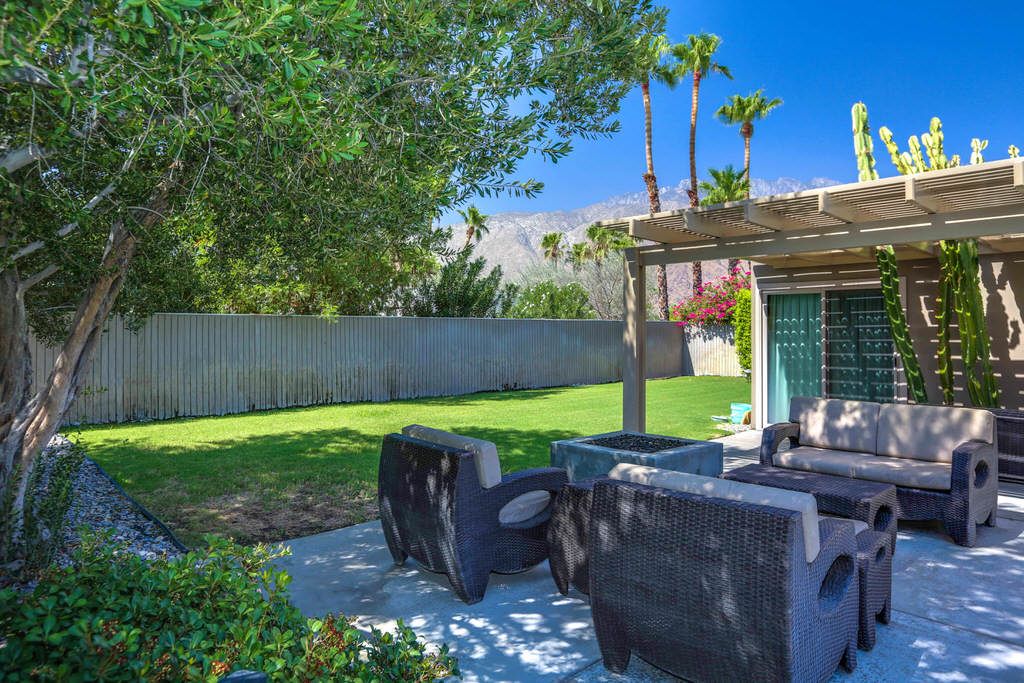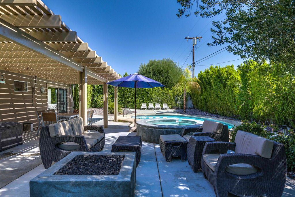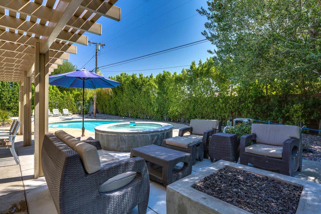 Discover this midcentury Palm Springs vacation rental's gorgeous outdoor living space complete with sparkling saline swimming pool and spa, outdoor gas fire pit, breathtaking mountain views, plush outdoor seating under a shady pergola, and lush green lawn, perfect for a friendly game of croquet.