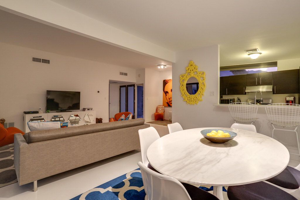 The open great room features a wall of glass and two glass sliders that open to the private pool and spa. A 50‹¨« LCD TV with High Definition Cable TV and a DVD player is available for catching up on the news or watching your favorite movie at your leisure. Cool modern furnishings provides for an inviting and relaxing space overlooking the pool.