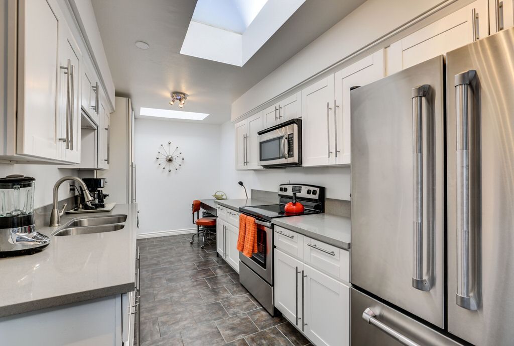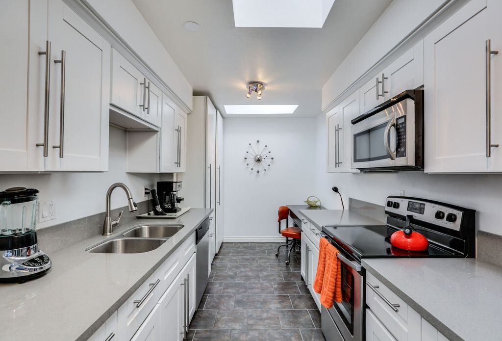 The kitchen in this modern South Palm Springs vacation villa is a chef's delight, with lots of Quartz Counter tops and Custom tile prep space, high end stainless steel appliances, gas range, and all the tools and utensils you'll need to prepare meals for friends and family.