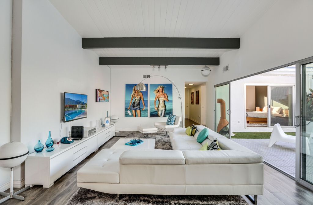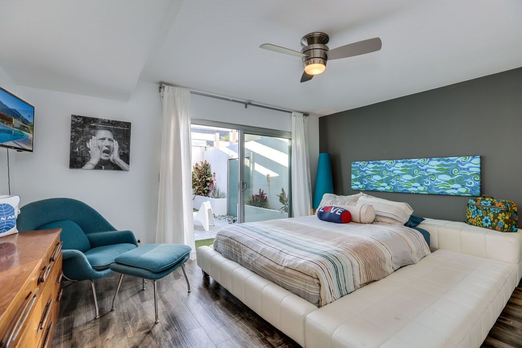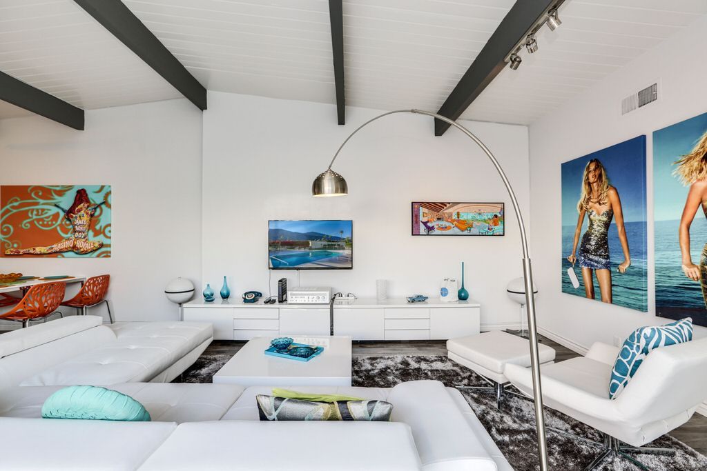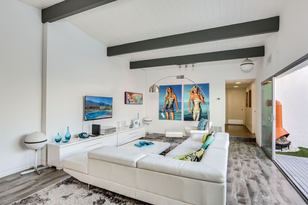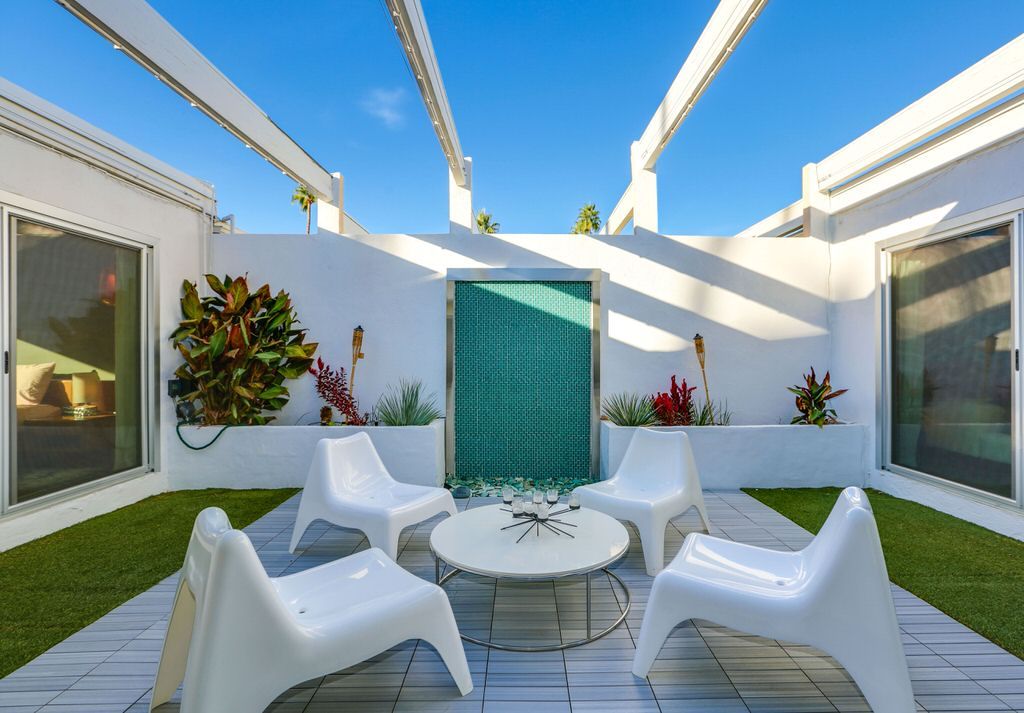 Modern Palo Fierro Villa in South Palm Springs has been completely upgraded and features a private courtyard with a water wall, misting system, floating interior private patio and no water turf. This Modern vacation villa has an open floor plan, high ceilings, recessed lighting, Sunken Living Room and hardwood floors in the living room.