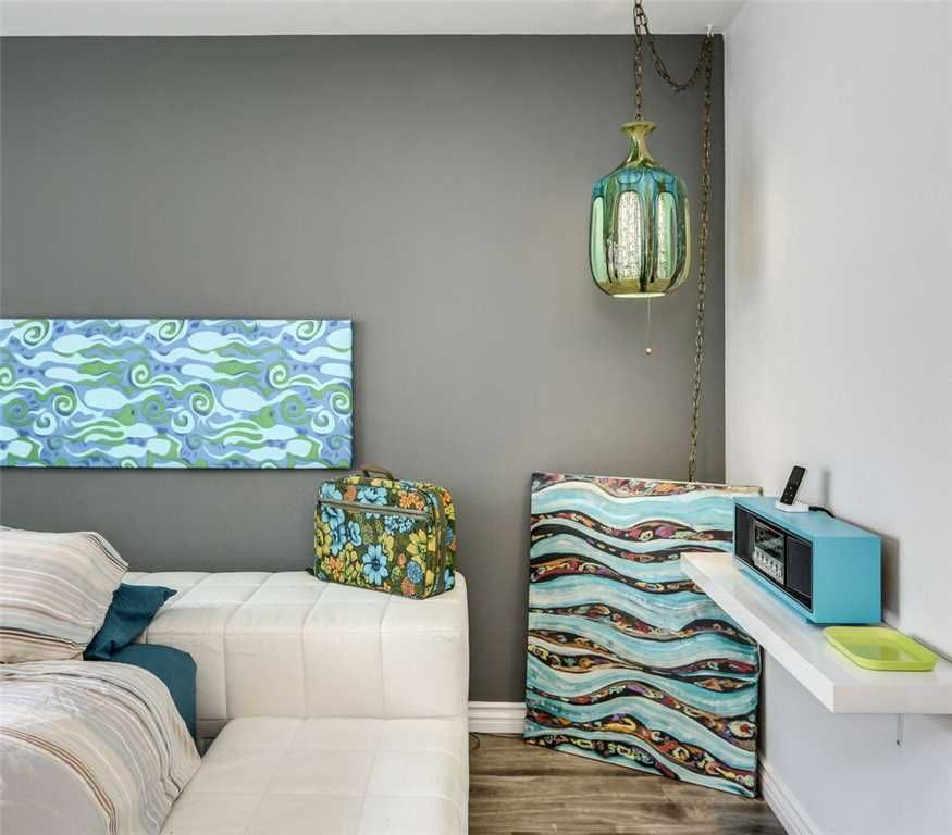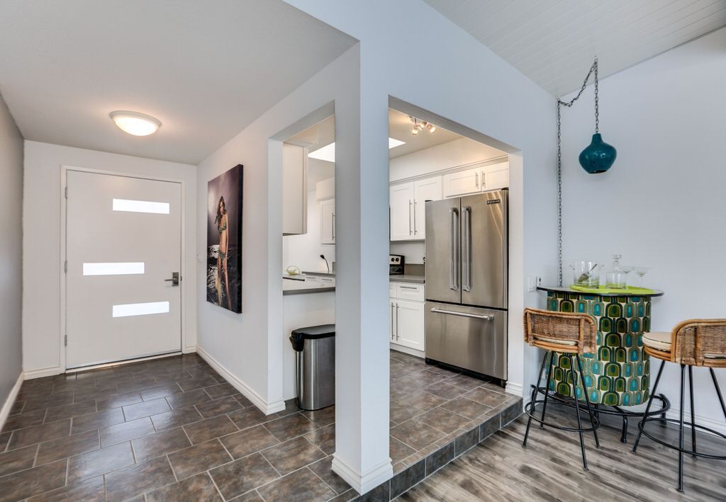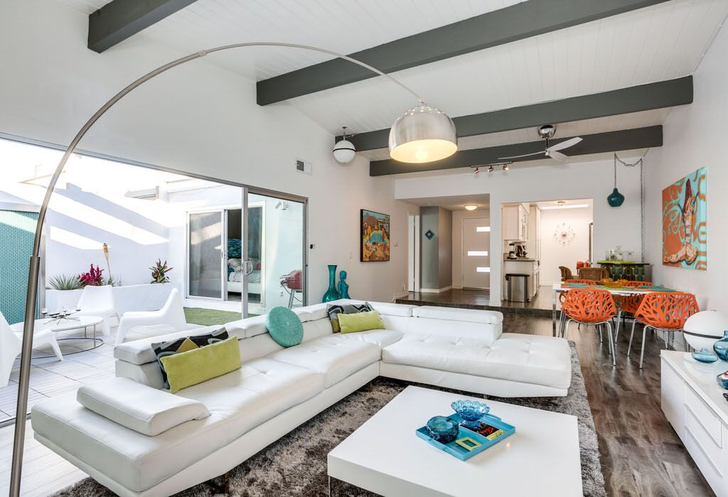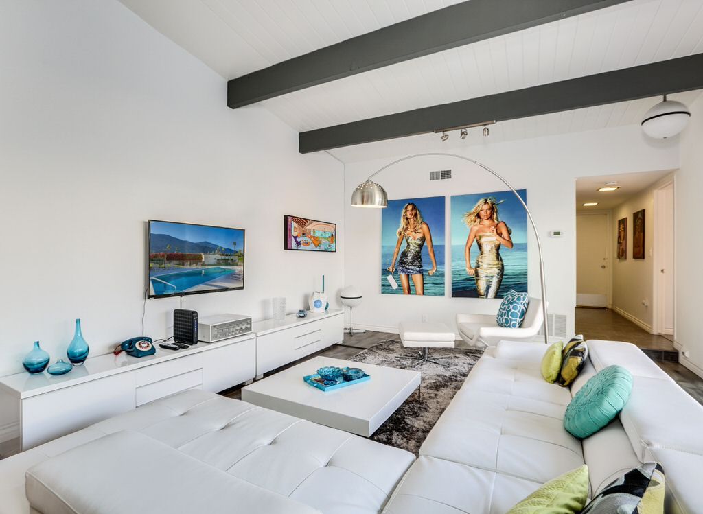 Modern Palo Fierro Villa in South Palm Springs has been completely upgraded and features a private courtyard with a water wall, misting system, floating interior private patio and no water turf. This Modern vacation villa has an open floor plan, high ceilings, recessed lighting, Sunken Living Room and hardwood floors in the living room.