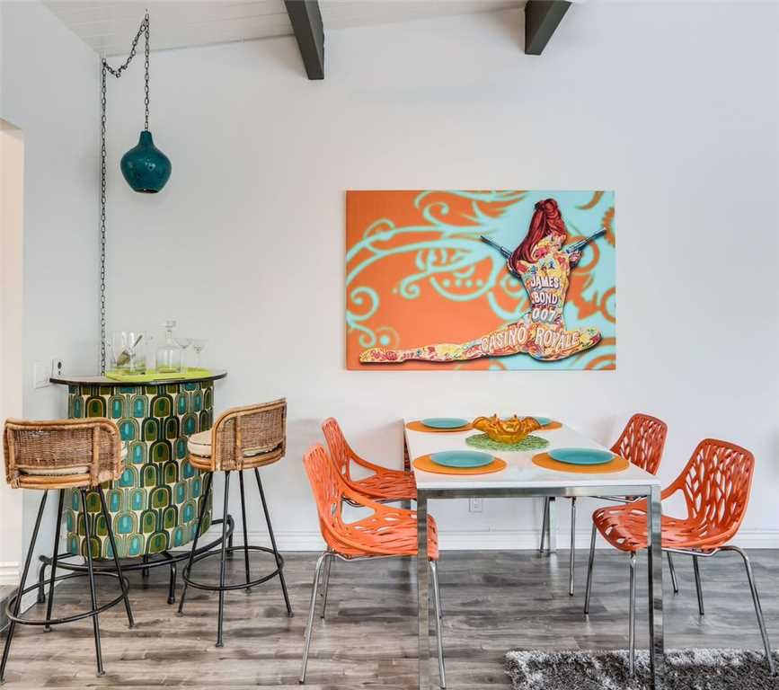 A Large sliding glass door lets the sun shine into the main living area is and give this modern vacation villa in South Palm Springs a light and bright feel. The dining area just a few steps away from the kitchen where you can wine and dine with your friends. A small dry bar is setup on the side for your entertainment delight.