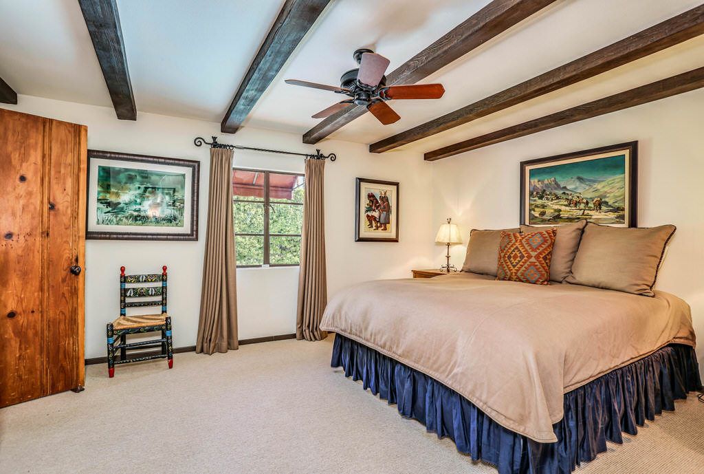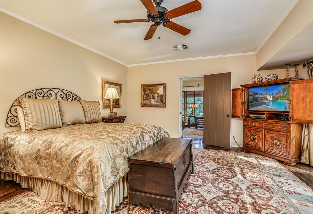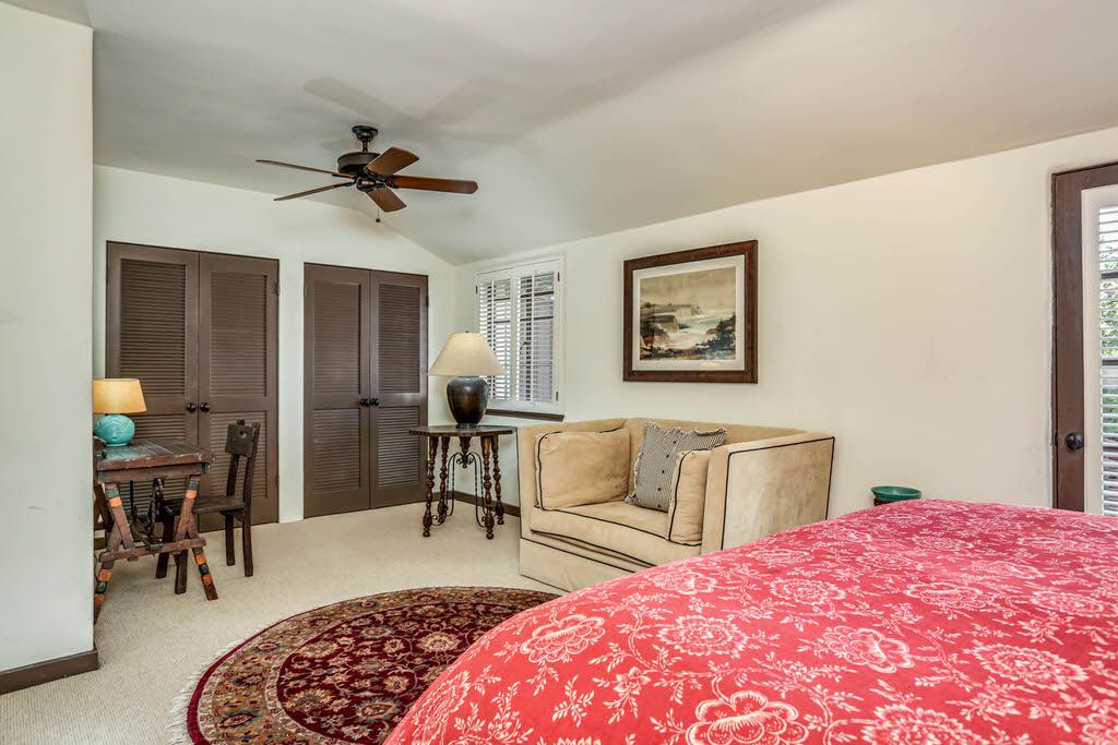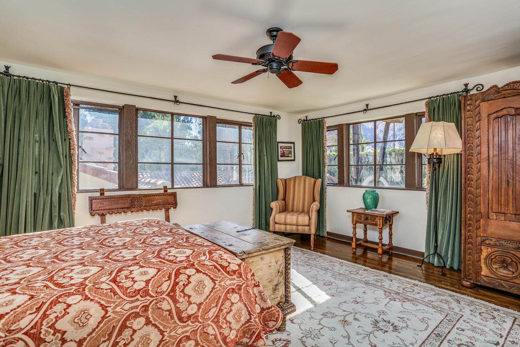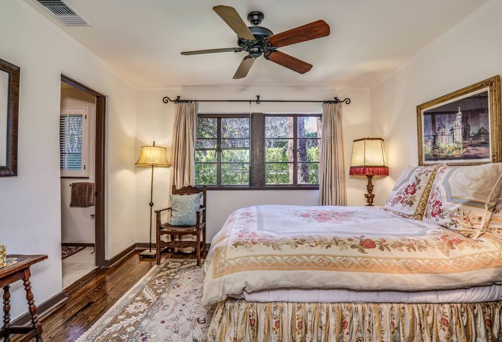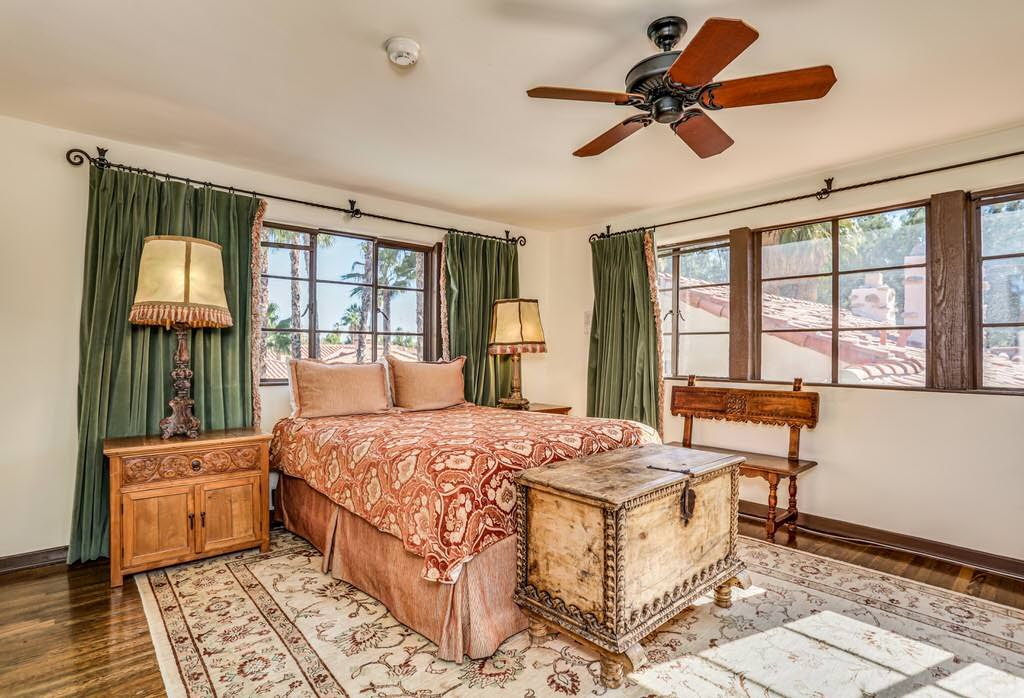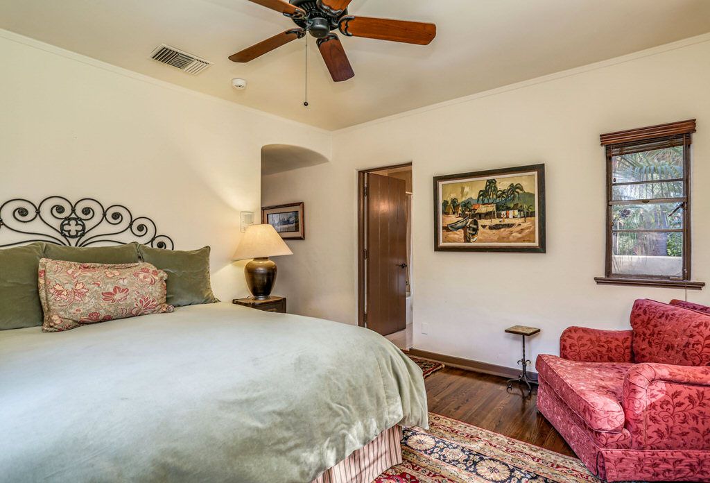 Just off the kitchen on the east wing of this Palm Springs Spanish Revival estate for rent is the fourth bedroom known as the chauffeur room. A gracious king bed, a private en-suite bathroom and a private entrance makes this a great room for friends and family.