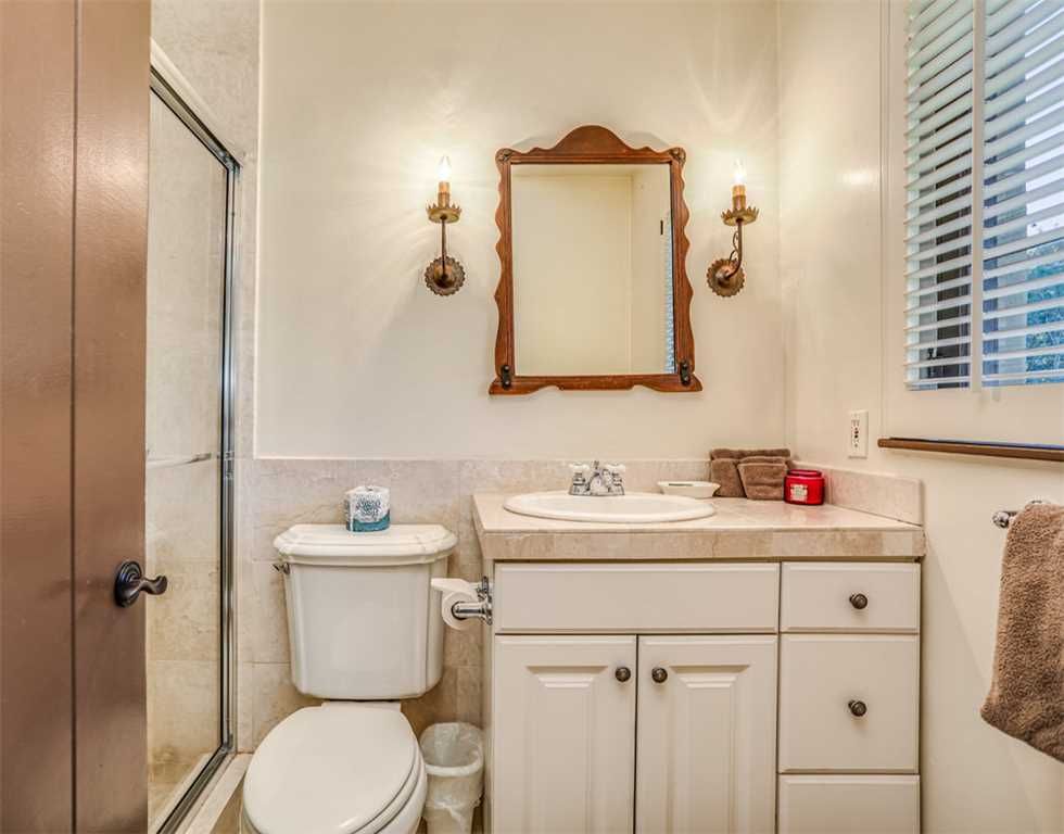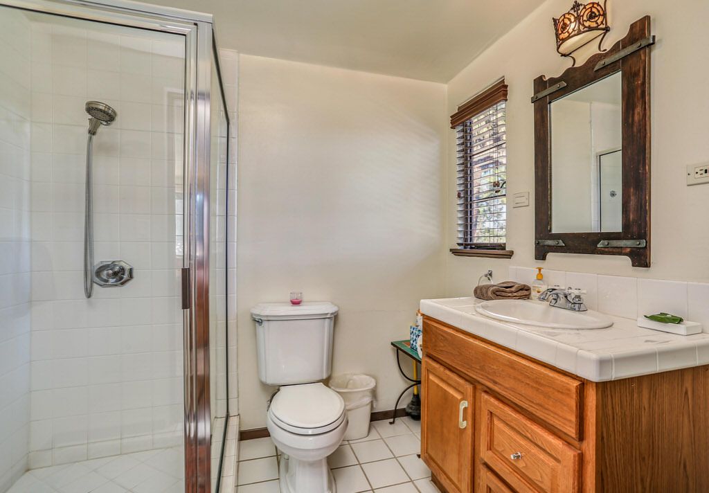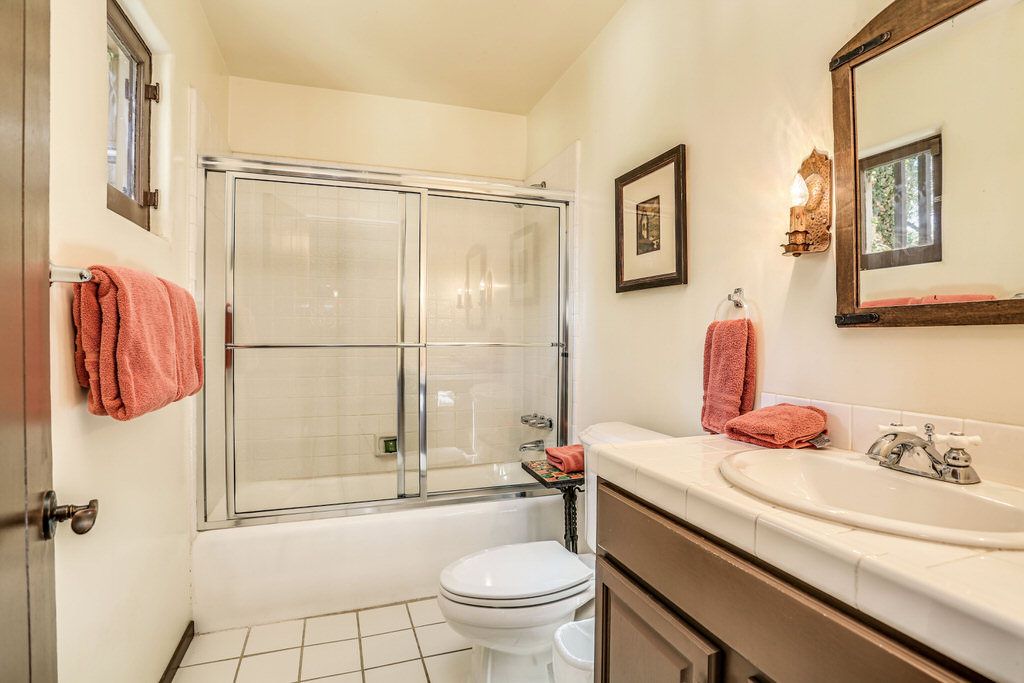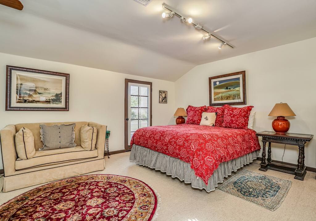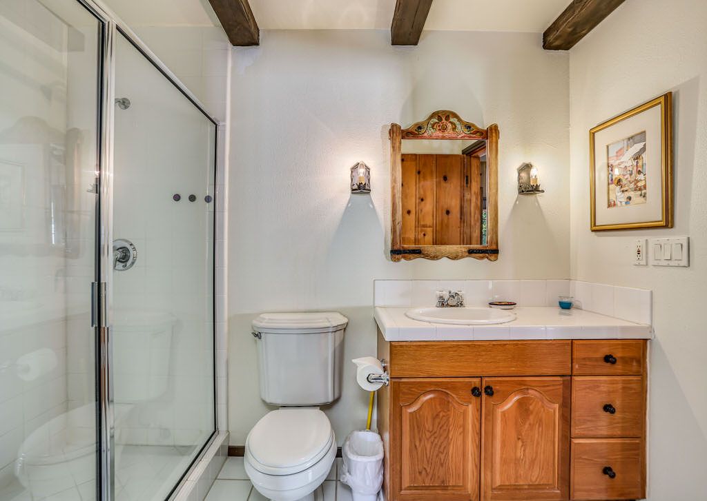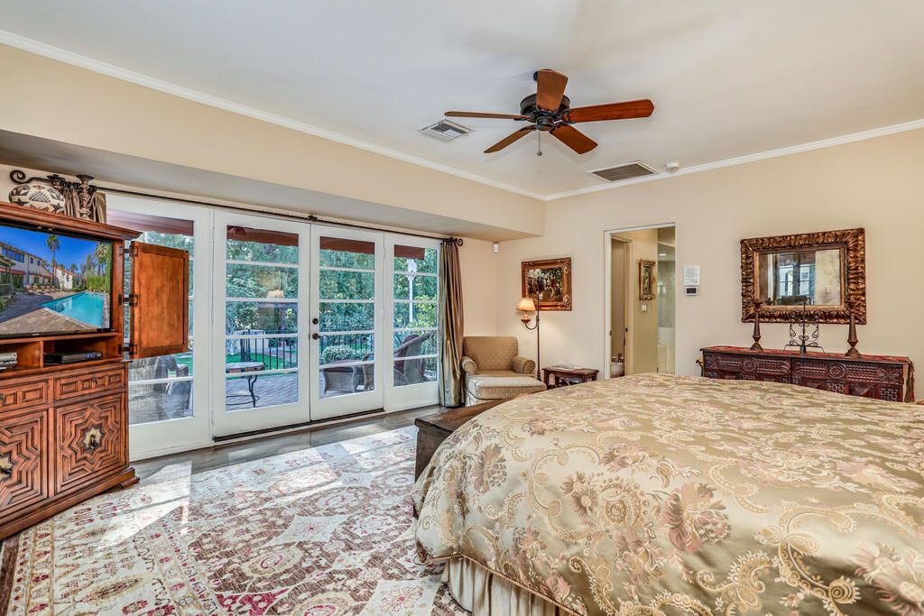 Just off the kitchen on the east wing of this Palm Springs Spanish Revival estate for rent is the fourth bedroom known as the chauffeur room. A gracious king bed, a private en-suite bathroom and a private entrance makes this a great room for friends and family.