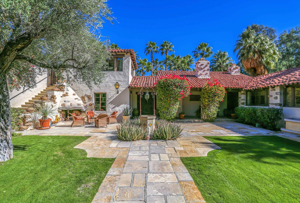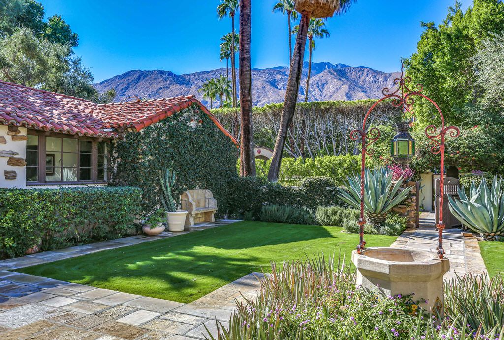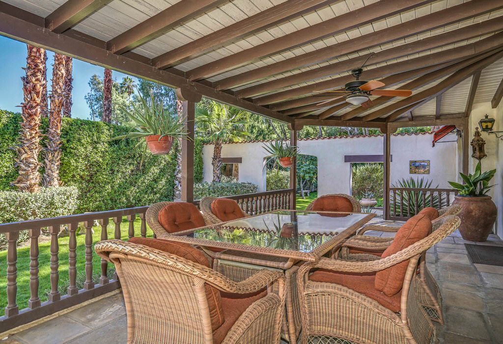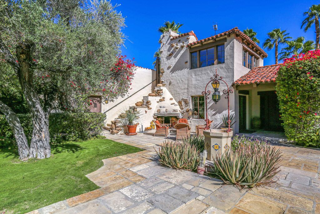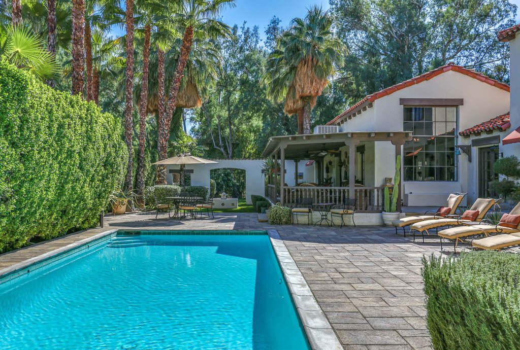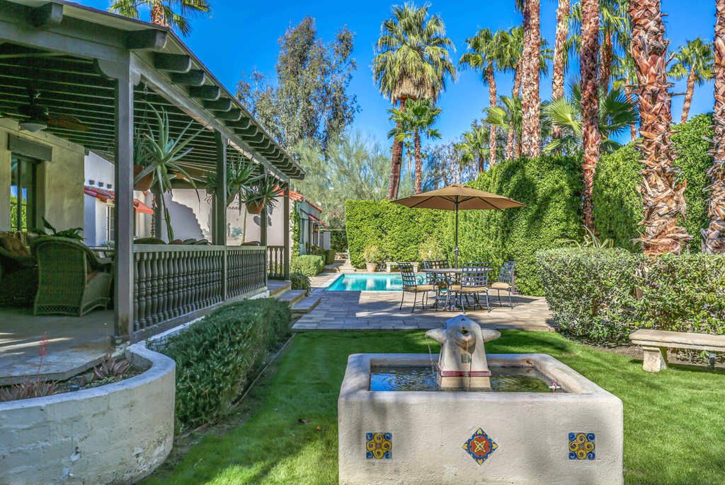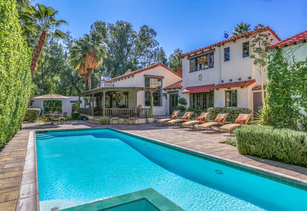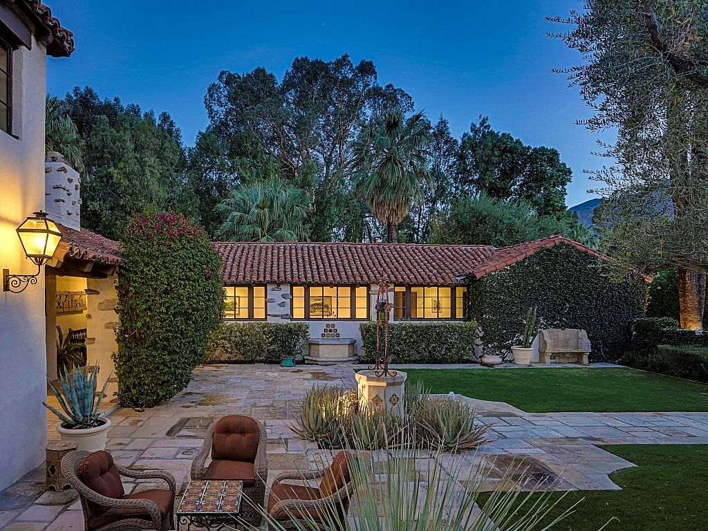 This Palm Springs Spanish Revival estate features a beautiful positioned pool and spa, and wonderful covered outdoor dining areas surrounded by lush landscaping and majestic mountain views.