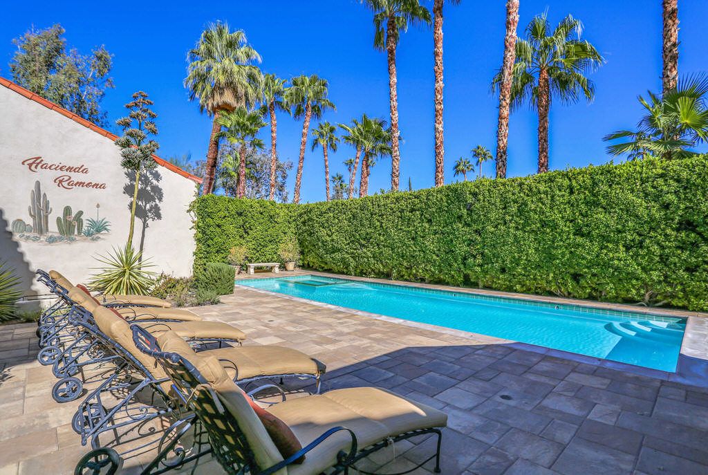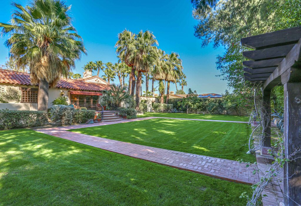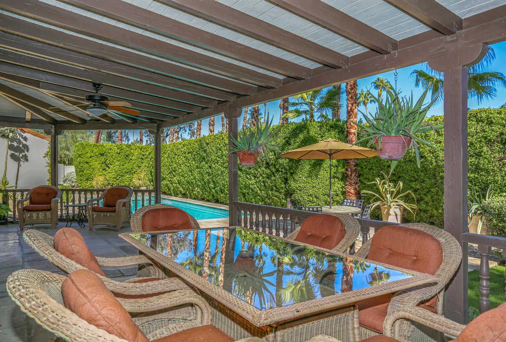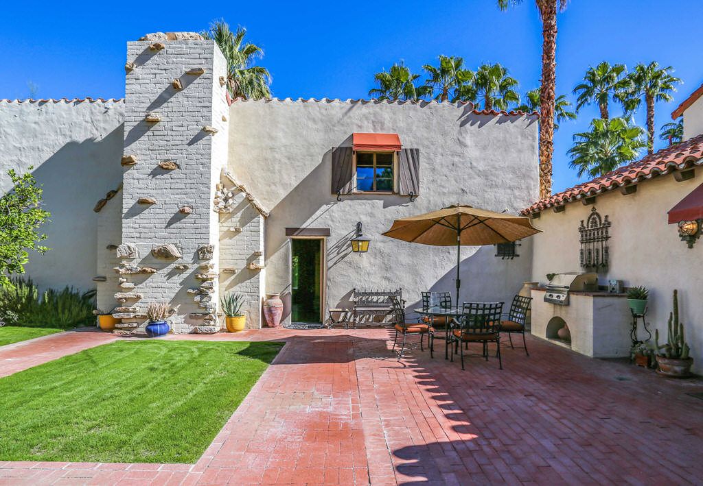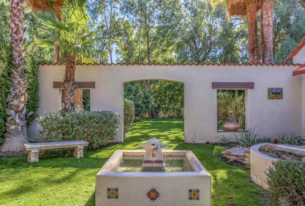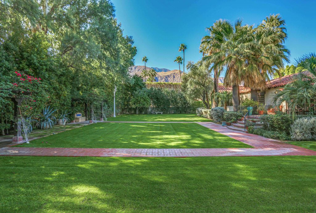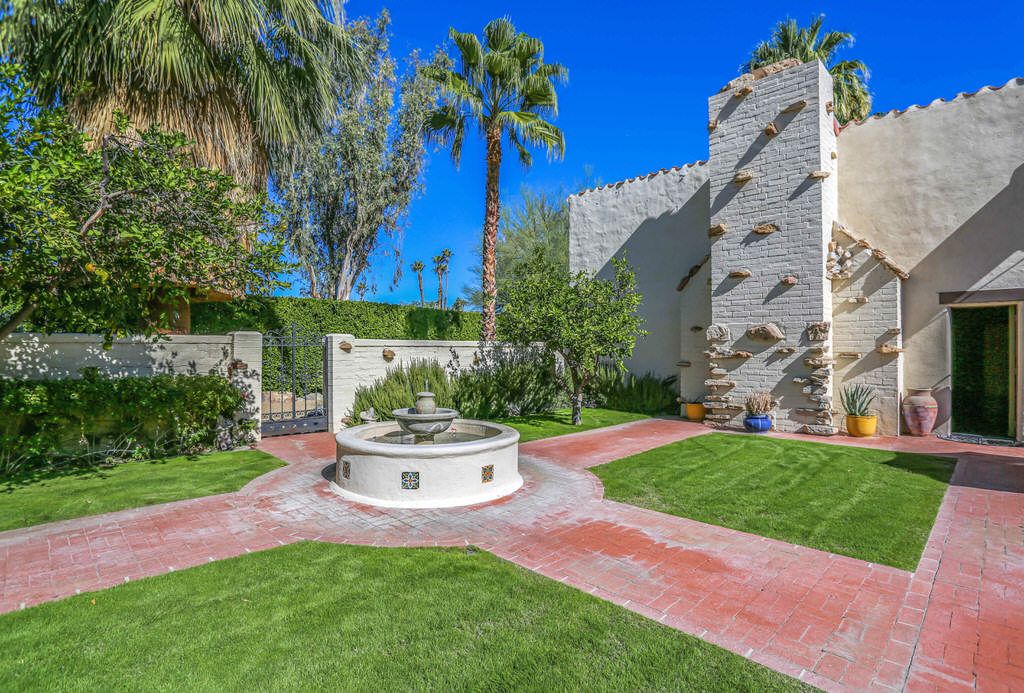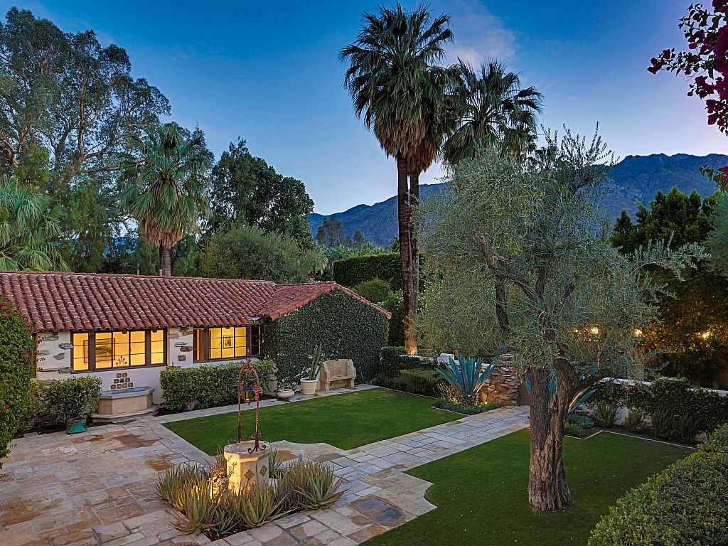 This Palm Springs Spanish Revival estate features a beautiful positioned pool and spa, and wonderful covered outdoor dining areas surrounded by lush landscaping and majestic mountain views.