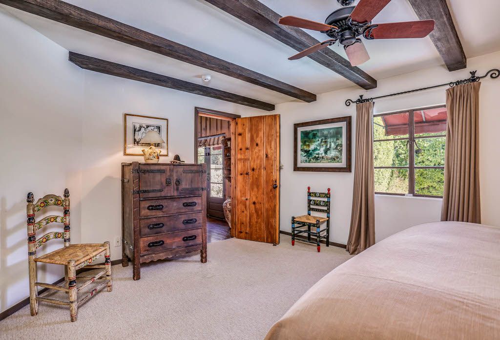 Located on the second floor of this Palm Springs Spanish style vacation rental is a private suite with its own exterior access and gorgeous views of the surrounding Palm Springs mountains. This room is also true to its time with authentic Spanish Colonial furniture and artwork. This room is known as the Sky room.