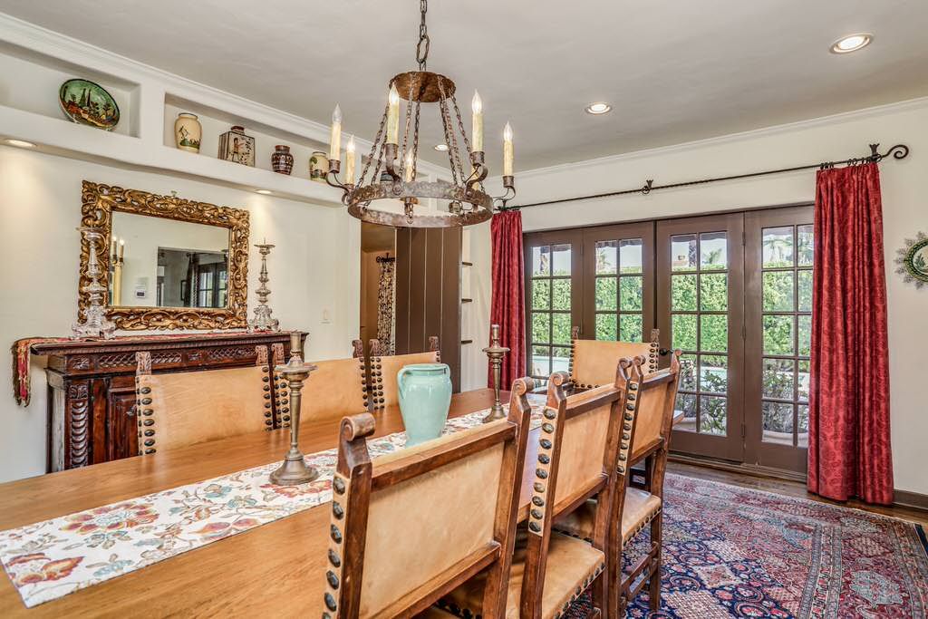 The Spanish style dining room in this Palm Springs vacation rental seats six and is adorned with Spanish inspired elements, from the antique Mexican pottery to the colorful paintings.